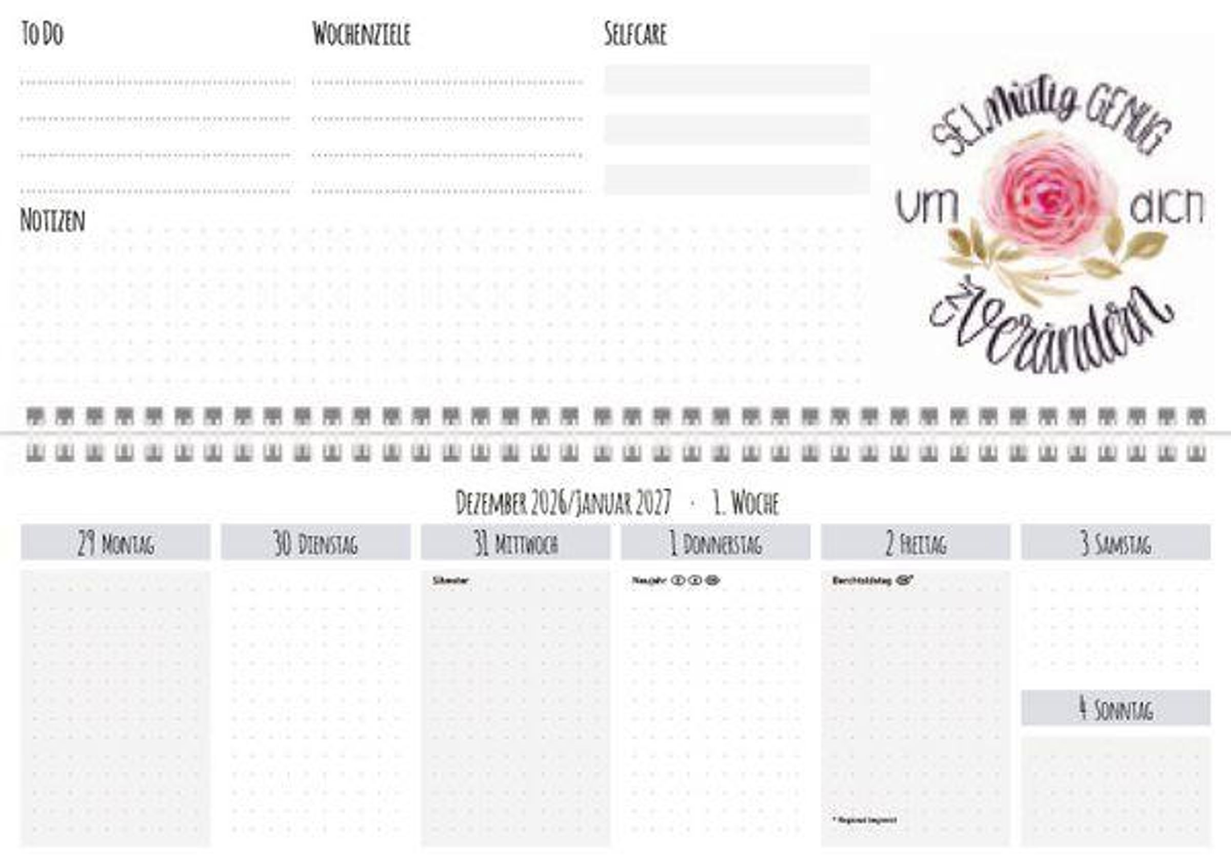 - Jede Woche auf einer Doppelseite mit Listen für wöchentliche To-dos und Prioritäten sowie Raum für Notizen und spontane Ideen