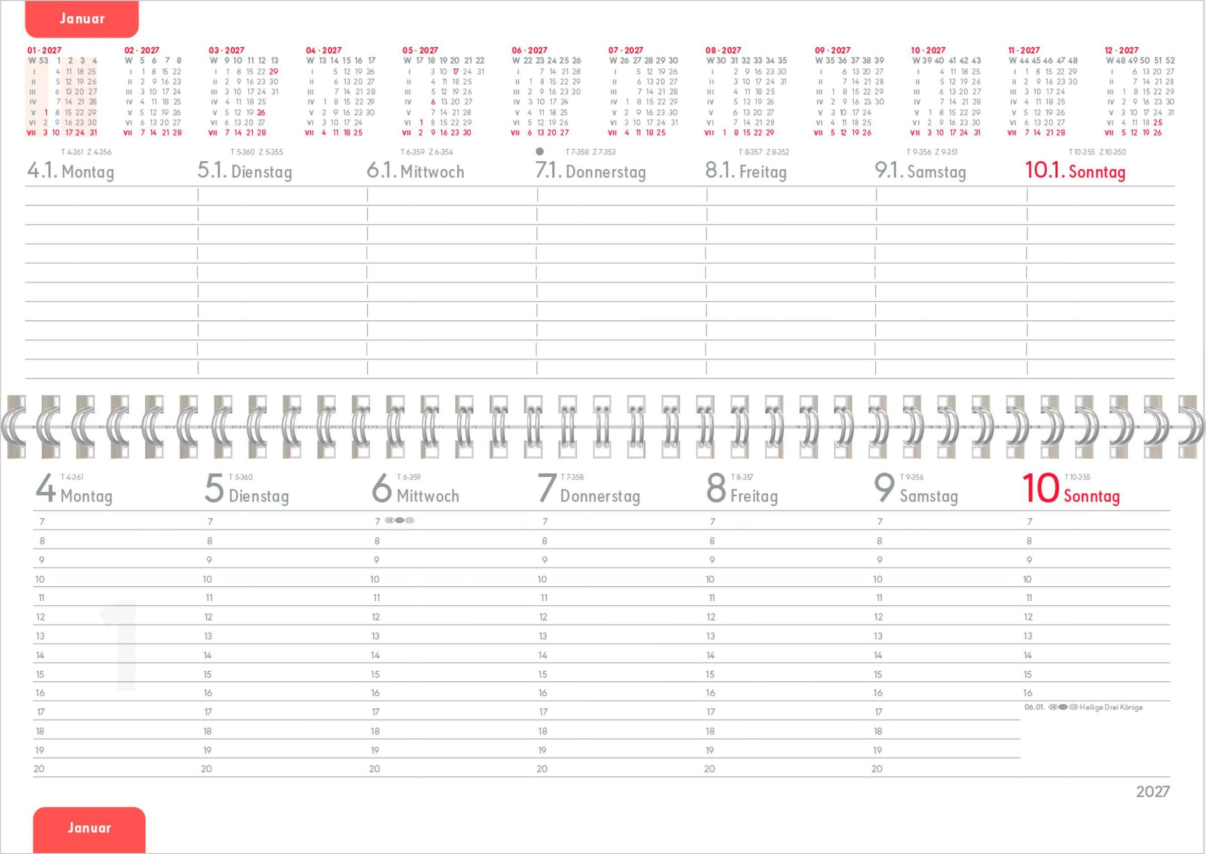 Übersichtliches Wochenlayout: 1 Woche auf 1 Doppelseite -- oben viel Platz für Notizen plus komplette Jahresübersicht, unten Zeiteinteilung von 8--21 Uhr für konkrete Termine