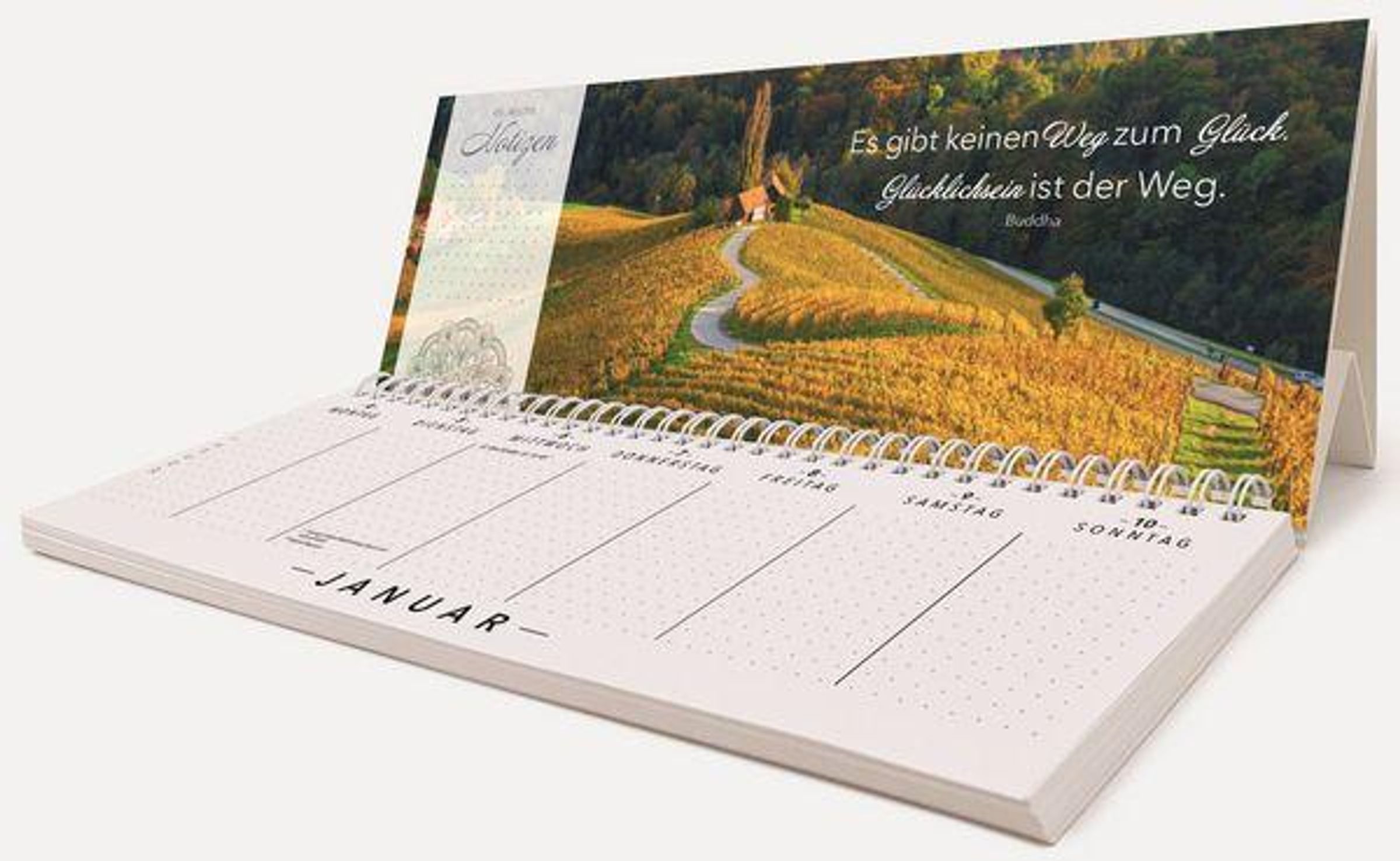 Dieser Planer ist der perfekte Begleiter für dein Jahr. Mit dem dekorativen Aufsteller werden die liebevoll gestalteten Motive und Sprüche zu einem Blickfang auf deinem Schreibtisch. Der Kalender bietet jede Woche viel Platz für deine täglichen Termine und Notizen. Dabei kommt er überhaupt nicht kleinkariert daher, sondern im trendigen dotted Design und bietet dir somit individuelle Gestaltungsfreiheit bei deiner Planung. Traumhafte Aufnahmen kombiniert mit Sprüchen und Zitaten bringen Lebensfreude und Inspiration auf deinen Schreibtisch.