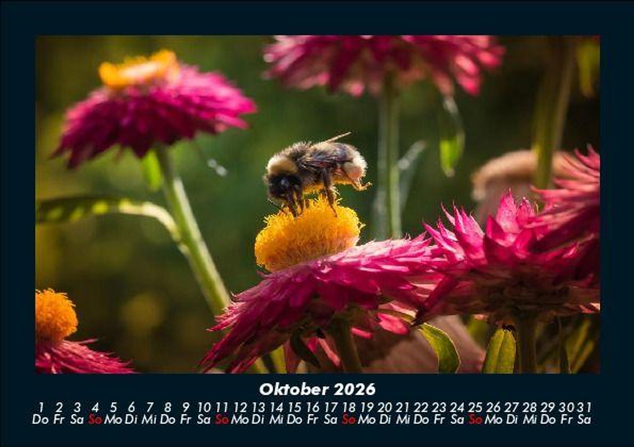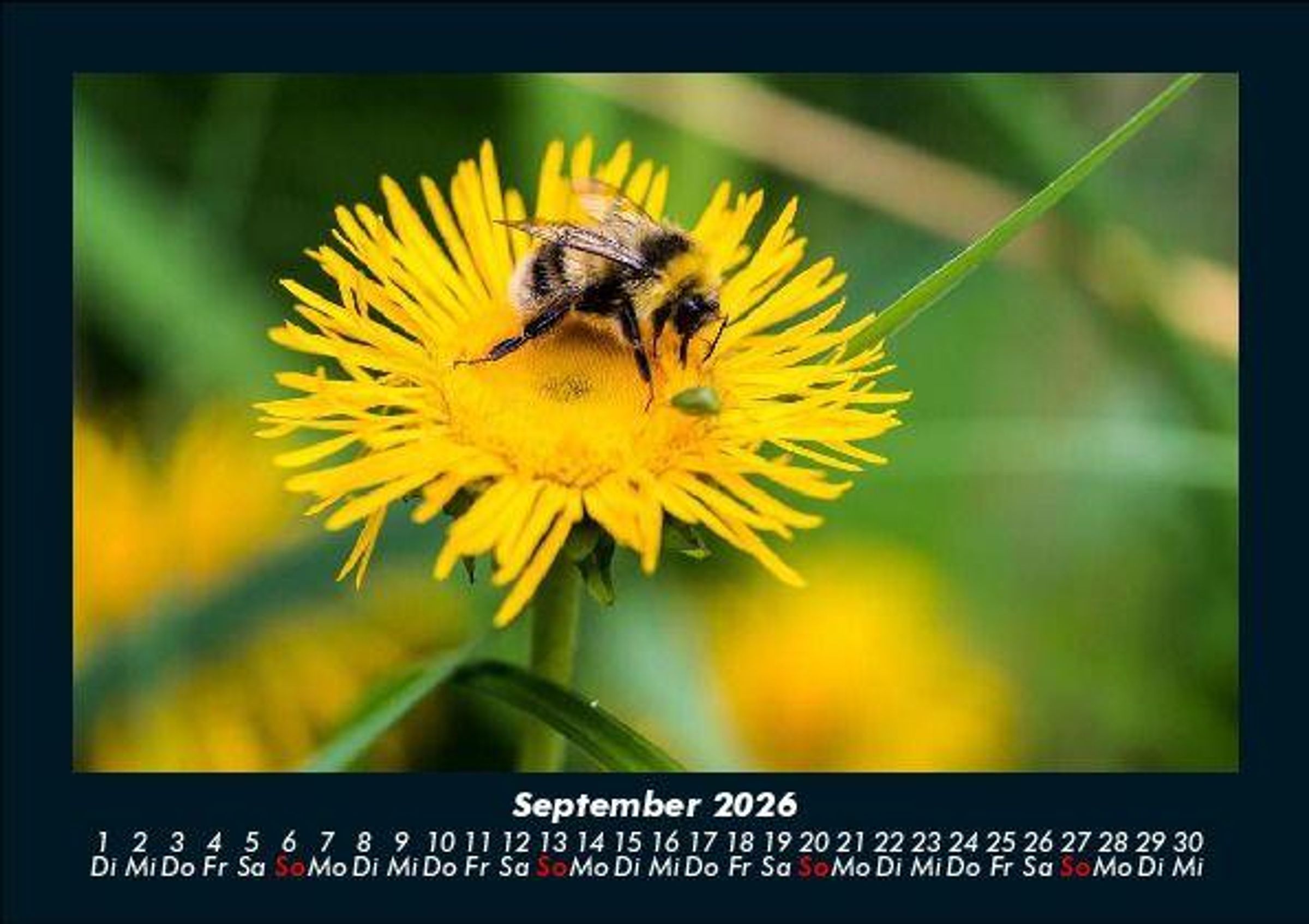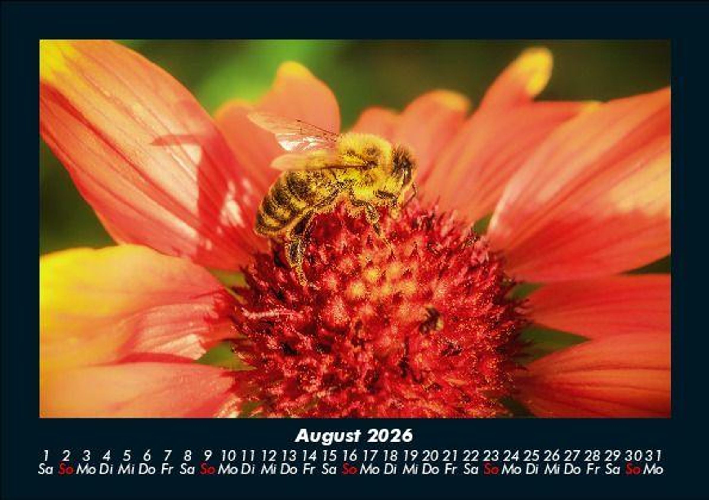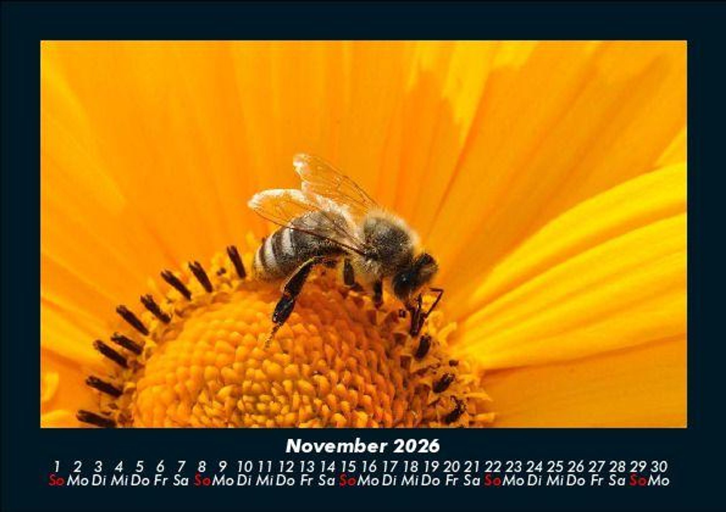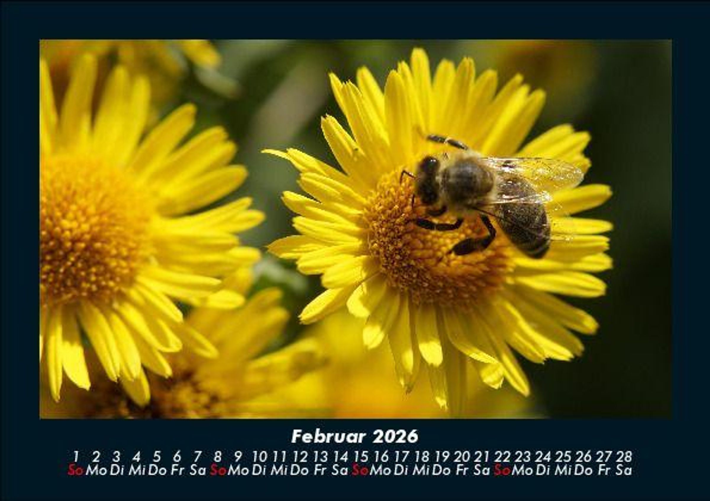 Bien 2026 Motivkalender DIN A5 Der Kalender zeigt 12 Fotos von Bienen zusammen mit wunderschönen Blüten. Vero-Kalender erhalten Sie mit Motiven aus den verschiedensten Themenbereichen wie Natur, Blumen und Landschaft, Tierwelt, Architektur, Reise und Urlaub, Technik, Automobil und Eisenbahn, Emotionen, Sport und Musik. Gedruckt werden die Monats-Kalender aus dem Vero Verlag auf hochwertigem Kalenderbogen in Premium-Qualität und verschiedenen Größen. Die Vielfältigkeit der Motive unserer Foto-Kalender ist dank der Zusammenarbeit mit kreativen Fotografen möglich.