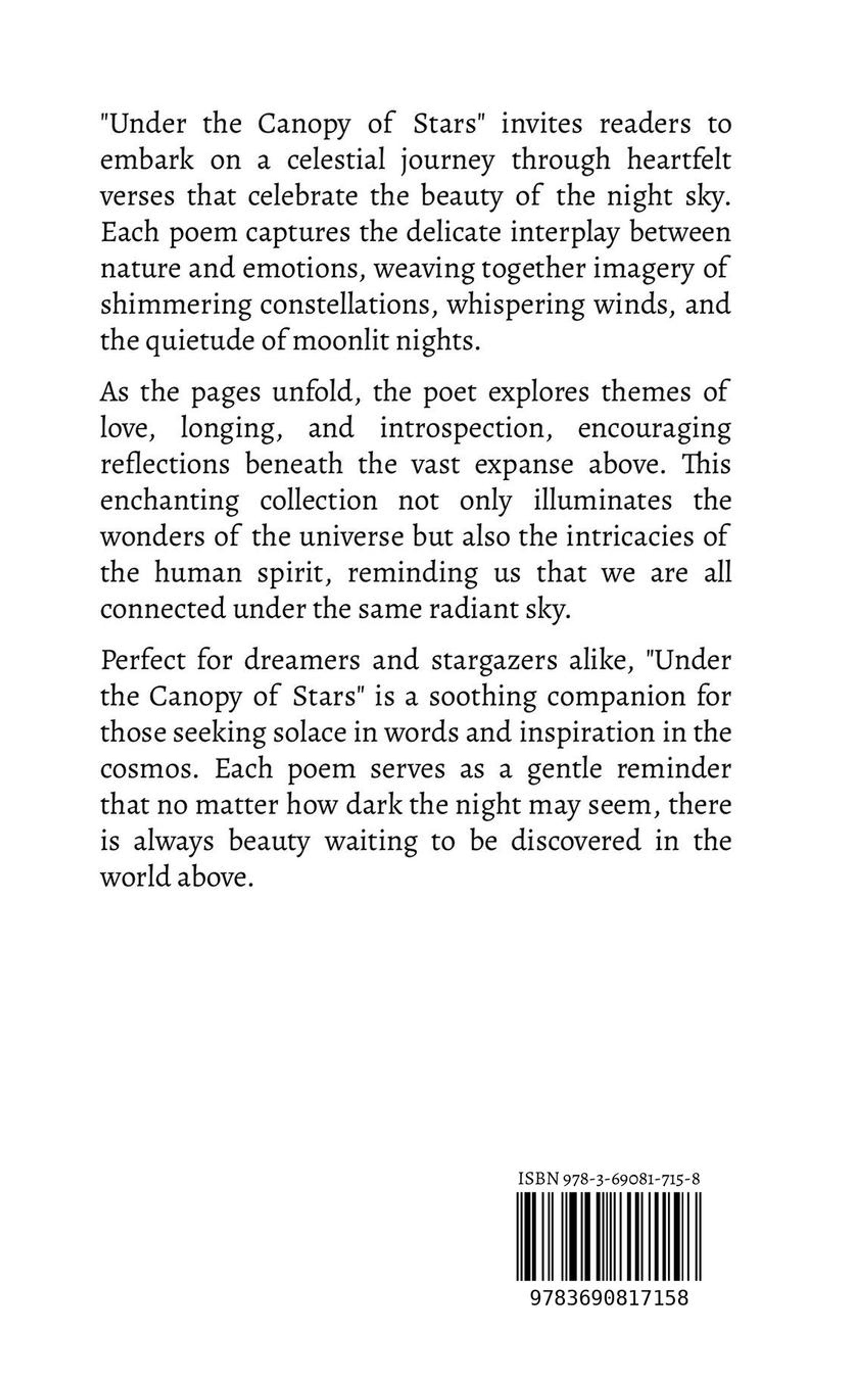 "Under the Canopy of Stars" invites readers to embark on a celestial journey through heartfelt verses that celebrate the beauty of the night sky. Each poem captures the delicate interplay between nature and emotions, weaving together imagery of shimmering constellations, whispering winds, and the quietude of moonlit nights. As the pages unfold, the poet explores themes of love, longing, and introspection, encouraging reflections beneath the vast expanse above. This enchanting collection not only illuminates the wonders of the universe but also the intricacies of the human spirit, reminding us that we are all connected under the same radiant sky. Perfect for dreamers and stargazers alike, "Under the Canopy of Stars" is a soothing companion for those seeking solace in words and inspiration in the cosmos. Each poem serves as a gentle reminder that no matter how dark the night may seem, there is always beauty waiting to be discovered in the world above.