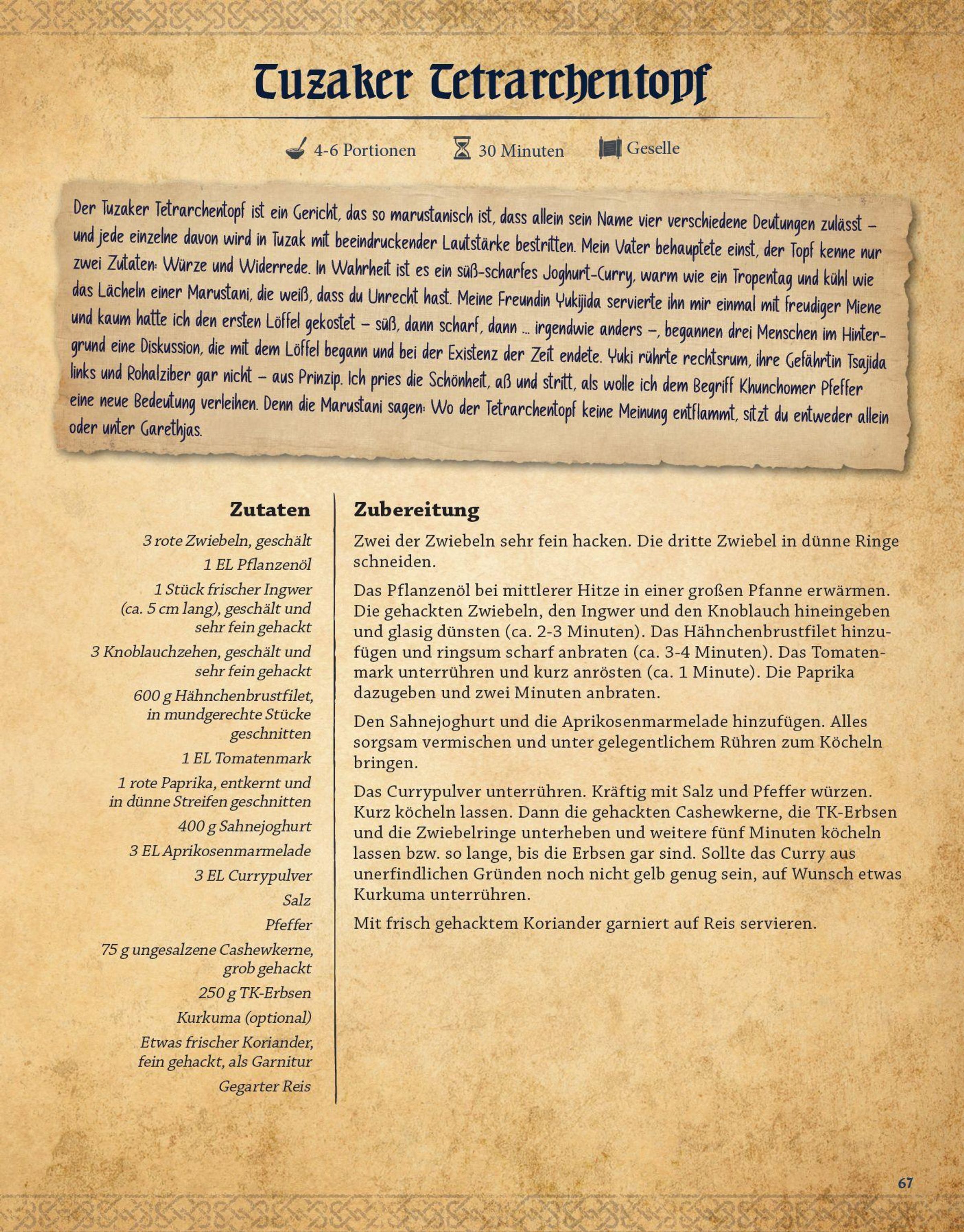 Dieses offizielle Kochbuch nimmt euch mit auf eine kulinarische Reise durch die vielgestaltigen Regionen und Kulturen Aventuriens, von den sturmgepeitschten Küsten Thorwals über die winterlichen Gefilde Bornlands bis zu den exotischen Märkten von Al'Anfa. Jedes Gebiet birgt seine ganz eigenen Rezepte, Zutaten und Aromen, so vielfältig wie die Völker, die dort leben. Und über allem steht dabei die Frage: Wie mundet¿s?
