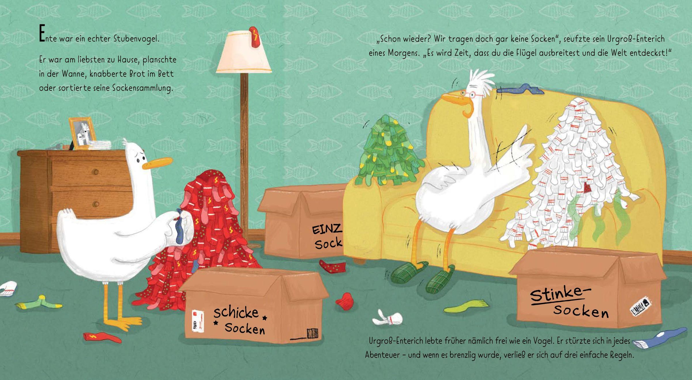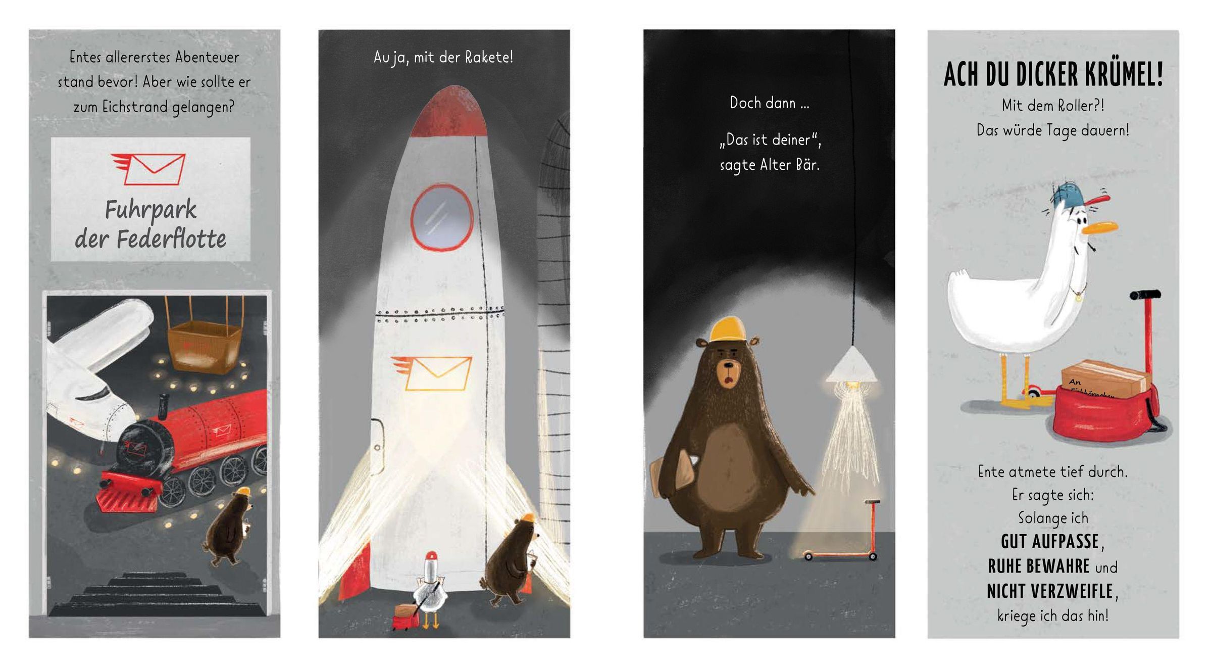 Ente ist ein gemütlicher Stubenvogel . Am liebsten planscht er in der Badewanne, knabbert Brot im Bett und sortiert stundenlang seine Sockensammlung. Doch auch für die gemütlichste Ente wird es eines Tages Zeit, die Flügel auszubreiten und die Welt zu entdecken . Und wo könnte man das besser als bei der Post , während man Pakete in der ganzen Welt ausliefert? Schon bald macht sich Ente mit seiner neuen Uniform und einem Paket unterm Flügel **auf zu seinem allerersten Abenteuer ...**was könnte da schon schiefgehen?