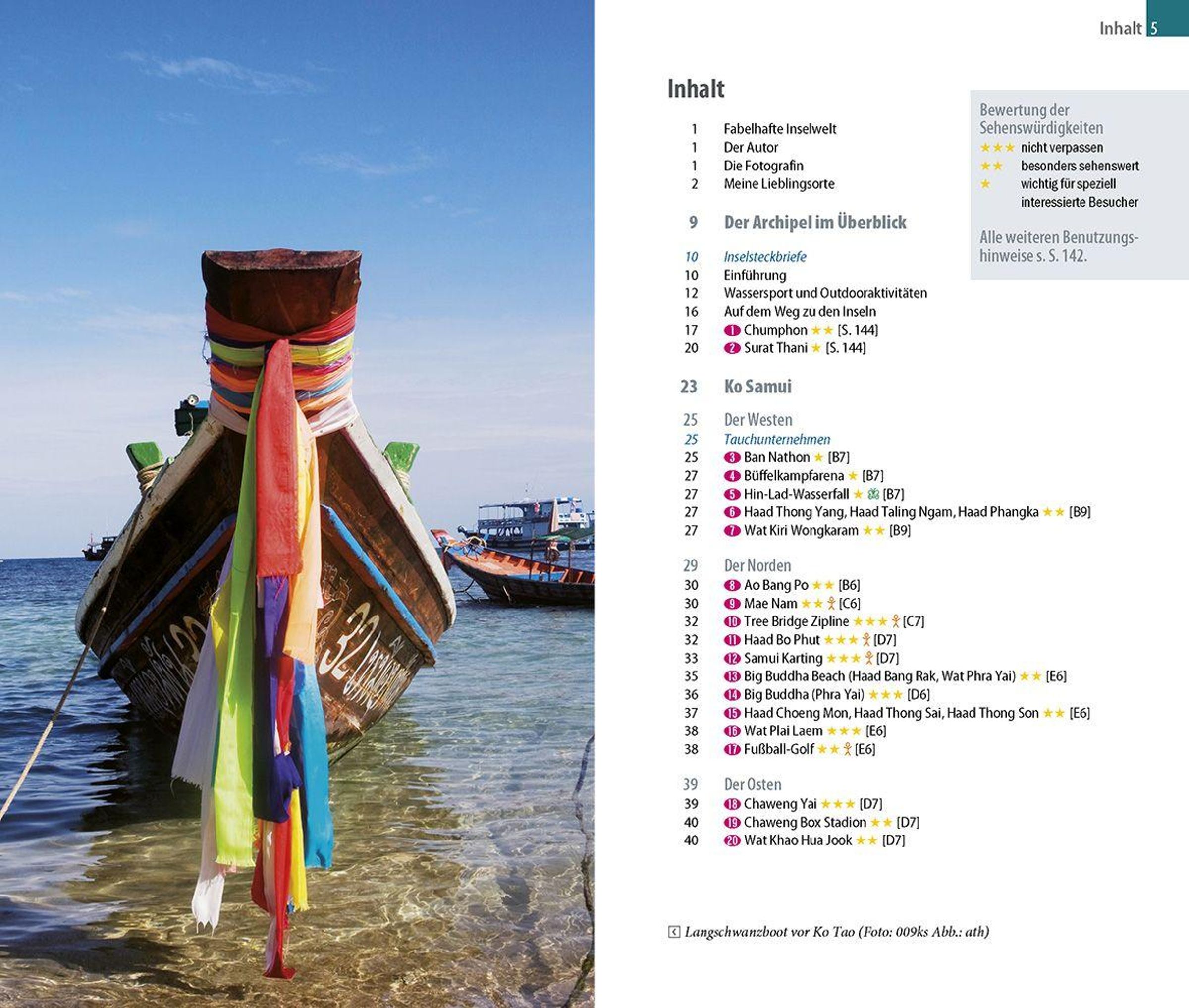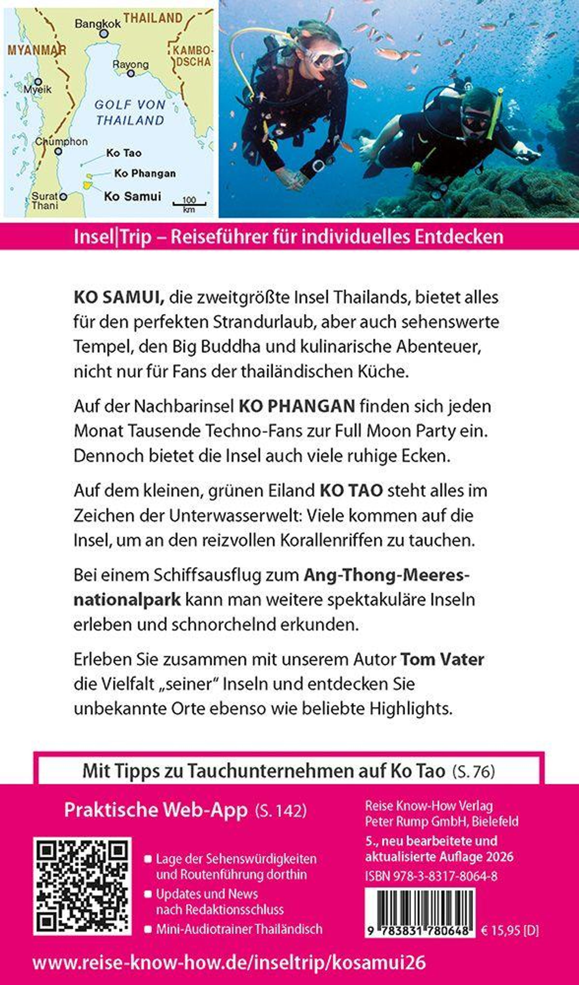 Dazu: kostenlose Web-App für Smartphone, Tablet und PC mit Inselplan- und Satellitenansichten passend zum Text, Routenführung zu allen beschriebenen Sehenswürdigkeiten und touristisch wichtigen Orten, seitenbezogenen Updates nach Redaktionsschluss sowie einem Mini-Audiotrainer Thai