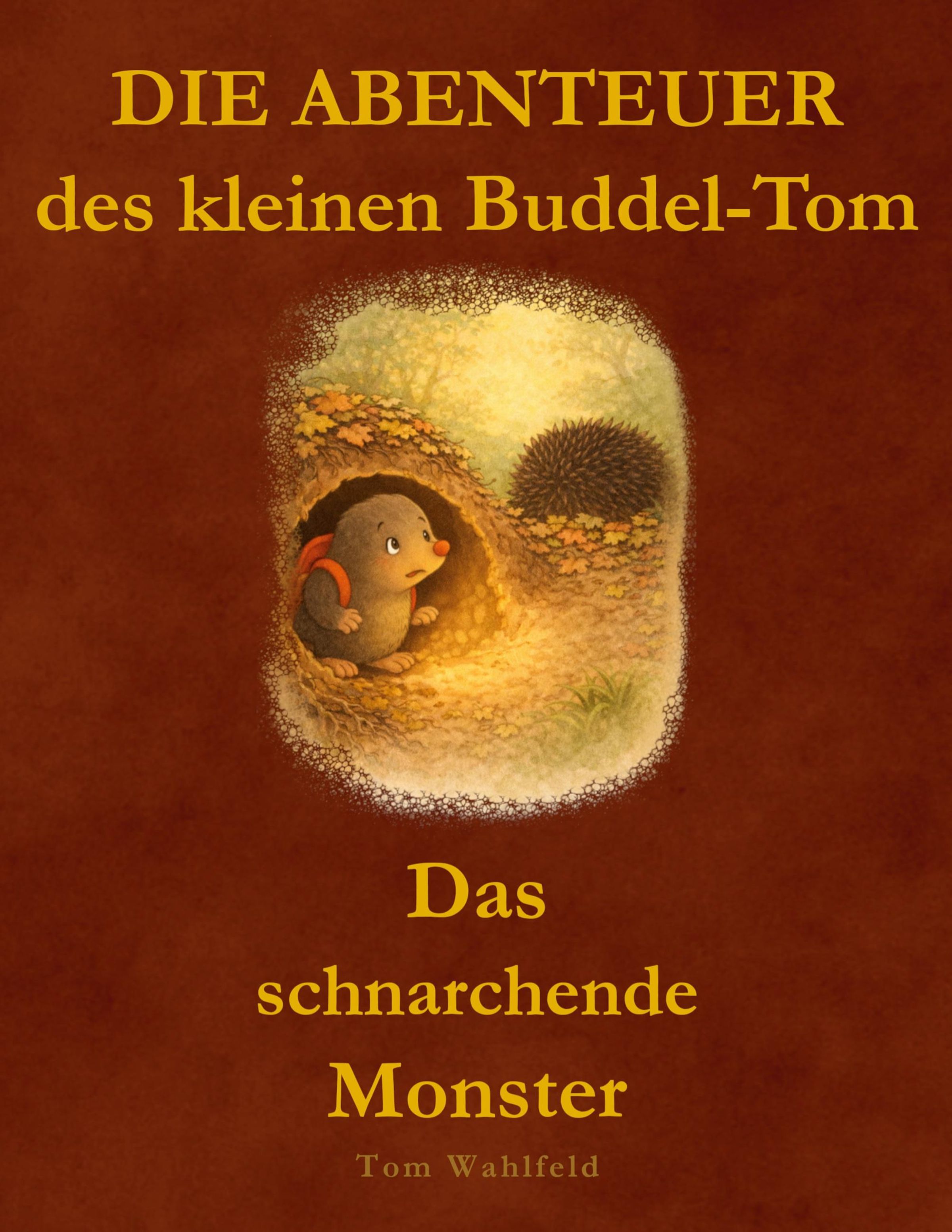 Text: "DIE ABENTEUER des kleinen Buddel-Tom - Das schnarchende Monster - Tom Wahlfeld". Illustration eines Maulwurfs., Buch