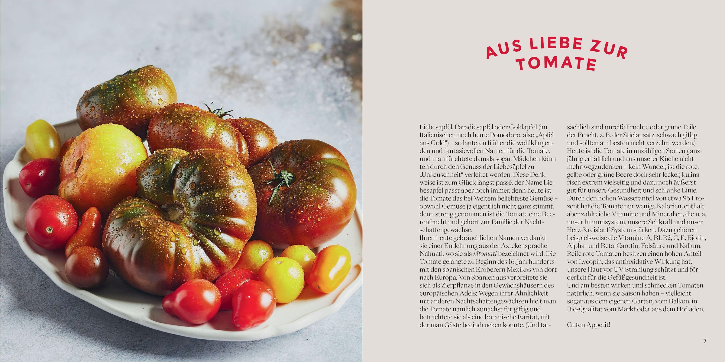 "Tomaten. Neue Rezepte mit der gesunden Frucht." Teller mit Tomaten, Messer und Logo unten links., Buch