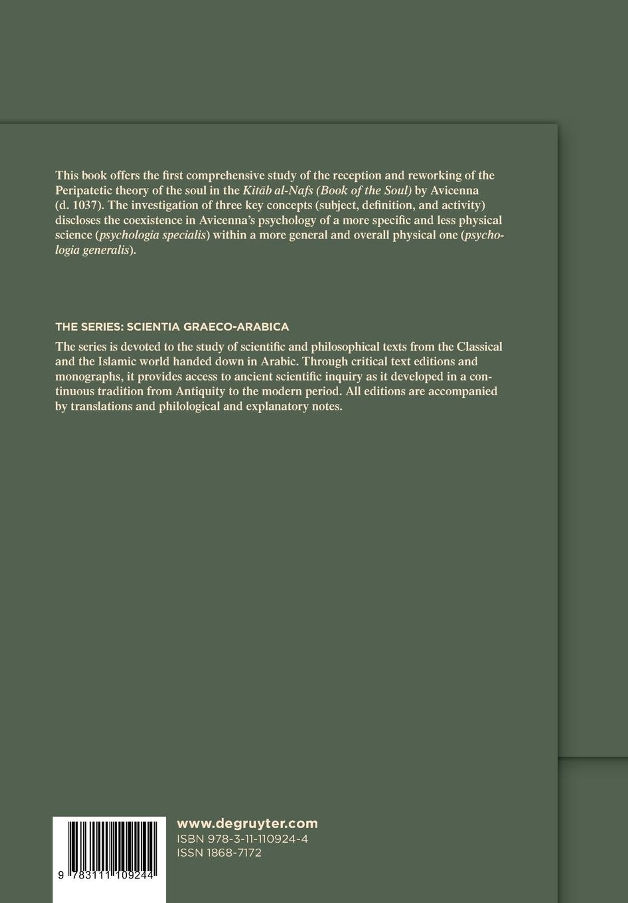 This book offers for the first time a comprehensive study of the reception and reworking of the Peripatetic theory of the soul in the Kit¿b al-Nafs (Book of the Soul) by Avicenna (d. 1037). This study seeks to frame Avicennäs science of the soul (or psychology) by focusing on three key concepts: subject, definition, and activity. The examination of these concepts will disclose the twofold consideration of the soul in Avicennäs psychology. Besides the ¿general approach¿ to the soul of sublunary living beings, which is the formal principle of the body, Avicennäs psychology also exhibits a ¿specific orientation¿ towards the soul in itself, i. e. the human rational soul that, considered in isolation from the body, is a self-subsistent substance, identical with the theoretical intellect and capable of surviving severance from the body. These two investigations demonstrate the coexistence in Avicennäs psychology of a more specific and less physical science (psychologia specialis ) within a more general and overall physical one (psychologia generalis).