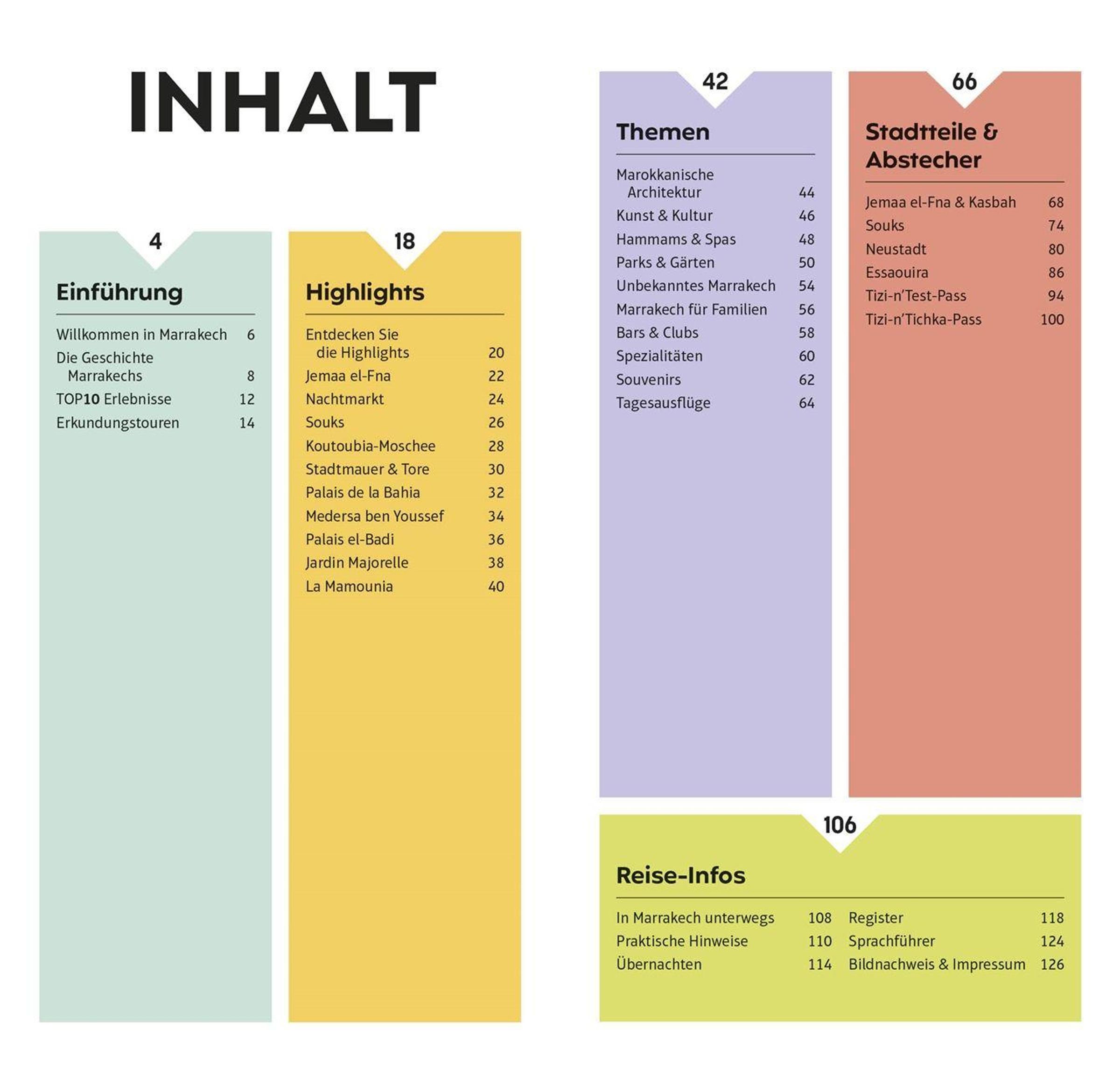 Die 10 interessantesten Souks, die 10 besten Hammams & Spas, die 10 schönsten historischen Gebäude: Mit dem TOP10-Prinzip planen Sie Ihre Marrakech-Reise einfach und ganz individuell. Die praktischen TOP10-Listen präsentieren alle Attraktionen auf einen Blick: von denabsoluten Highlights wie der Koutoubia-Moschee überbesondere Themen wie Parks & Gärten oder Kunst & Kultur bis zu den einzelnen Stadtteilen mit ihren Attraktionen, Restaurants und Shops. So gestalten Sie im NuIhre persönliche Bucket List. Außerdem erwarten Sie Empfehlungen für die TOP10-Erlebnisse , spannende Erkundungstouren und ein Streifzug durch Marrakechsfaszinierende Geschichte . Vor Ort ist der leichte, kompakte TOP10-Reiseführer schnell zur Hand, bietet Ihnen wertvolle Reise-Infos und führt Sie mit detaillierten Karten und dem herausnehmbaren wetterfesten Stadtplan sicher an jedes Ziel.