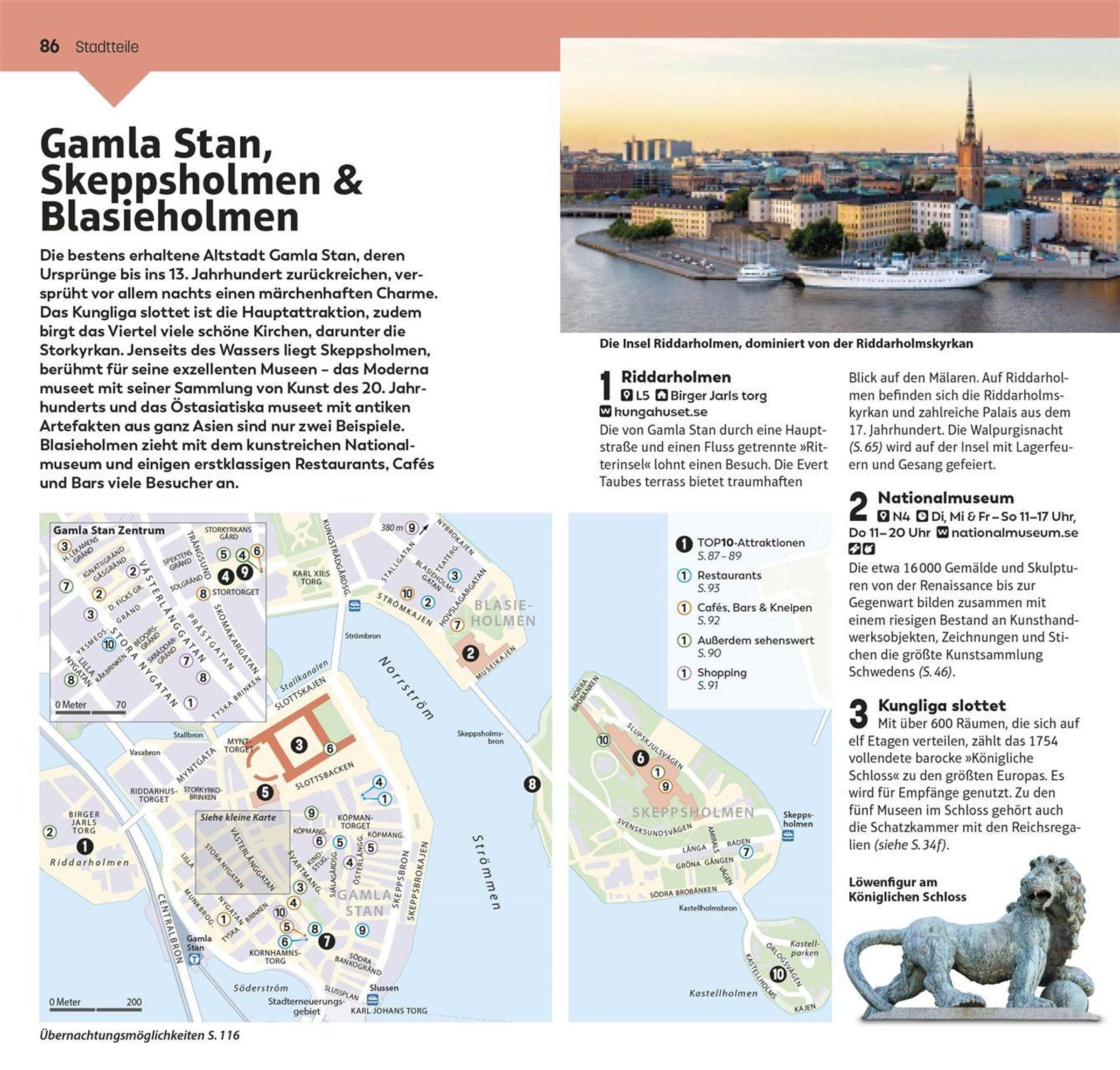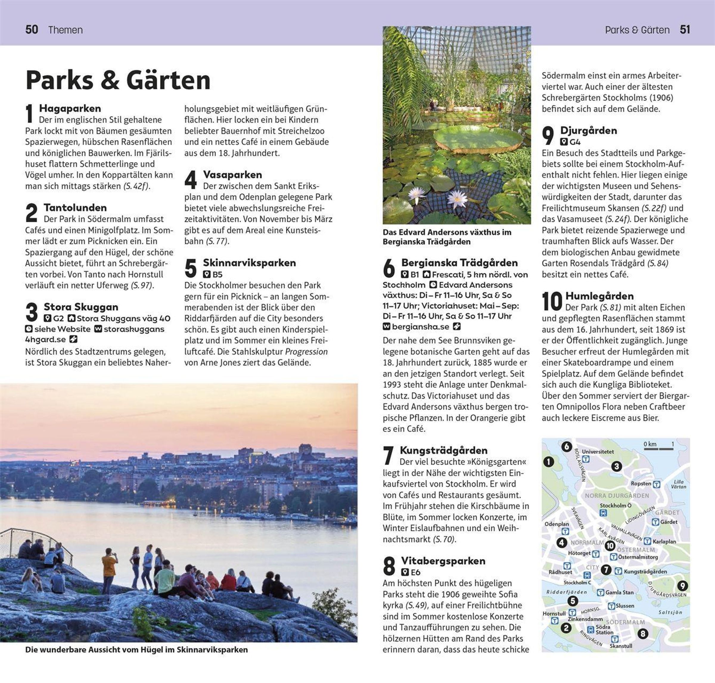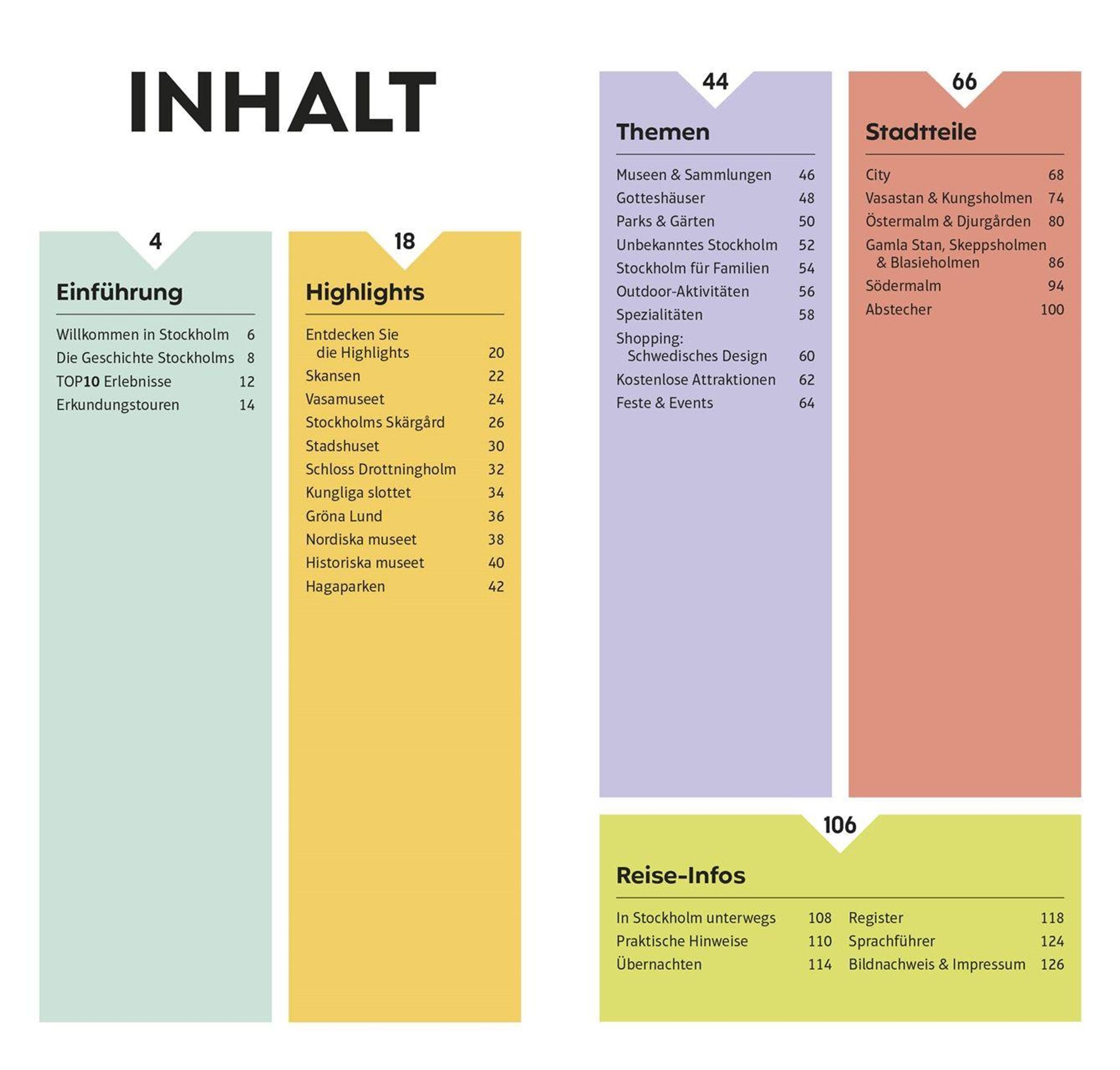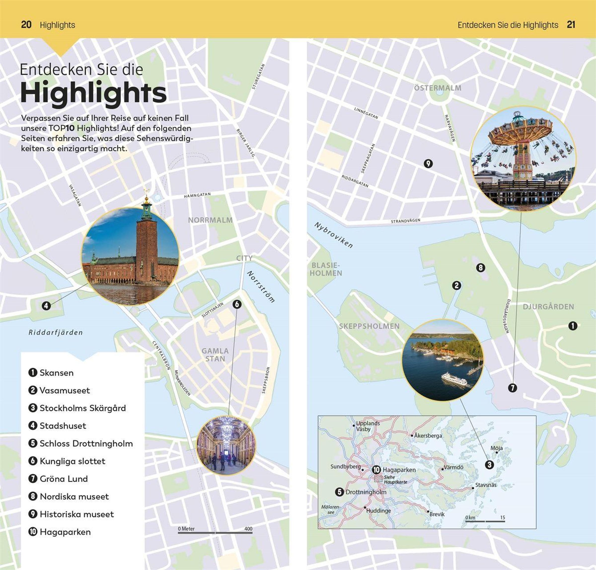 Die 10 schönsten Inseln im Schärengarten, die 10 bedeutendsten Museen, die 10 besten Läden für Schweden-[HB2] Design: Mit dem TOP10-Prinzip planen Sie Ihre Stockholm-Reise einfach und ganz individuell. Die praktischen TOP10-Listen präsentieren alle Attraktionen auf einen Blick: von denabsoluten Highlights wie Schloss Drottningholm überbesondere Themen wie Outdoor-Aktivitäten oder Entdeckungen abseits der Touristenströme bis zu den einzelnen Stadtteilen mit ihren Attraktionen, Restaurants und Shops. So gestalten Sie im NuIhre persönliche Bucket List. Außerdem erwarten Sie Empfehlungen für die TOP10-Erlebnisse , spannende Erkundungstouren und ein Streifzug durch Stockholmsfaszinierende Geschichte . Vor Ort ist der leichte, kompakte TOP10-Reiseführer schnell zur Hand, bietet Ihnen wertvolle Reise-Infos und führt Sie mit detaillierten Karten und dem herausnehmbaren wetterfesten Stadtplan sicher an jedes Ziel.