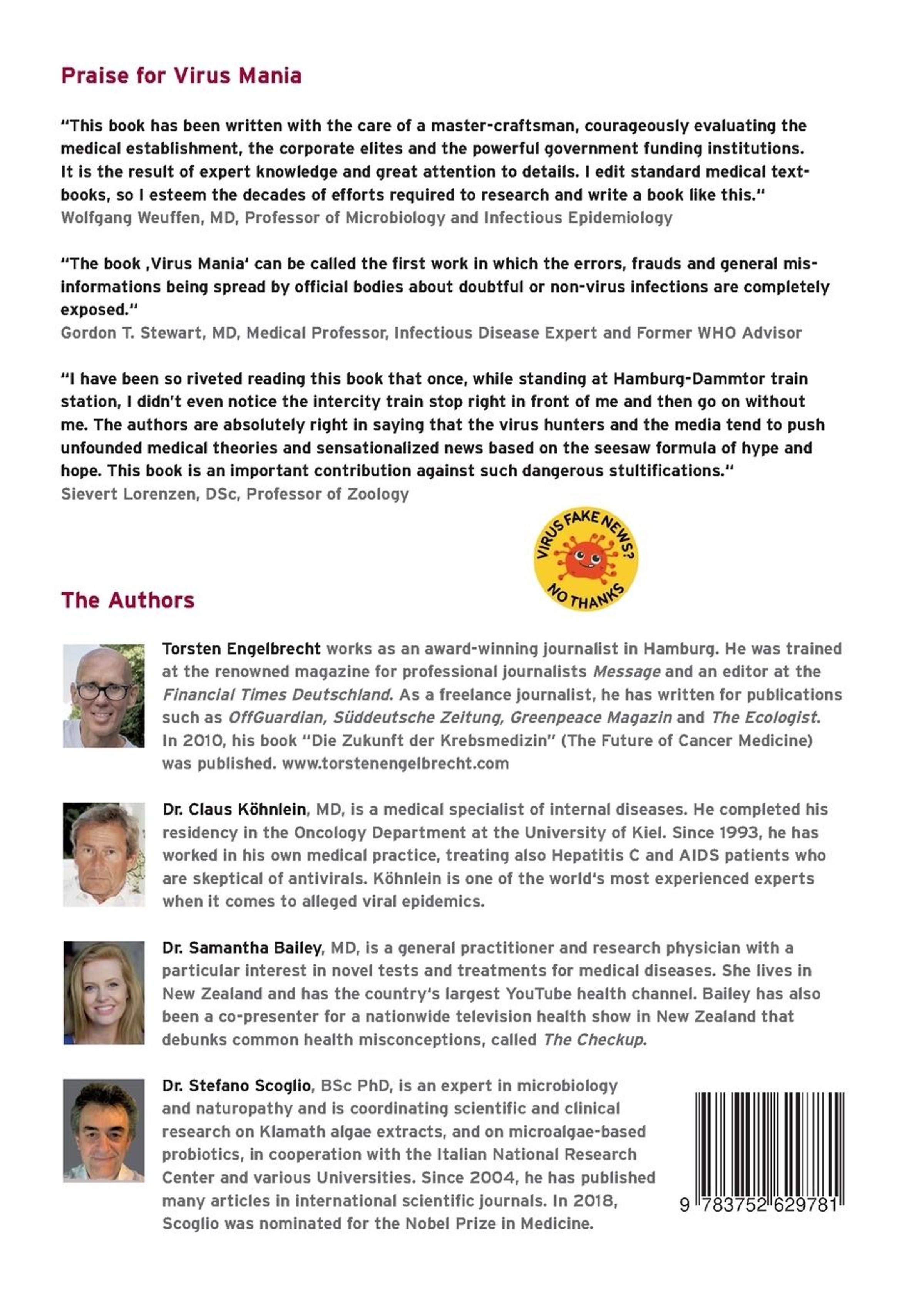 The population is terrified by reports of so-called COVID-19, measles, swine flu, SARS, BSE, AIDS or polio. However, the authors of "Virus Mania," investigative journalist Torsten Engelbrecht, Dr. Claus Köhnlein, MD, Dr. Samantha Bailey, MD, and Dr. Stefano Scoglio, BSc PhD, show that this fearmongering is unfounded and that virus mayhem ignores basic scientific facts: The existence, the pathogenicity and the deadly effects of these agents have never been proven.