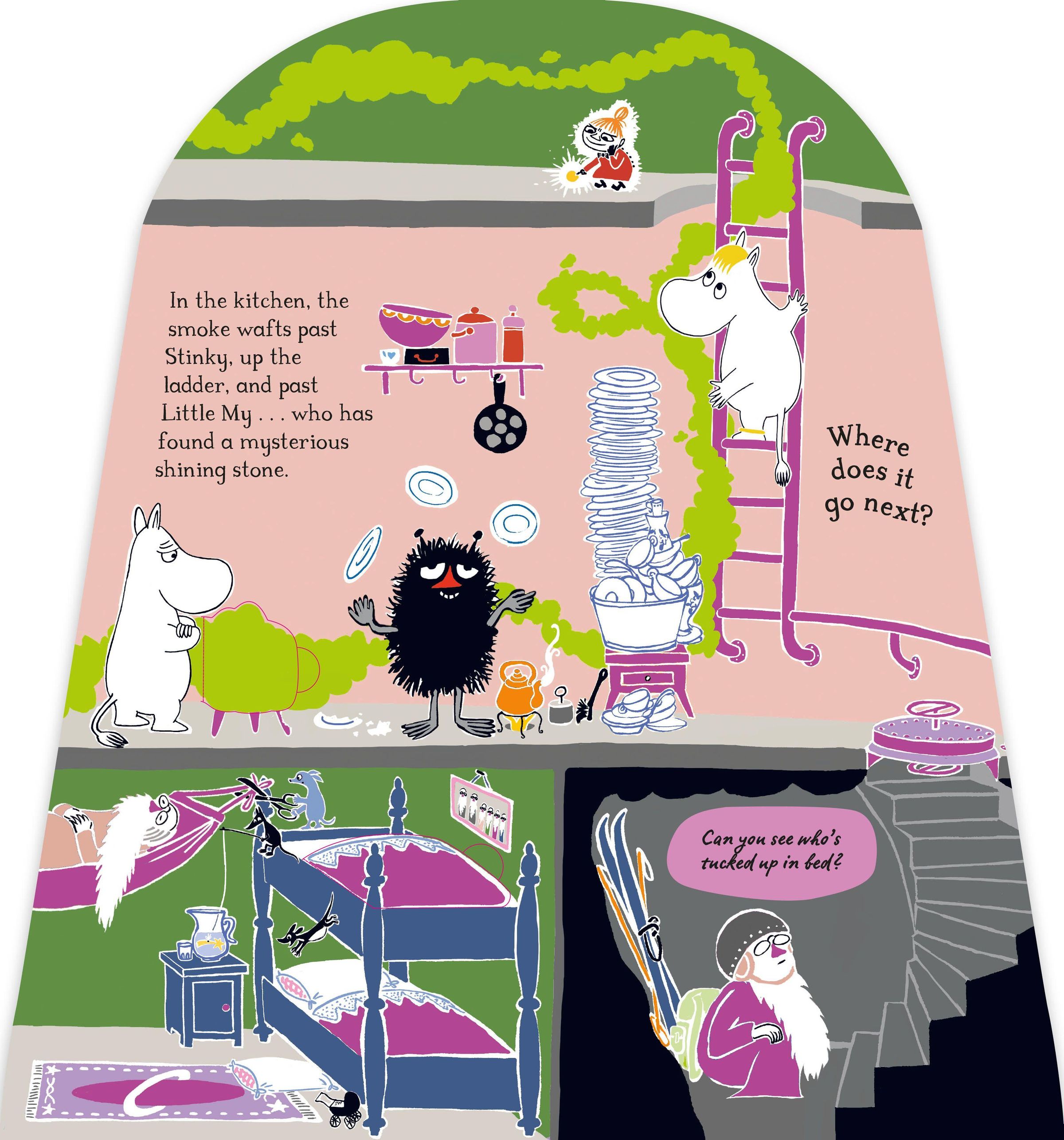 Moomintroll and Snorkmaiden are following a trail of green smoke as they search for a Martian in the Observatory . . . but what will happen when they find him? Join Moomintroll and Snorkmaiden as they find mysterious things happening while they follow the smoke, past Stinky, Little My and some shrunken Moomins and creeps. Along the way, lift the flaps to explore rooms, peek into cupboards and peer behind doors. There are all kinds of wonderful things to find!