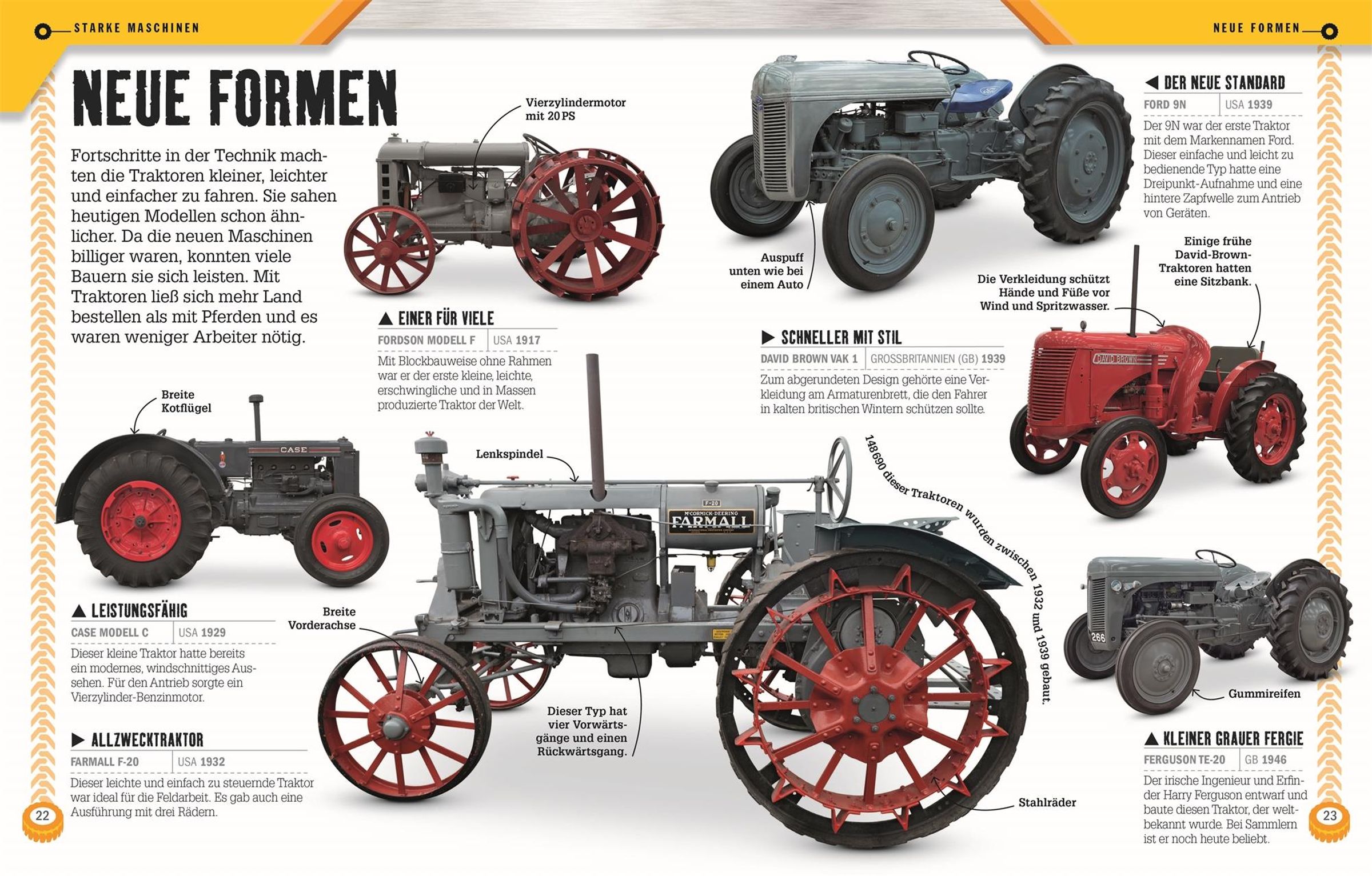 Dieses Buch steckt voller Power! Über 100 Jahre lang gibt es schon Traktoren und andere Landmaschinen. Seit ihrer Erfindung werden sie immer weiterentwickelt und unseren Bedürfnissen angepasst. Von den ersten Traktoren mit Dampfkraft bis zu den modernsten Monstermaschinen - zwischen diesen Seiten verstecken sich 130 verschiedene Modelle, die mit Foto, Steckbrief, Hintergrundinfos, Größenverhältnissen und vielem mehr vorgestellt werden. Über 400 Bilder sorgen für ein spannendes, bildgewaltiges Lesevergnügen. Kuriose Fakten, besondere Modelle und Anekdoten werden witzig in den Vordergrund gestellt, sodass die Fahrzeuge trotz der vielen Infos nie ins seichte Fahrwasser geraten. Hier gibt's Trecker für alle Geschmäcker und Traktorliebhaber jeden Alters!