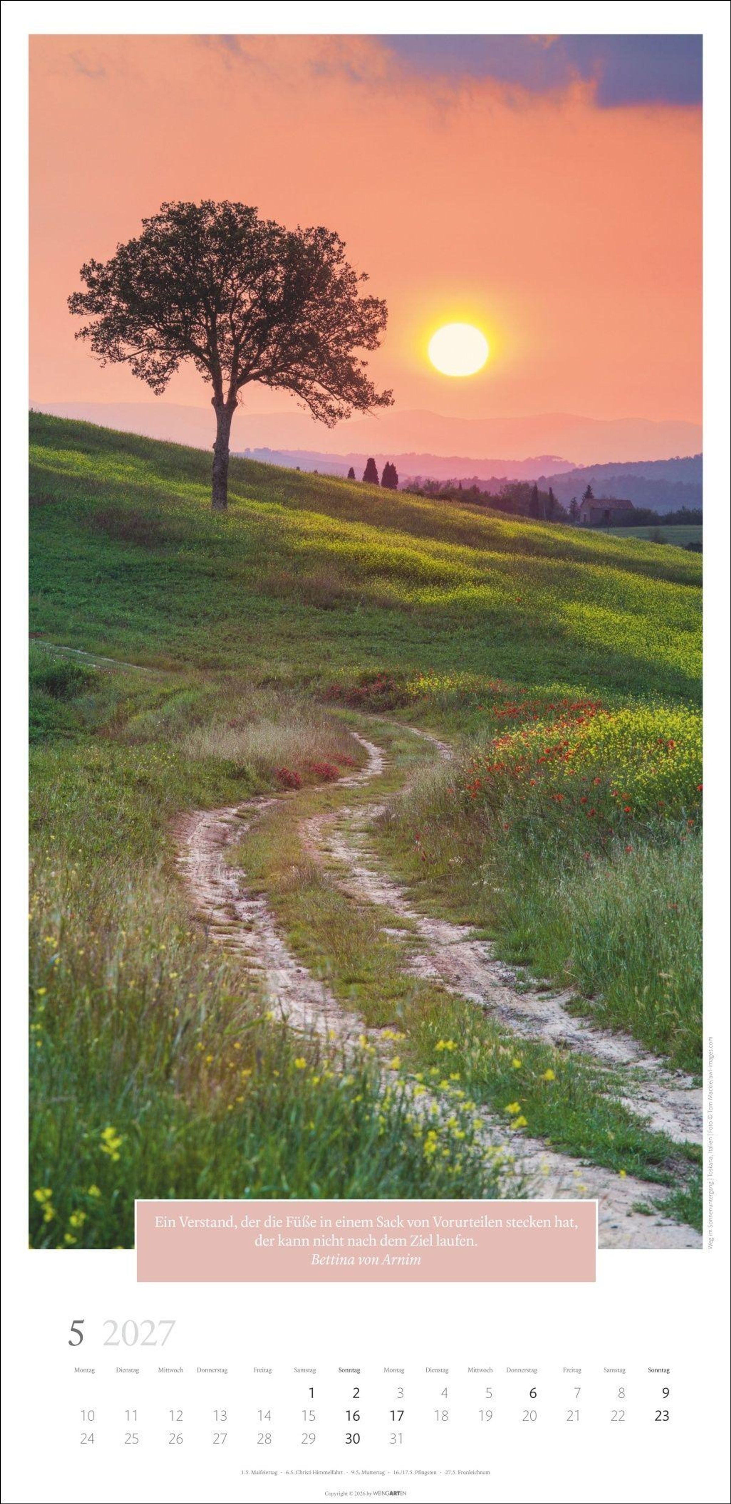 Die Ruhe von Feld und Wald von zu Hause aus genießen: länglicher Kalender mit inspirierenden Zitaten rund um Lebenswege, das Reisen und das Ankommen