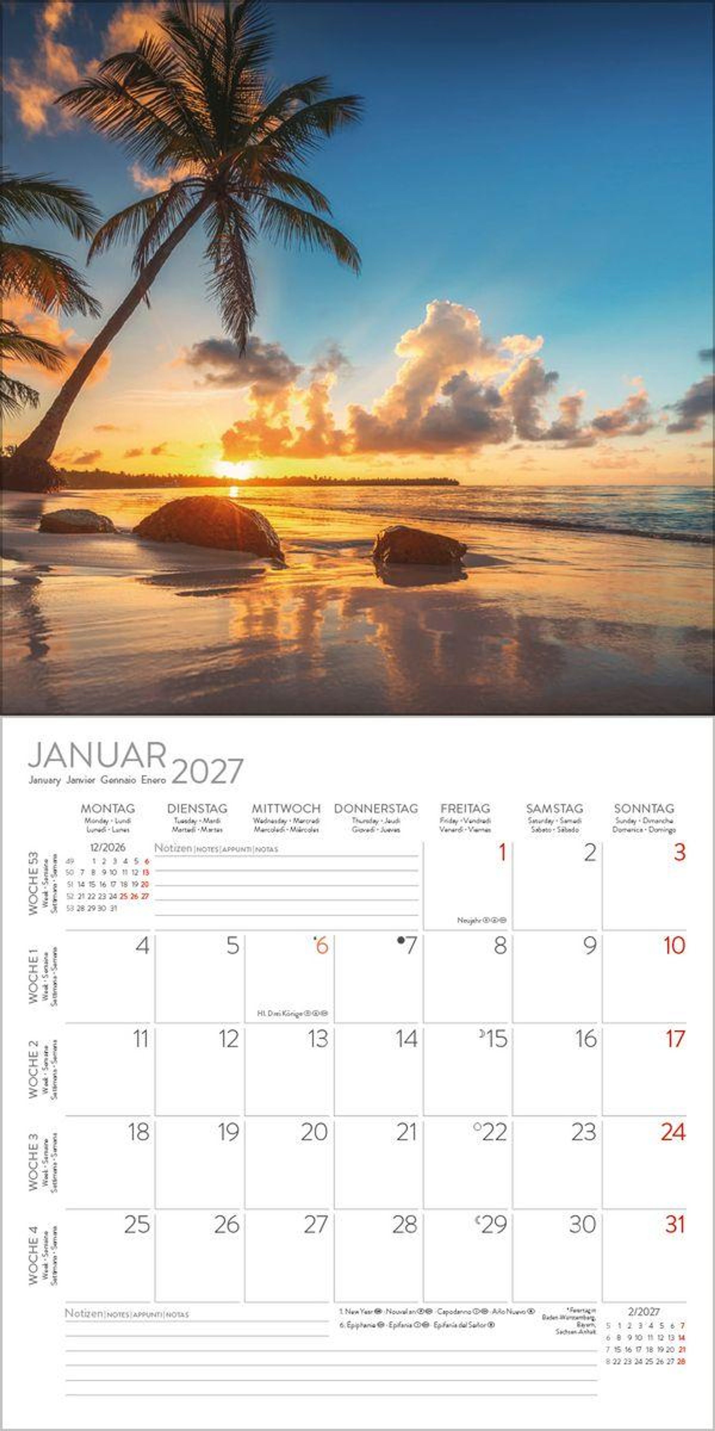 Wandkalender im Format: 30 x 30 cm; Offenes Format: 30 x 60 cm; umweltfreundliches FSC Papier Jede Kalenderseite mit großem Bild und viel Platz im Kalendarium für Notizen und Termine Mehrsprachiges Kalendarium: DE/GB/FR/IT/ES mit Feiertagen für D/A/CH/GB/FR/IT/ES Regionale Ferienzeiten für DE/A/CH Monatsübersicht für den jeweiligen Vor- und Nachmonat; Jahresübersicht