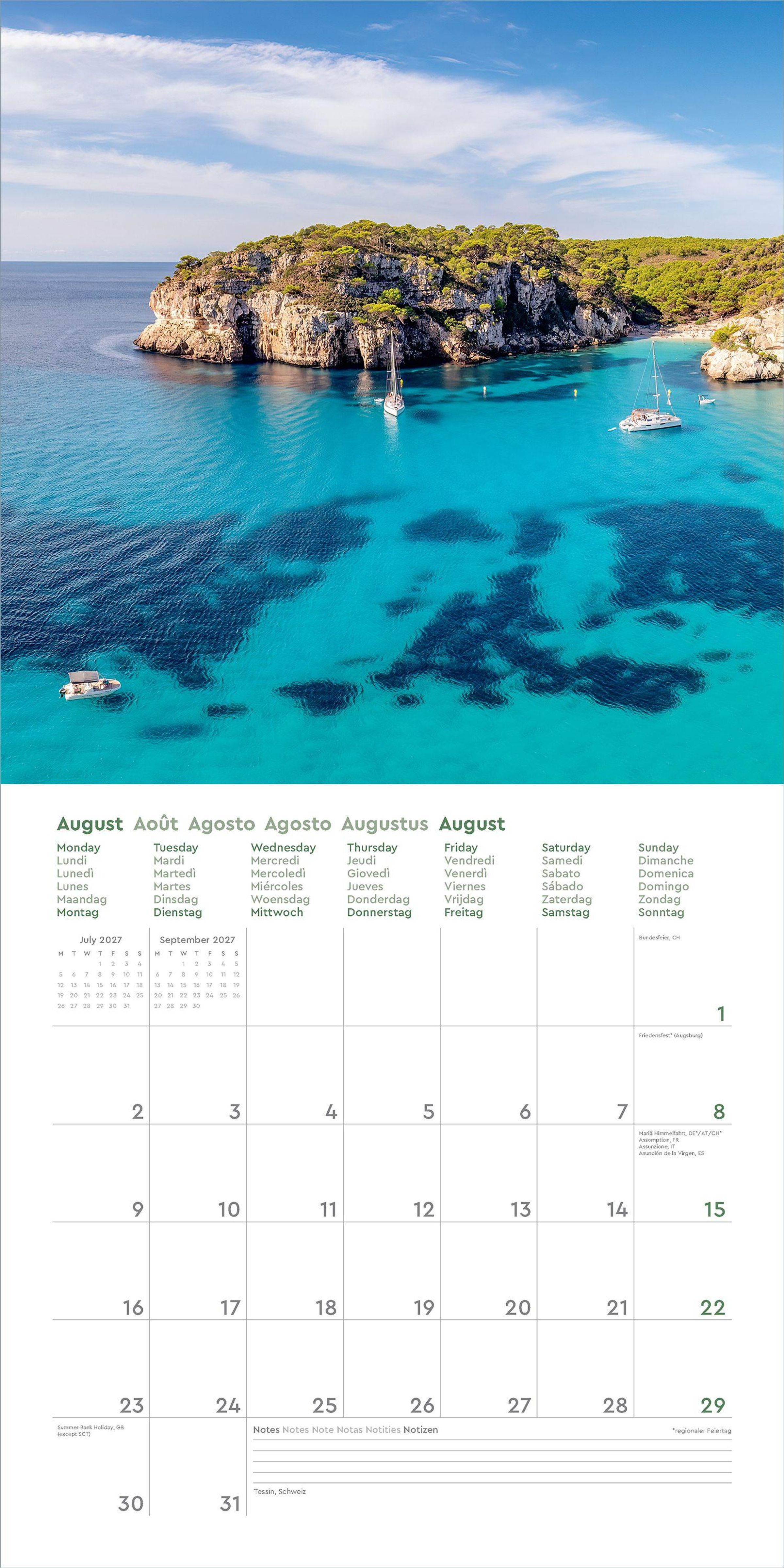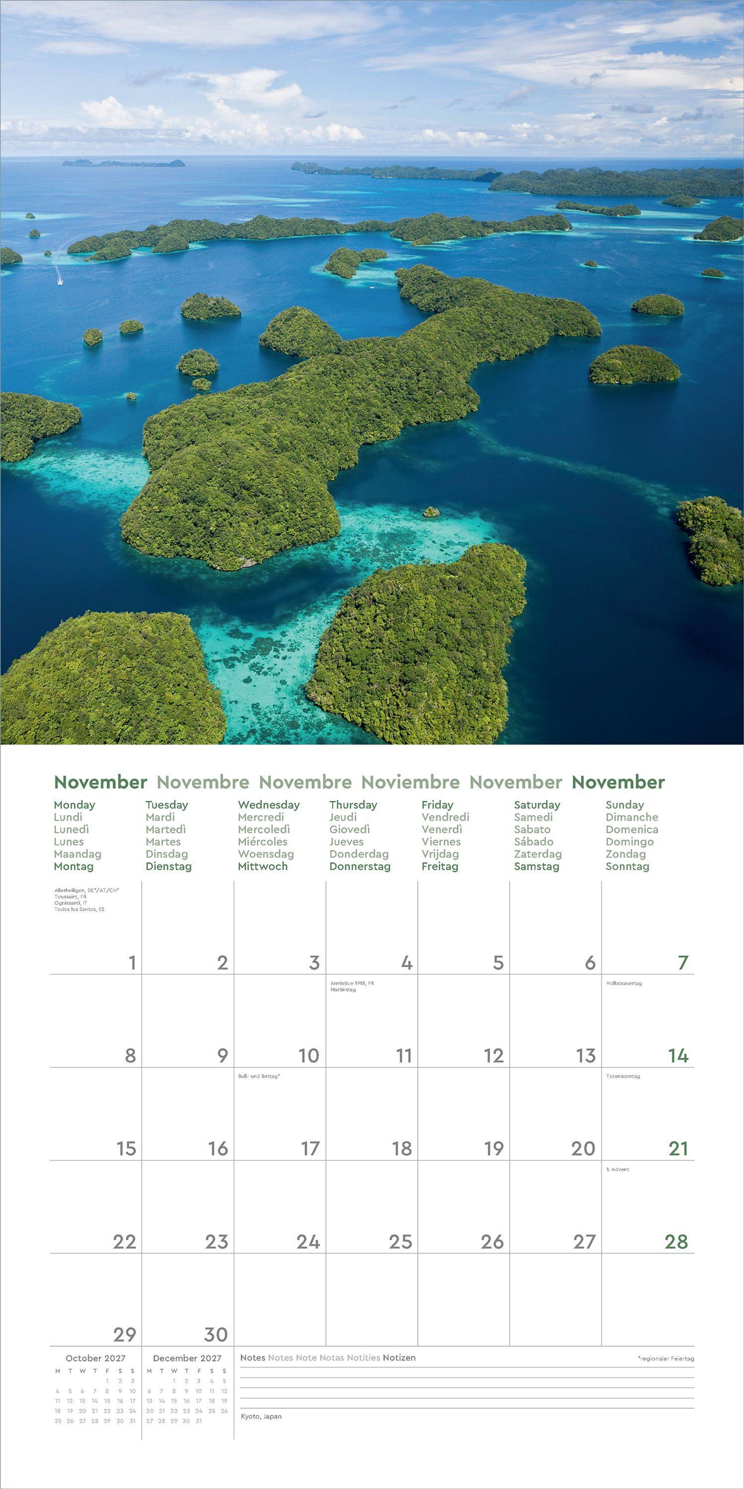 Aufgeklappt zeigt der Broschürenkalender Fotografien zum Wegträumen und bietet gleichzeitig viel Raum für Notizen Tag um Tag. Auch nach dem Jahr eignen sich die 30 x 30 cm großen Bilder als Poster.