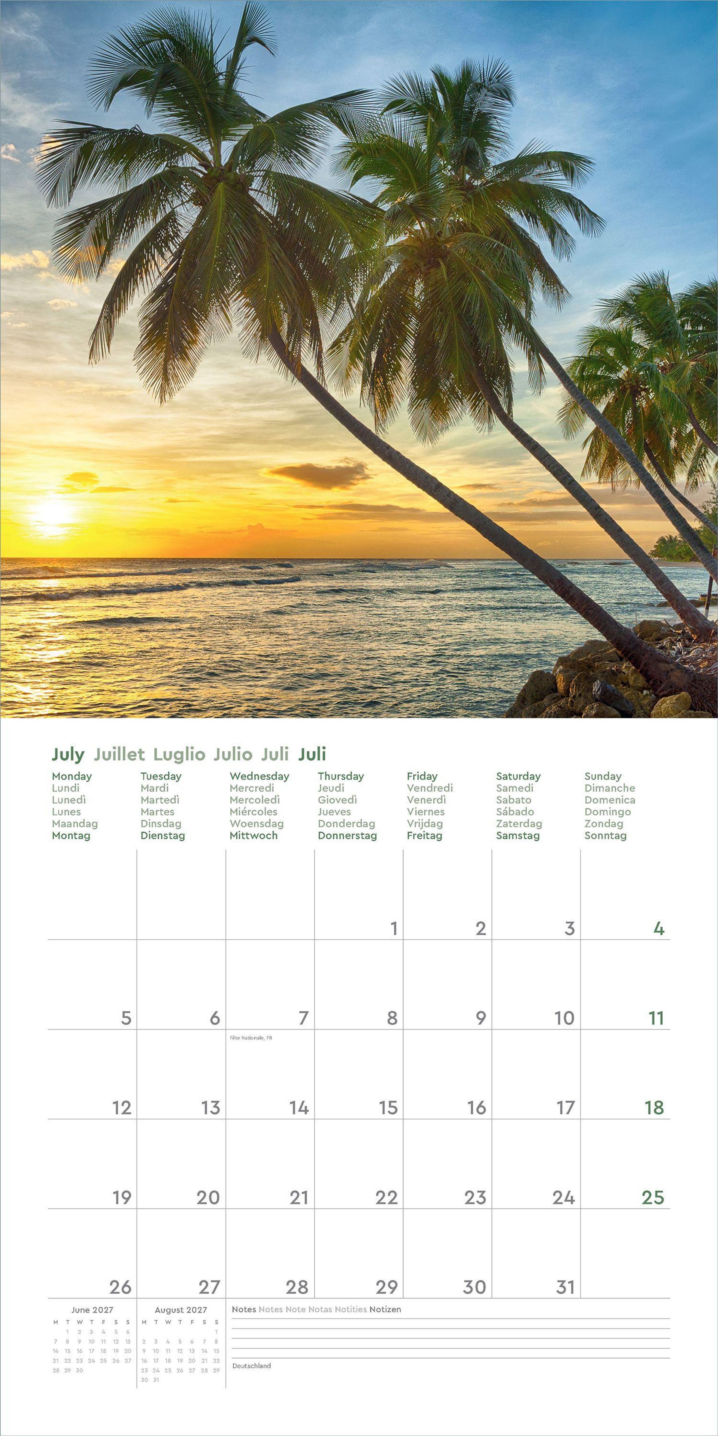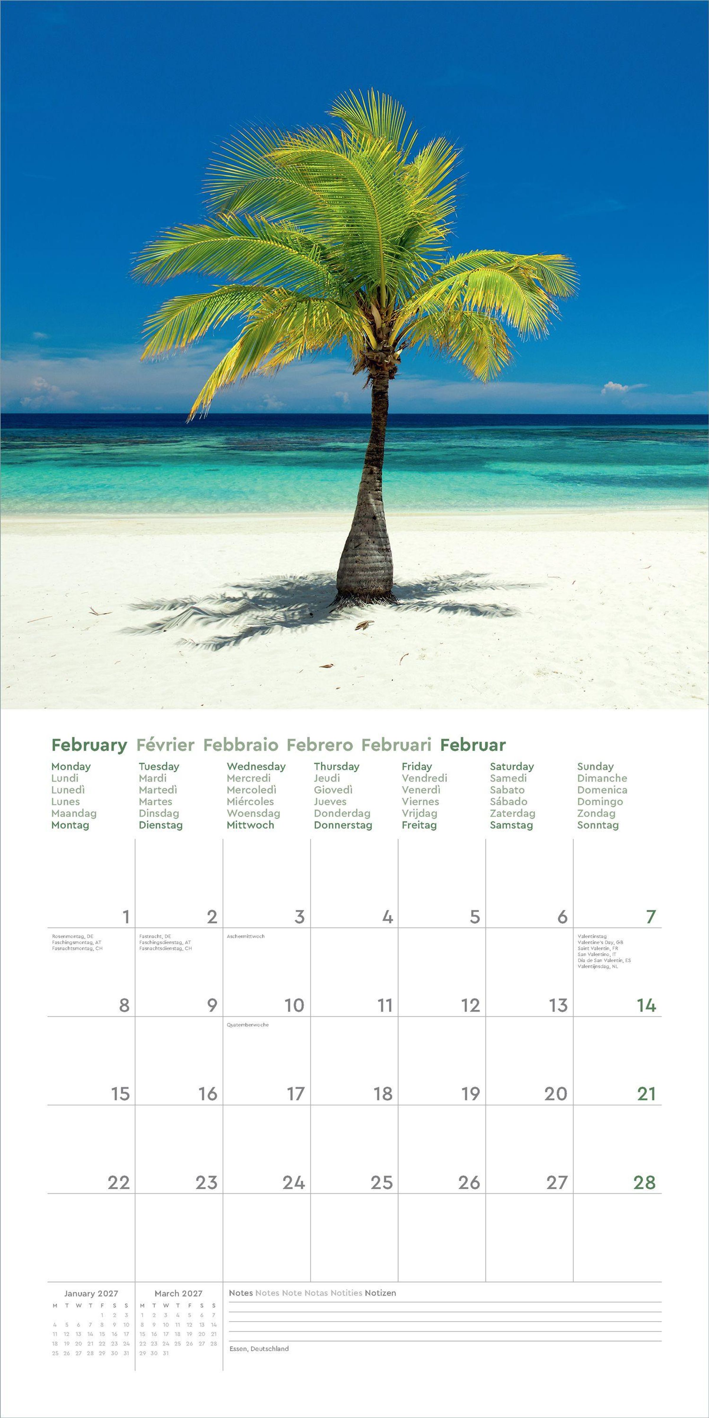 Dieser KUNTH Wandkalender "Trauminseln" 2027 begleitet mit zwölf traumhaften Aufnahmen durch das ganze Jahr. Monat für Monat lässt es sich mit dem Kalender direkt von zu Hause aus wegträumen zu Palmen, die sanft im Wind wiegen, zu türkisfarbenem Wasser, das in Wellen an goldene Strände rauscht, und zu Sonnenuntergängen, die sich über die schönsten Inseln unseres Planeten breiten.