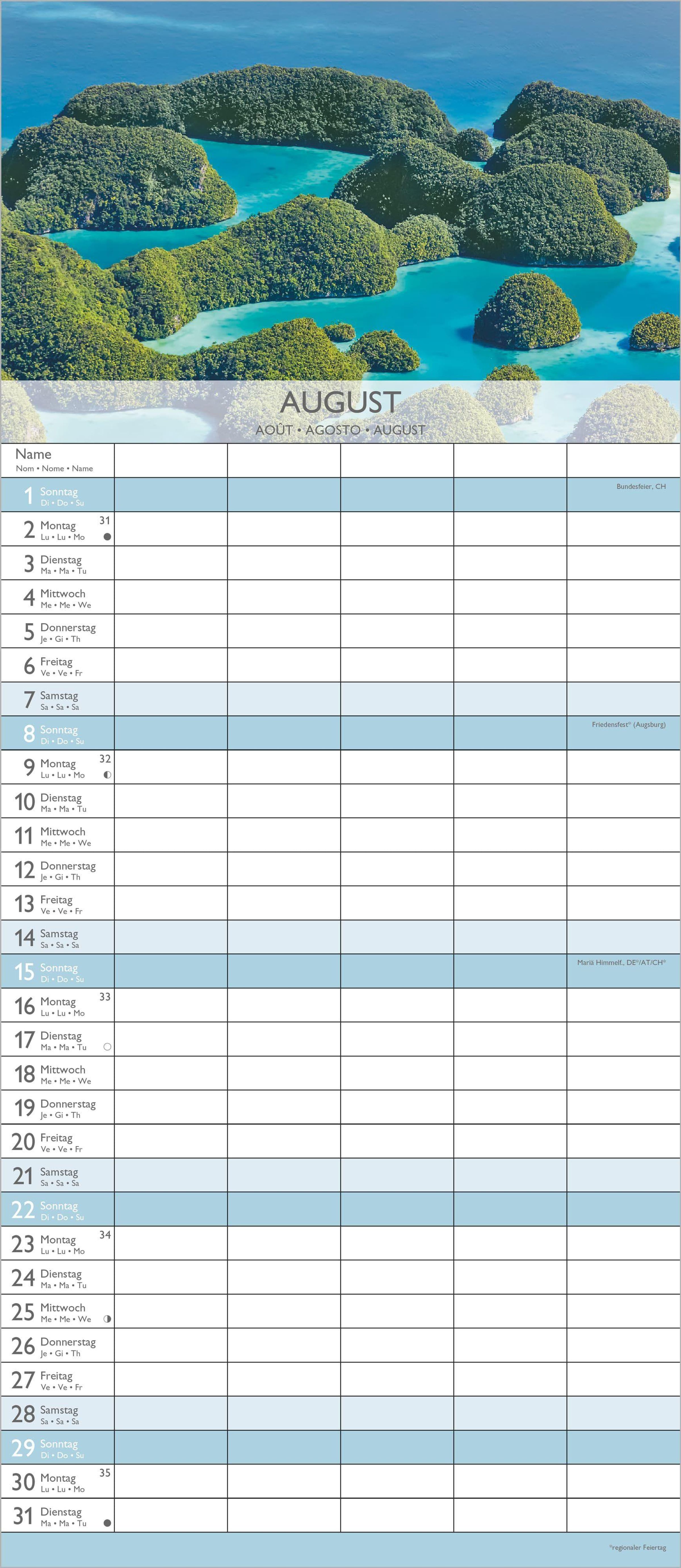 Übersichtliche Monatsansicht: 4-sprachiges Kalendarium (DE/FR/IT/GB) mit Feiertagen und Mondphasen für DE/AT/CH