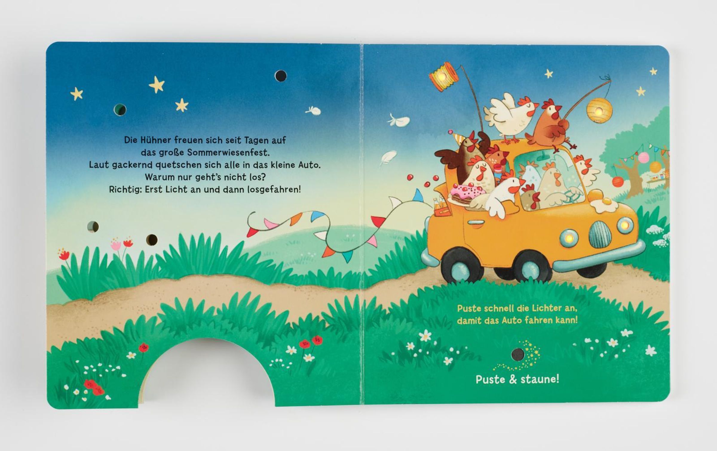 Dieses interaktive Pappebuch für Kinder ab 18 Monaten begeistert durch seinen magischen Mitmach-Effekt: Einmal pusten und die Lichter beginnen zu leuchten! Die Hasen haben eine lange Radtour gemacht, die Kuh hat mit ihrem Traktor den ganzen Tag auf dem Feld gearbeitet und die Hühner wollen los zum Sommerwiesenfest. Doch bei Dunkelheit ist Eines ganz wichtig: Erst Licht an und dann losgefahren! So können schon die Allerkleinsten den Tieren helfen, sicher ans Ziel zu kommen! Ein zauberhaftes Fahrzeuge-Buch mit Puste-Licht!