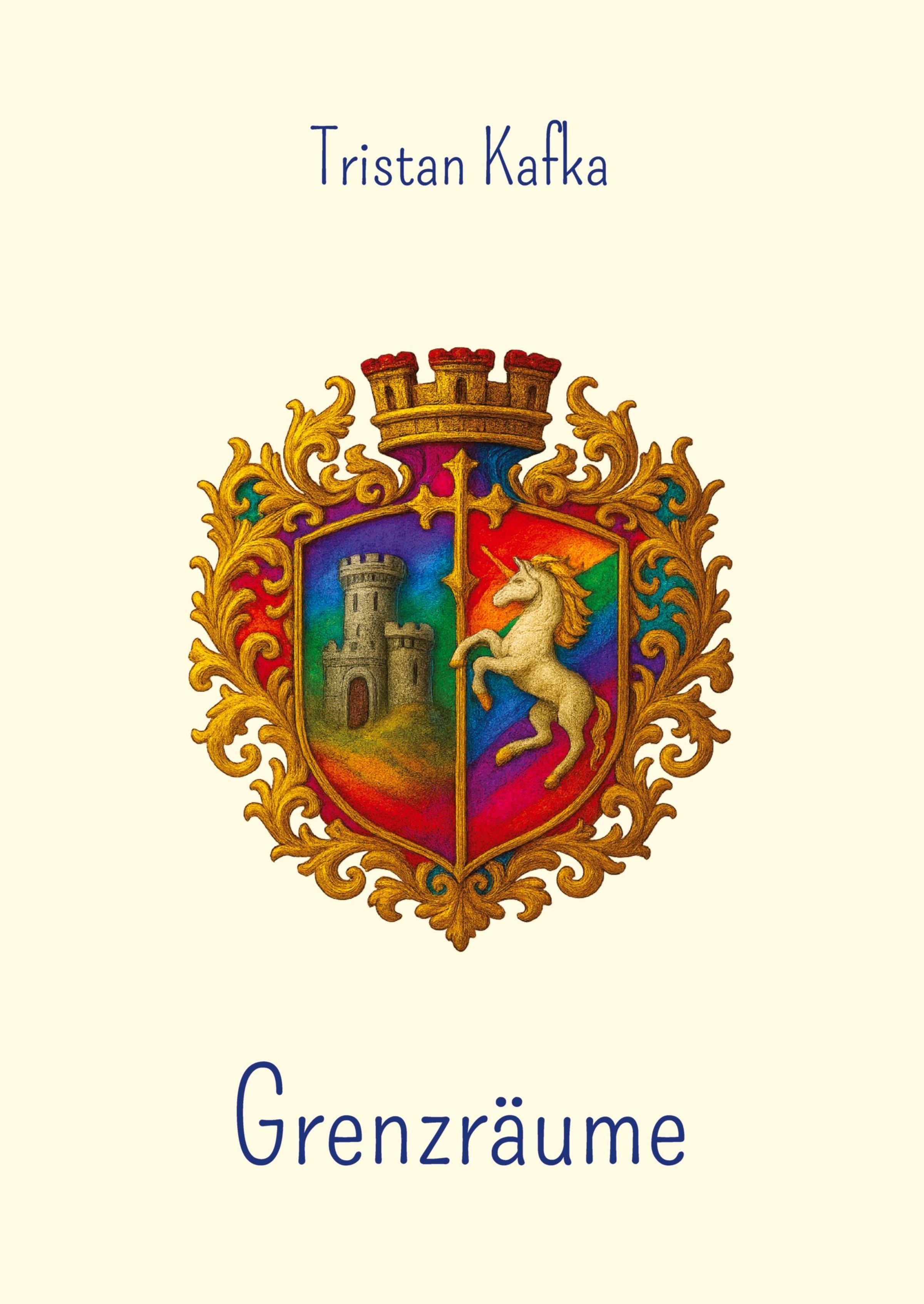 "Tristan Kafka. Grenzräume." Illustration eines bunten Wappens mit einem Einhorn und einer Burg., Buch