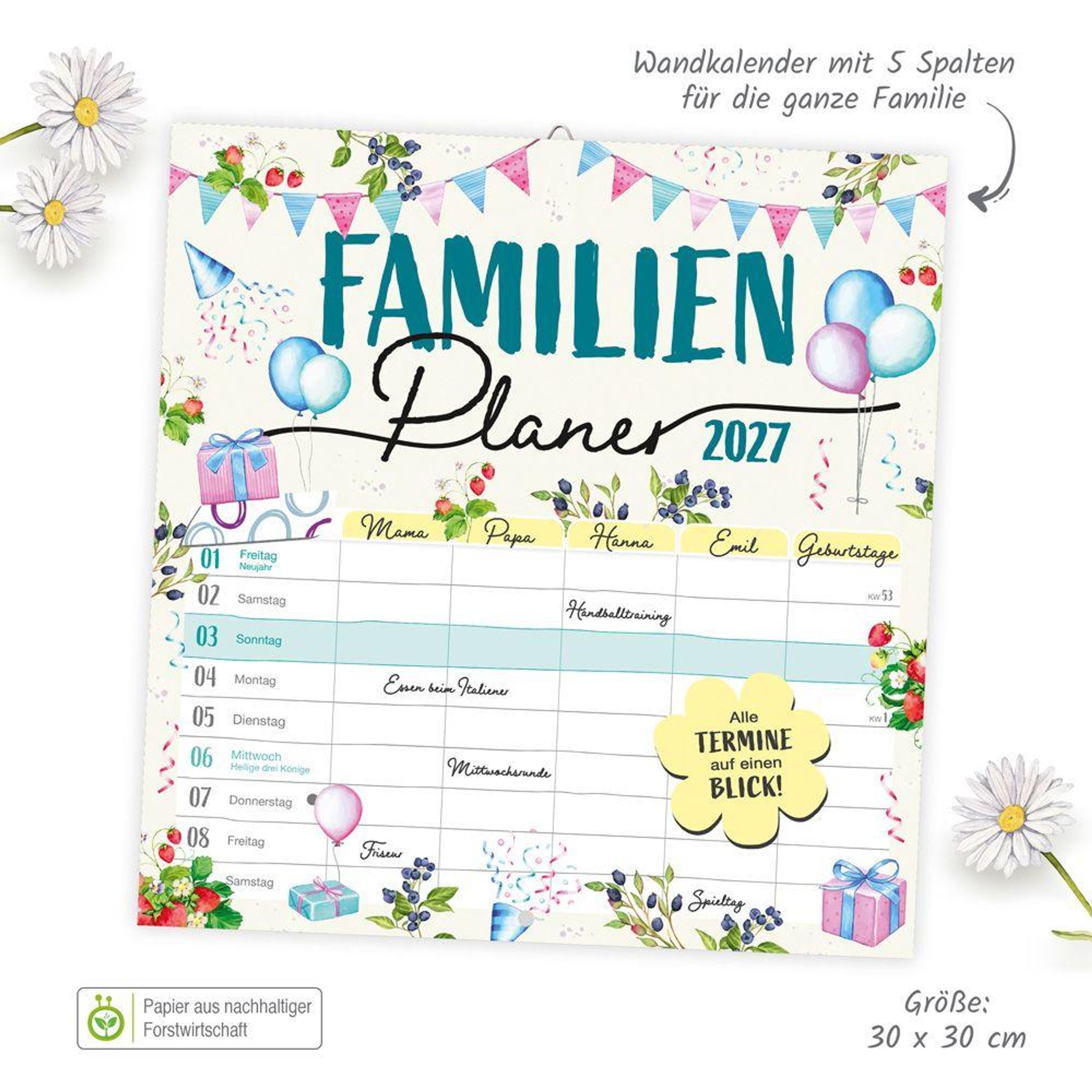 Auch Chaos braucht Platz! Der Broschurkalender mit 5 Spalten für die ganze Familie zeigt alles Wichtige auf einen Blick! Mit seiner fröhlichen Gestaltung, seinem übersichtlichen Kalendarium und jeder Menge Platz für Erinnerungen, Termine und Notizen ist dieser Familienkalender ein unverzichtbarer Alltagshelfer!