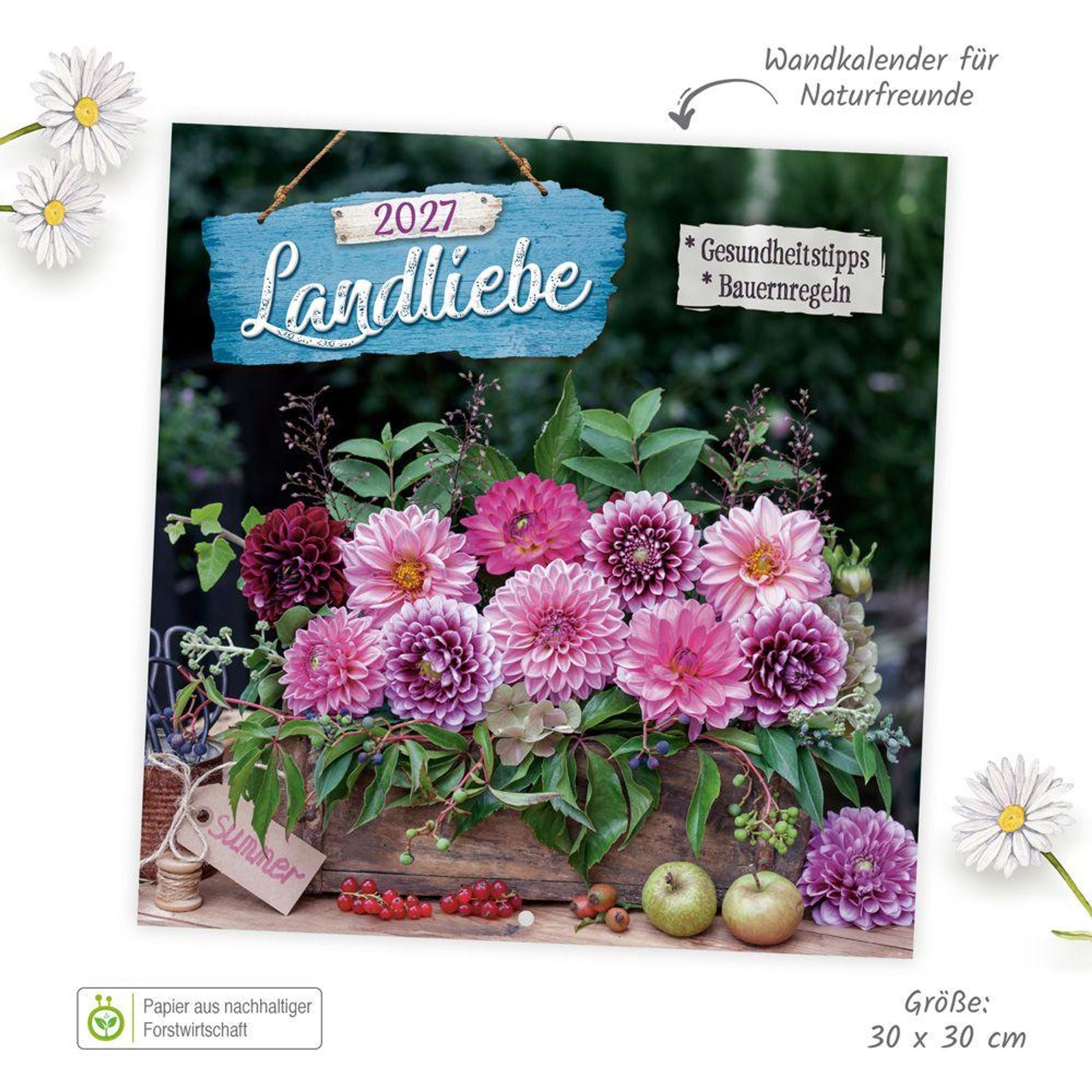 Im Wald, am Feldrand oder im Park um die Ecke - unsere großartige Landschaft umgibt uns zu jeder Zeit. Der dekorative Broschurkalender Landliebe im Format 30 x 30 cm präsentiert jeden Monat herrliche Fotos mit zusätzlichen Informationen. Dank des übersichtlichen Kalendariums mit viel Platz für Termine und Erinnerungen hilft der Kalender wunderbar beim Organisieren des Alltags. Das perfekte Geschenk für alle Naturliebhaber!