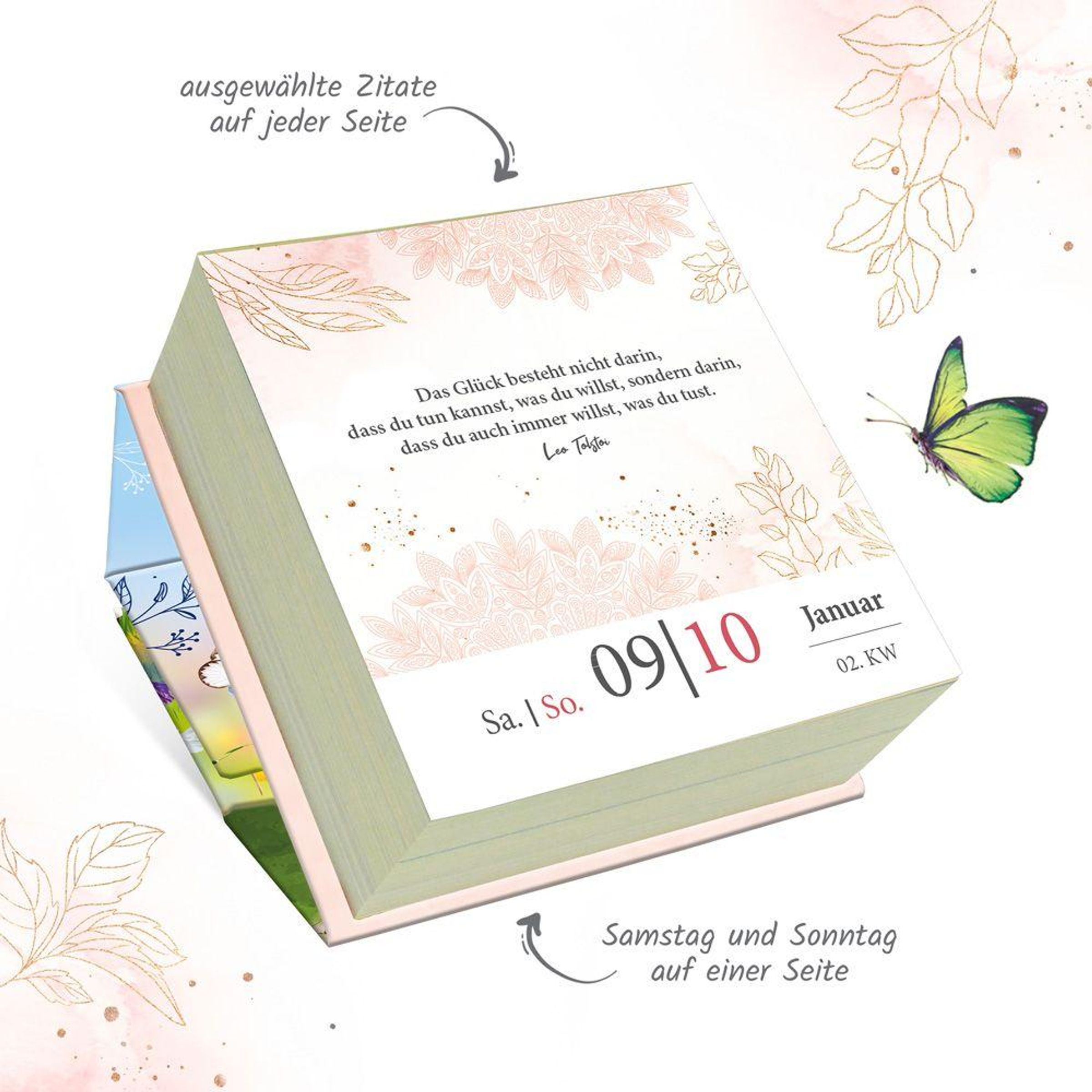 Tag für Tag aufs Neue Inspiration und gute Gedanken bringt unser Geschenk-Abreißblock mit tiefsinnigen Sprüchen, welche die Seele beruhigen und zur Entspannung verhelfen. Stimmungsvolle Bilder unterstützen neben der floralen Hintergrundgestaltung den beruhigenden Effekt und sorgen dafür, dass sich die Alltagsroutine mit einem kurzen Blick auf den Kalender gleich viel leichter nehmen lässt. Das außergewöhnliche Format mit Magnetverschluss ist ein echter Blickfang und schafft ein durchdachtes, liebevolles Geschenk für Freunde, Familie oder die Kollegen.