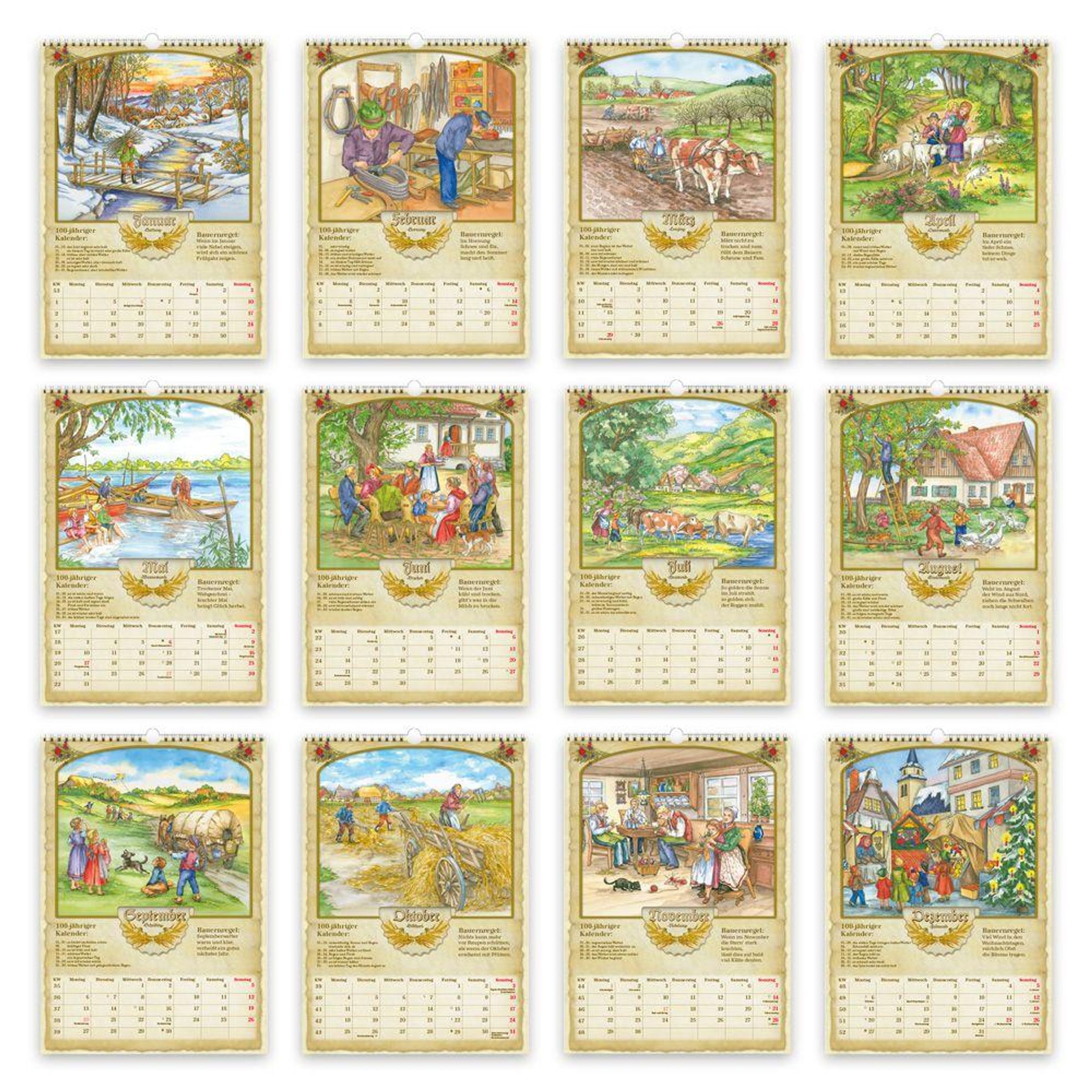 Seit jeher müssen Bauern das Wetter so genau wie möglich vorhersagen können, damit sie zur richtigen Zeit die richtigen Arbeiten verrichten. Früher wurde das Wetter von ihnen genau beobachtet und daraus entstanden die uns heute bekannten Bauernregeln. Wetterabläufe oder die Entwicklung von Obst, Gemüse und Getreide wurden in Form von Reimen festgehalten. Manche der Regeln bilden sogar noch heute gültige, naturwissenschaftliche Gesetzmäßigkeiten ab. Unser beliebter BAUERNKALENDER im Format 30 x 42 cm greift einige der altbewährten Regeln auf und bringt sie in eine schöne Kalenderform. Mit seiner rustikalen Gestaltung, den detailreichen Illustrationen ursprünglichen Bauernlebens, vielen treffenden oder unterhaltsamen Bauernweisheiten sowie Wettervorhersagen auf Grundlage des 100-jährigen Kalenders ist der Kalender informativ im Alltag und wird zu einem echten Schmuckstück in jedem Haus. Dank integriertem Mondkalender, Feiertagen, gut ablesbarem Kalendarium mit Platz für Termine und Erinnerungen hilft er neben all den tollen Zusatzinfos natürlich auch wunderbar beim Organisieren des Alltags. Auf dem Rückcover schließlich befindet sich ein Überblick über die Schulferien aller Bundesländer, damit die Ferientermine aller Freunde und Verwandten auf einen Blick erkennbar sind. Ein herrliches Geschenk um Familie, Freunden, Kollegen oder sich selbst ein ganzes Jahr lang Freude zu schenken. Wandkalender zum Aufhängen Gedruckt auf hochwertigem Bilderdruckpapier Tolle Geschenkidee