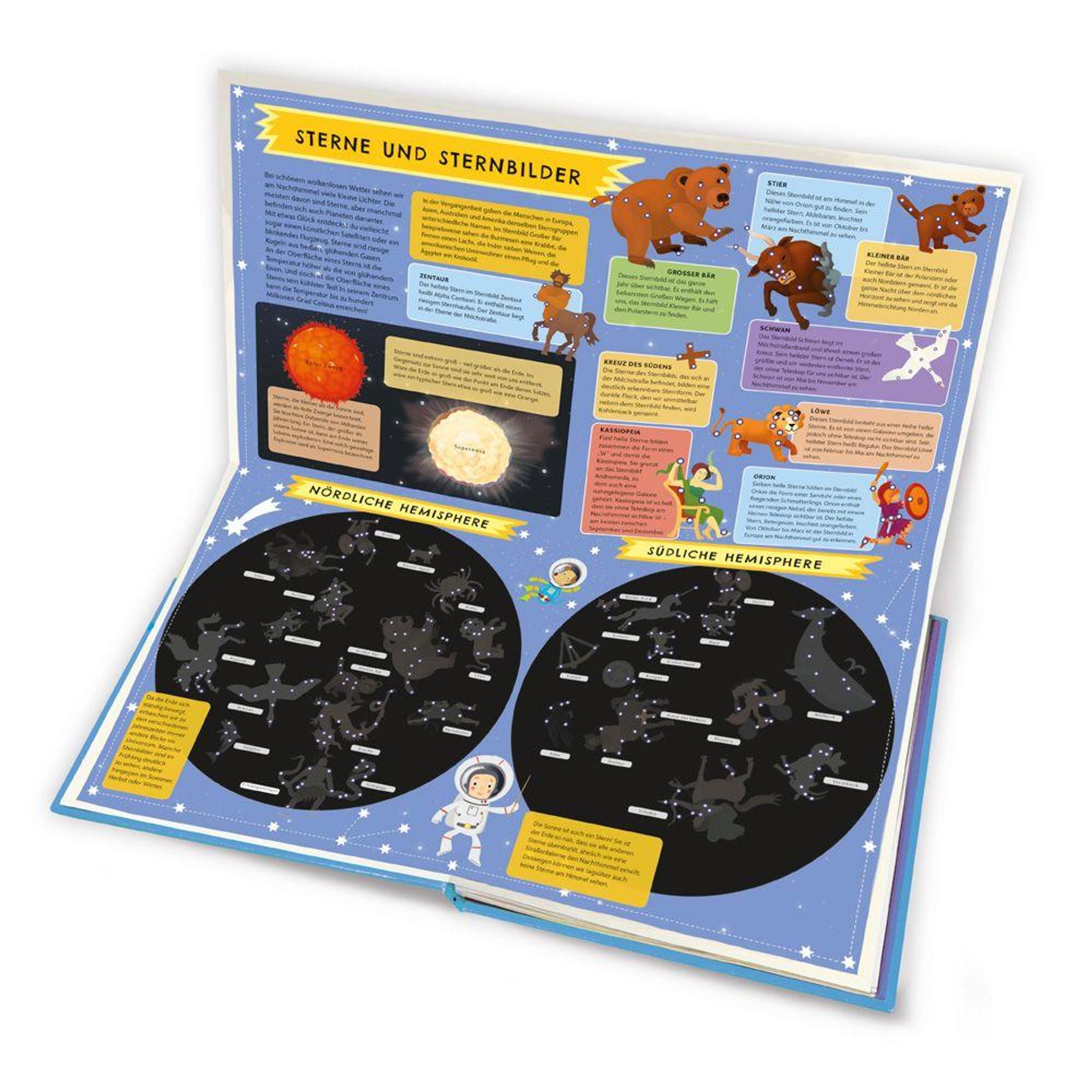 Dieser spannende Atlas eröffnet allen jungen Leserinnen und Lesern einen faszinierenden Blick ins All! Wo liegt das Sternbild der Kassiopeia? Welcher Planet ist der größte in unserem Sonnensystem? Wie lebt es sich auf der ISS? Große Aufklappseiten und Extra-Heftchen bergen viele Fakten und Wissenswertes über die Wunder des Universums, unser Sonnensystem, seine Planeten und Sterne und ihre faszinierende Entstehungsgeschichte. Ein toll illustrierter Atlas mit umfangreichen Informationen für neugierige kleine Entdecker!