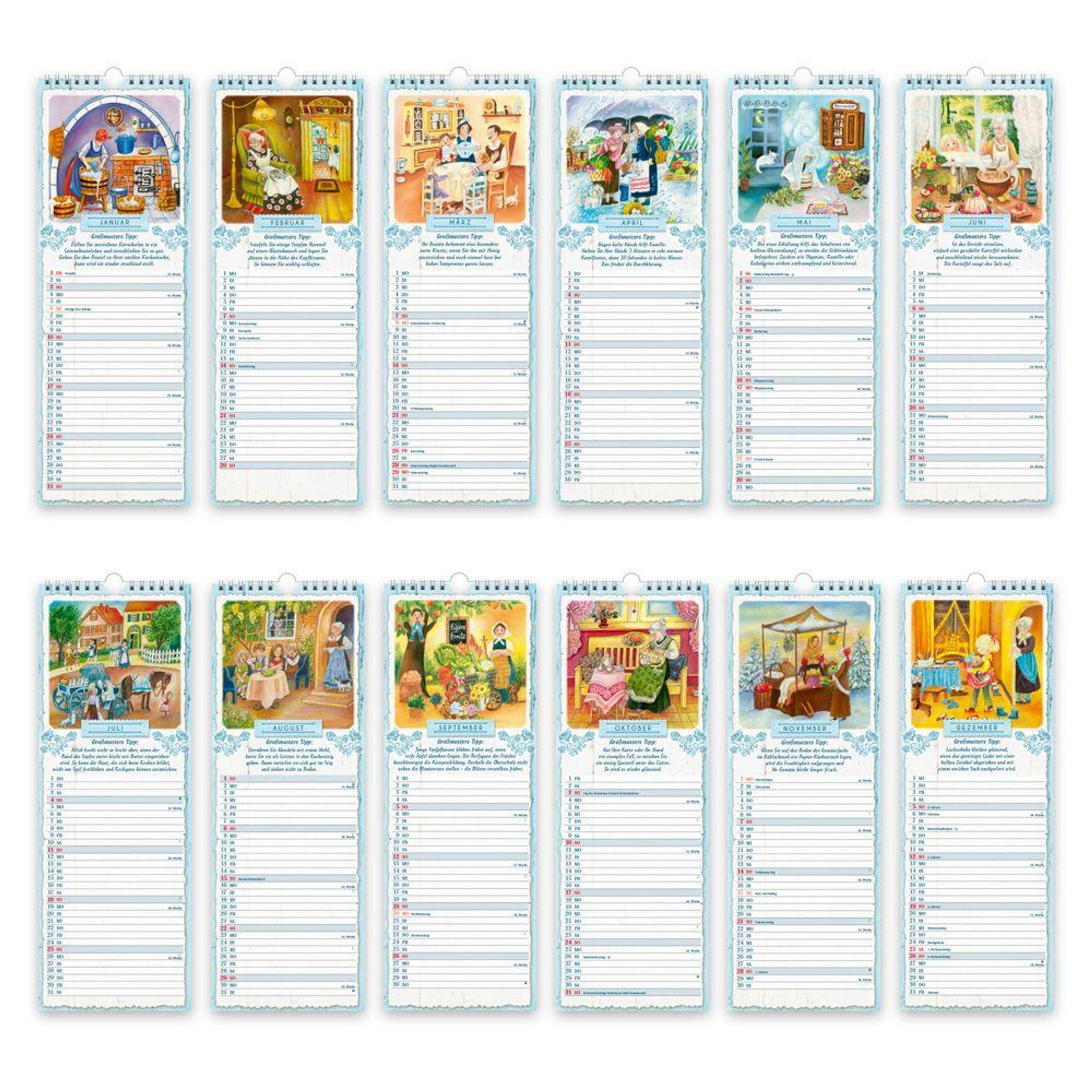 "Gut ist, was satt macht und lecker schmeckt", das hat Oma schon immer gesagt! Ganz im Zeichen dieser Weisheit steht unser Streifenkalender GROSSMUTTERS KÜCHE im Format 15 x 42 cm. Mit seiner dekorativen Gestaltung und den detailreichen Illustrationen alltäglicher Situationen aus den alten Zeiten ist er nicht nur ein echtes Schmuckstück in jedem Haus. Dank der vielen nützlichen Haushaltstipps, dem gut ablesbaren Kalendarium mit markierten Feiertagen, Mondphasen und reichlich Platz für Notizen hilft der Kalender außerdem ganz wunderbar beim Organisieren des Alltags. So kommt ganz leicht Ordnung in Pläne oder Termine und nichts gerät mehr durcheinander - ein hervorragender Begleiter durch ein Jahr voller Pläne und Ideen. Die Rückseiten des Kalenders aber beherbergen den eigentlichen Schatz: traditionelle Rezepte in neuer Interpretation, die sofort das Wasser im Mund zusammenlaufen lassen und zum Nachkochen und Ausprobieren einladen. So verbreitet sich automatisch gesunder Appetit und gute Laune. Auf dem Rückcover befindet sich noch ein Überblick über die Schulferien aller Bundesländer, damit die Ferientermine aller Freunde und Verwandten auf einen Blick erkennbar sind. Das perfekte Präsent um Familienmitgliedern, Freunden, Kollegen oder sich selbst ein ganzes Jahr lang Freude, Inspiration und gesunden Appetit zu schenken.