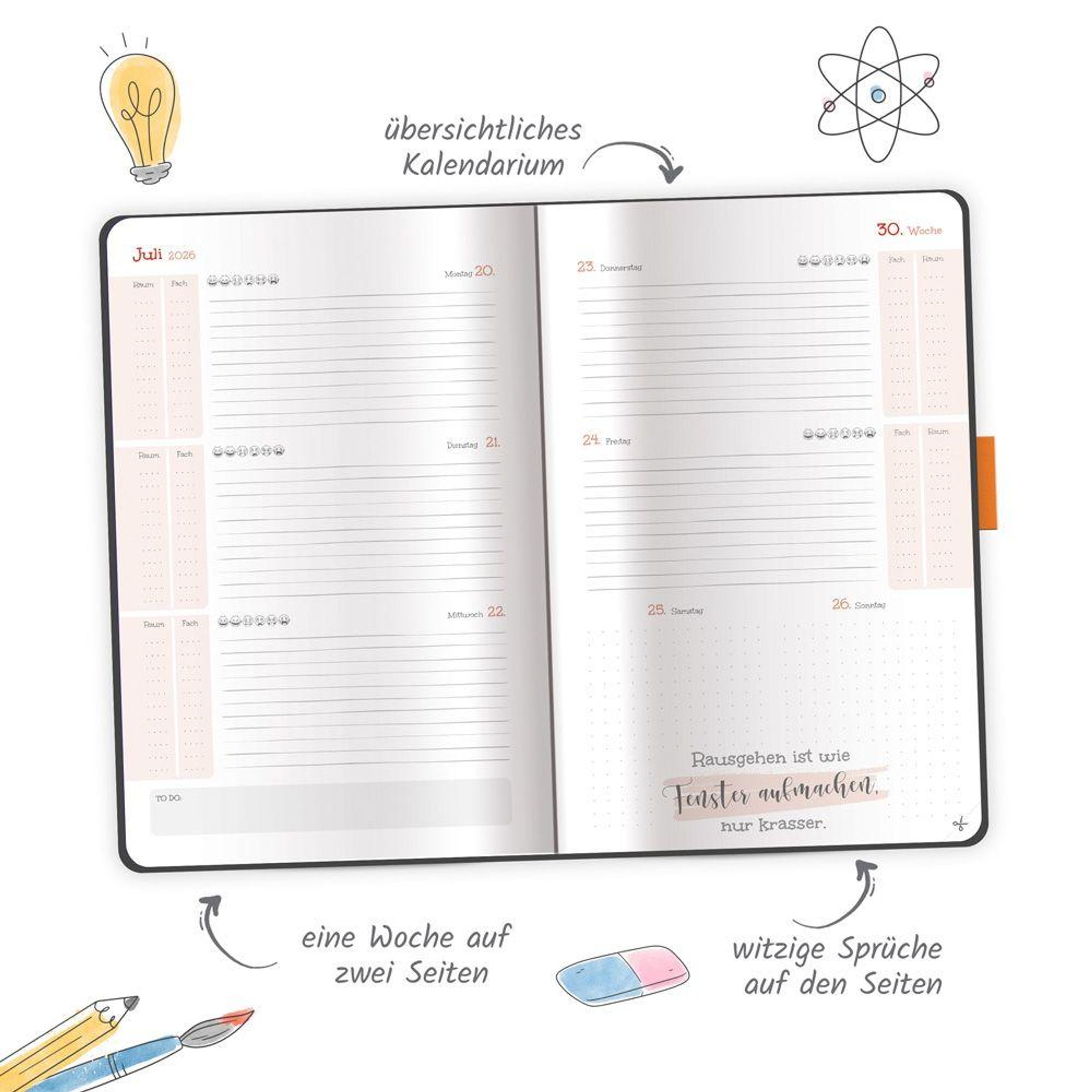 Dieser Schülerkalender für 2026 / 27besitzt einen flexiblen und zugleich stabilen Einband mit Spot-Effekt. Er ist ca. 13 x 20 cm groß und bietet auf 128 Seiten genügend Platz für wichtige Notizen und Termine. Für Stundenpläne, Noten, Schulferien, Adressen, Geburtstage usw. gibt es Extra-Seiten. Durch die seitlich angebrachte Gummischlaufe ist dein Lieblingsstift immer griffbereit und die Innentasche des Planers bietet ausreichend Platz für deine Notizzettel. Mit einem Gummiband kann der Timer verschlossen werden, so dass er nicht ungewollt aufblättern kann.