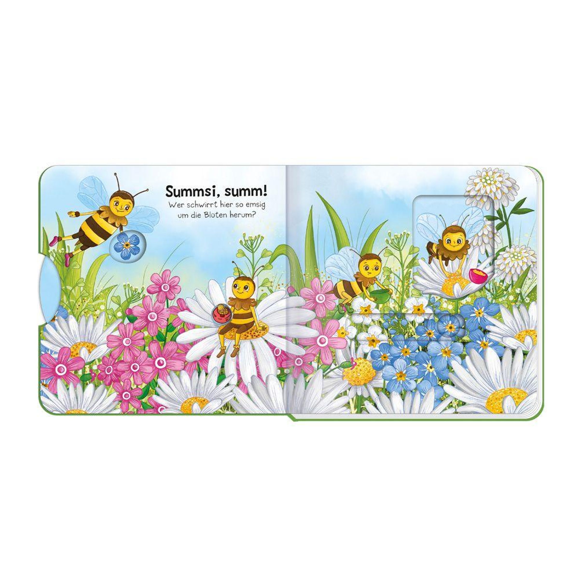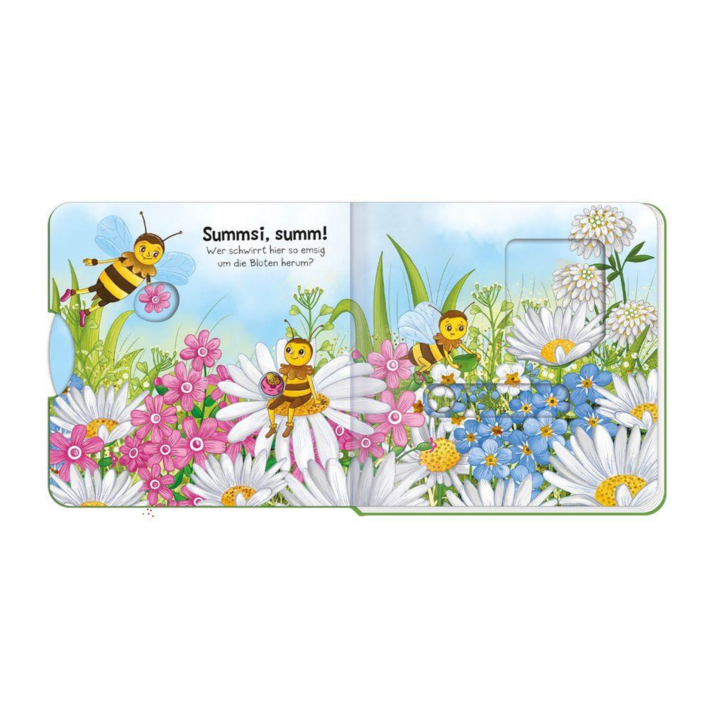 Schau, wer sich hier versteckt! Bewege die Schieber und entdecke die kleinen Bewohner der Wiese bei ihren Abenteuern! Mit tollen Glanzeffekten auf dem Cover und allen Innenseiten.
