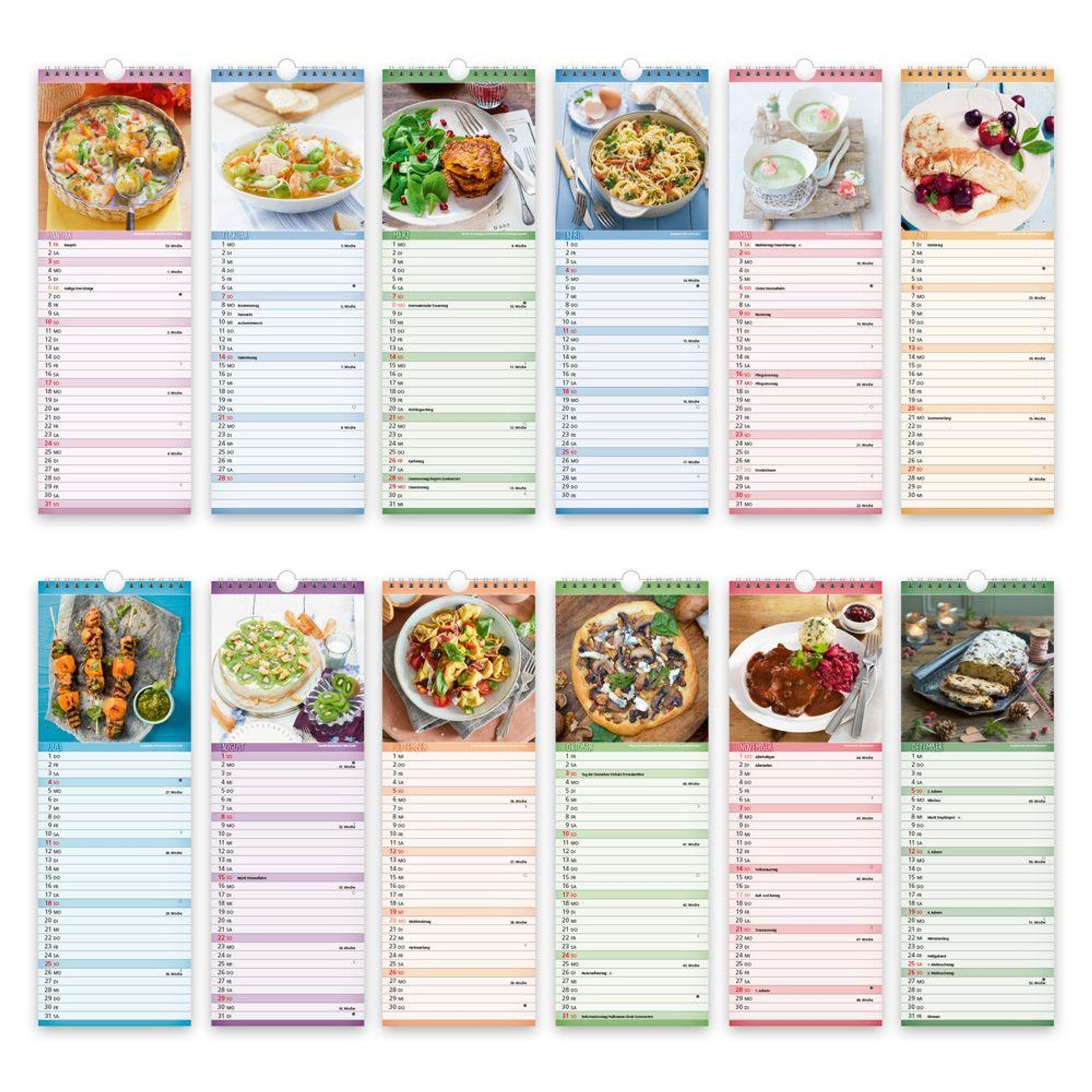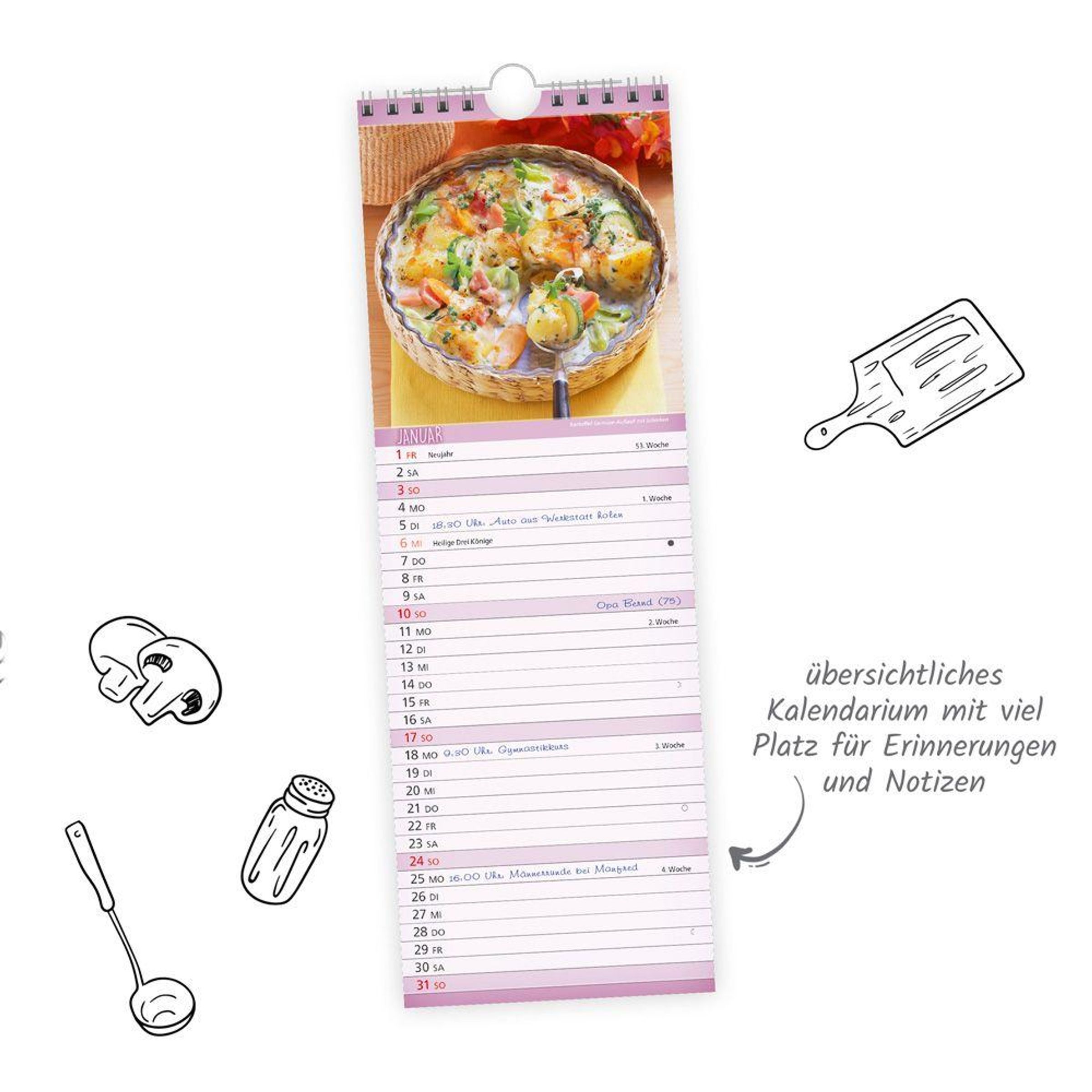 Satt werden ist das eine, aber echte Genießer wissen: Das Auge isst mit! Unser Streifenkalender KÜCHENNOTIZ im Format 12 x 35 bringt modern interpretierte Klassiker der deutschen Küche und frische Rezeptideen zum bewussten Schlemmen zusammen und dekorativ zur Geltung. Verführerische Fotos lassen sofort das Wasser im Mund zusammenlaufen und machen Lust auf feinste Gaumenfreuden. Ein echter Hingucker, der immer für Gesprächsstoff und gute Laune sorgt, egal ob in den eigenen vier Wänden oder im Büro. Die Rückseiten des Kalenders beherbergen den eigentlichen Schatz: die leckeren Rezeptideen zum Nachkochen und Ausprobieren. Dank gut ablesbaren Kalendariums, markierter Feiertage, Mondphasen und reichlich Platz für Notizen hilft der Kalender außerdem ganz wunderbar beim Organisieren des Alltags. So kommt ganz leicht Ordnung in Pläne oder Termine und nichts gerät mehr durcheinander - ein hervorragender Begleiter durch ein Jahr voller Pläne und Ideen. Auf dem Rückcover schließlich befindet sich ein Überblick über die Schulferien aller Bundesländer, damit die Ferientermine aller Freunde und Verwandten auf einen Blick erkennbar sind. Das perfekte Geschenk um Familie, Freunden, Kollegen oder sich selbst ein ganzes Jahr lang Freude, Inspiration und gesunden Appetit zu schenken.