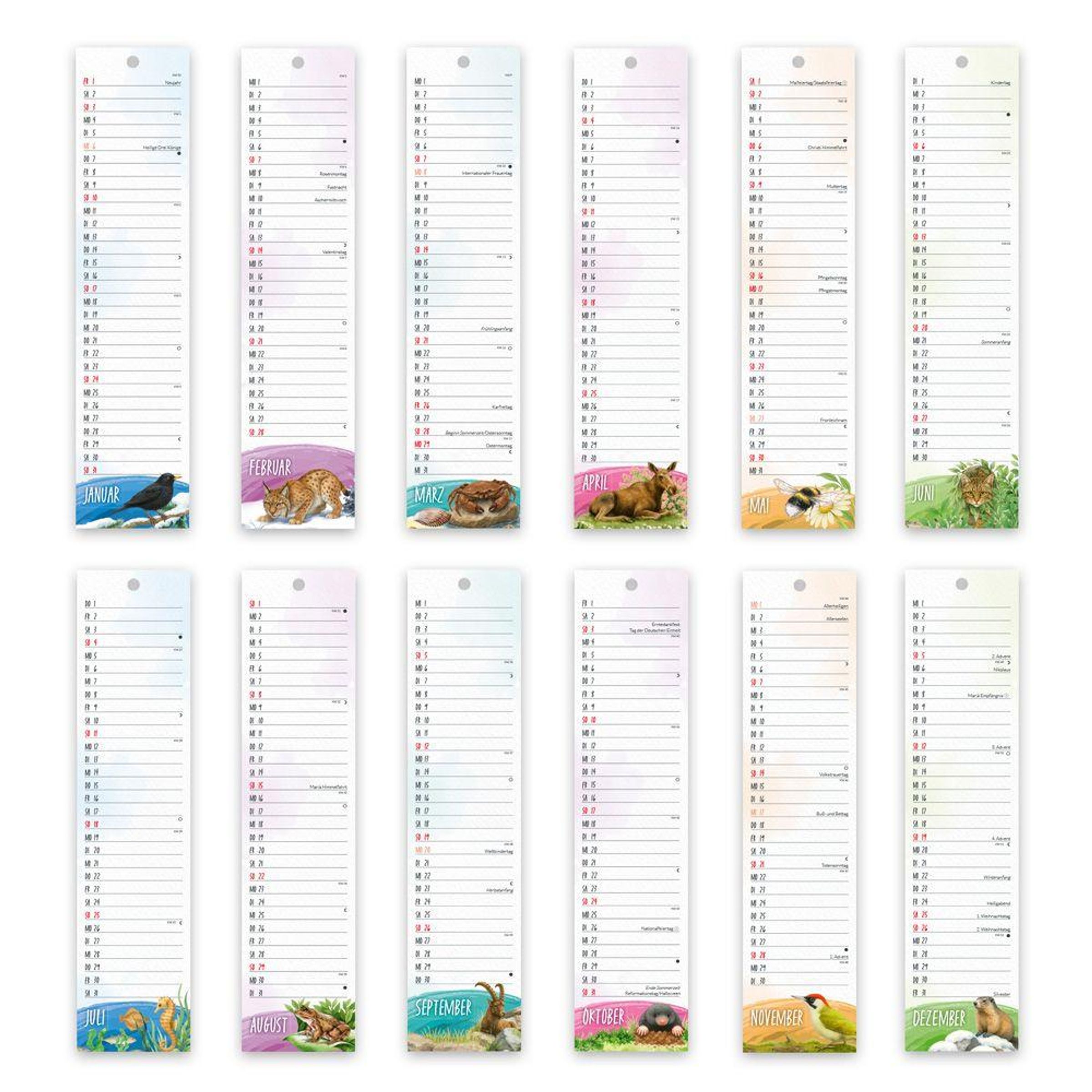 Dieser Streifenkalender im Mini-Format hat nicht nur ein übersichtliches Kalendarium mit Platz für Termine und Erinnerungen. Die Rückseiten bieten interessantes Wissen zu unseren heimischen Tieren. Neben den Tier-Steckbriefen gibt es Informationen und praktische Tipps zum Umgang mit den Tieren. Der Kalender ist besonders umweltfreundlich - ohne die Klammer ist er zu 100 % recycelbar. Die zauberhaften Aquarelle machen den Wandkalender zu einem echten Hingucker!