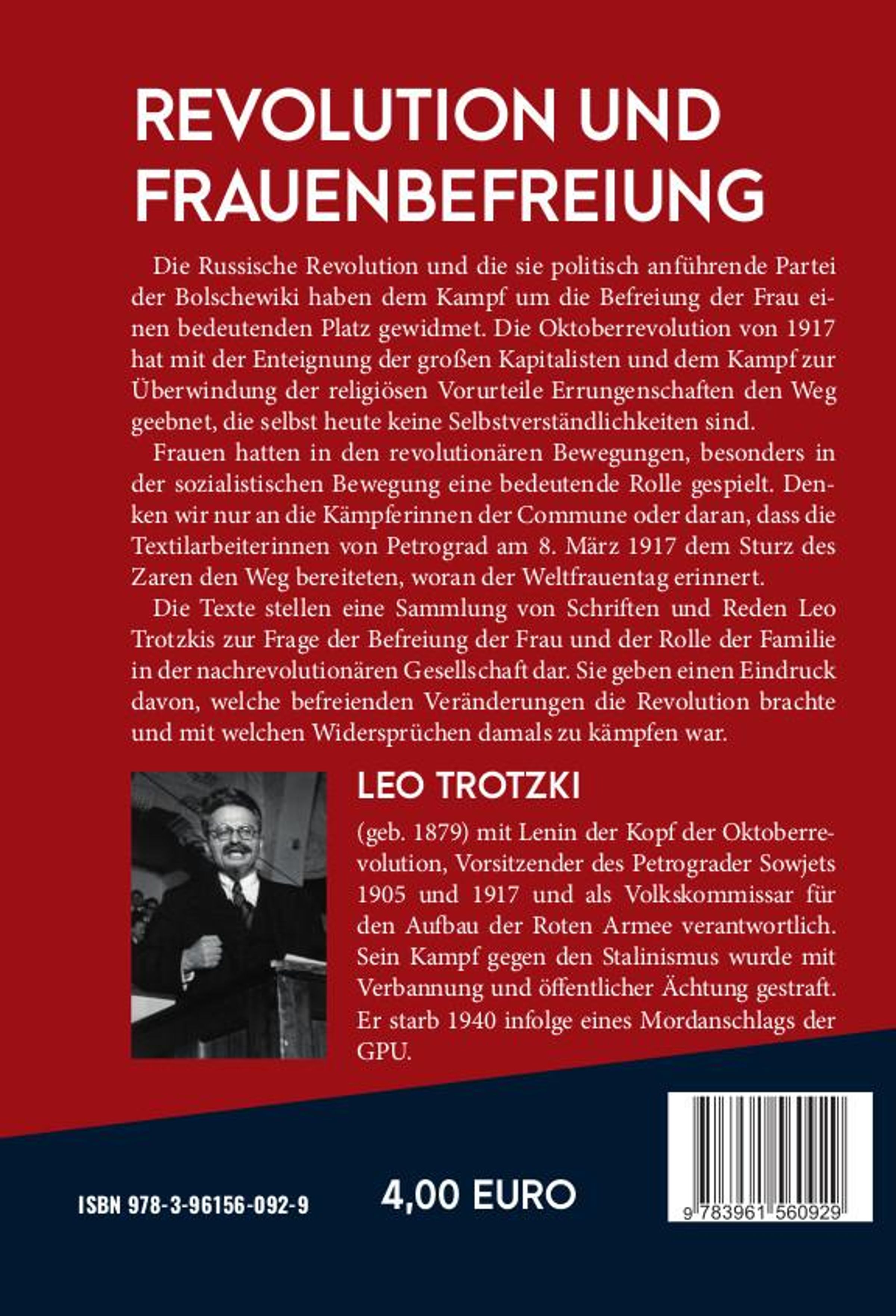 Die Russische Revolution und die sie politisch anführende Partei der Bolschewiki haben dem Kampf um die Befreiung der Frau einen bedeutenden Platz gewidmet. Die Oktoberrevolution von 1917 hat mit der Enteignung der großen Kapitalisten und dem Kampf zur Überwindung der religiösen Vorurteile Errungenschaften den Weg geebnet, die selbst heute keine Selbstverständlichkeiten sind. Frauen hatten in den revolutionären Bewegungen, besonders in der sozialistischen Bewegung eine bedeutende Rolle gespielt. Denken wir nur an die Kämpferinnen der Commune oder daran, dass die Textilarbeiterinnen von Petrograd am 8. März 1917 dem Sturz des Zaren den Weg bereiteten, woran der Weltfrauentag erinnert. Die Texte stellen eine Sammlung von Schriften und Reden Leo Trotzkis zur Frage der Befreiung der Frau und der Rolle der Familie in der nachrevolutionären Gesellschaft dar. Sie geben einen Eindruck davon, welche befreienden Veränderungen die Revolution brachte und mit welchen Widersprüchen damals zu kämpfen war.
