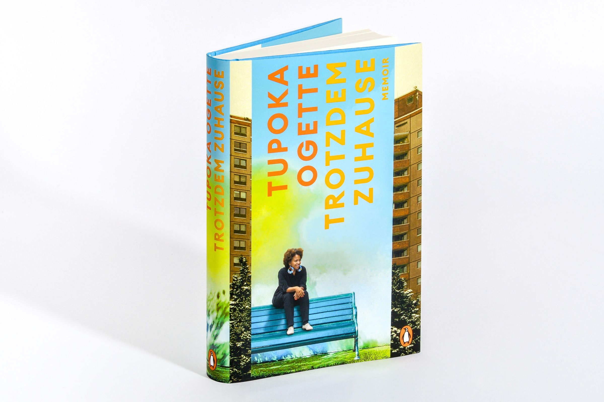 Text: "Tupoka Ogette Trotzdem Zuhause Memoir". Frau auf Bank, Hochhäuser im Hintergrund. Logo mit Pinguin unten rechts., Buch
