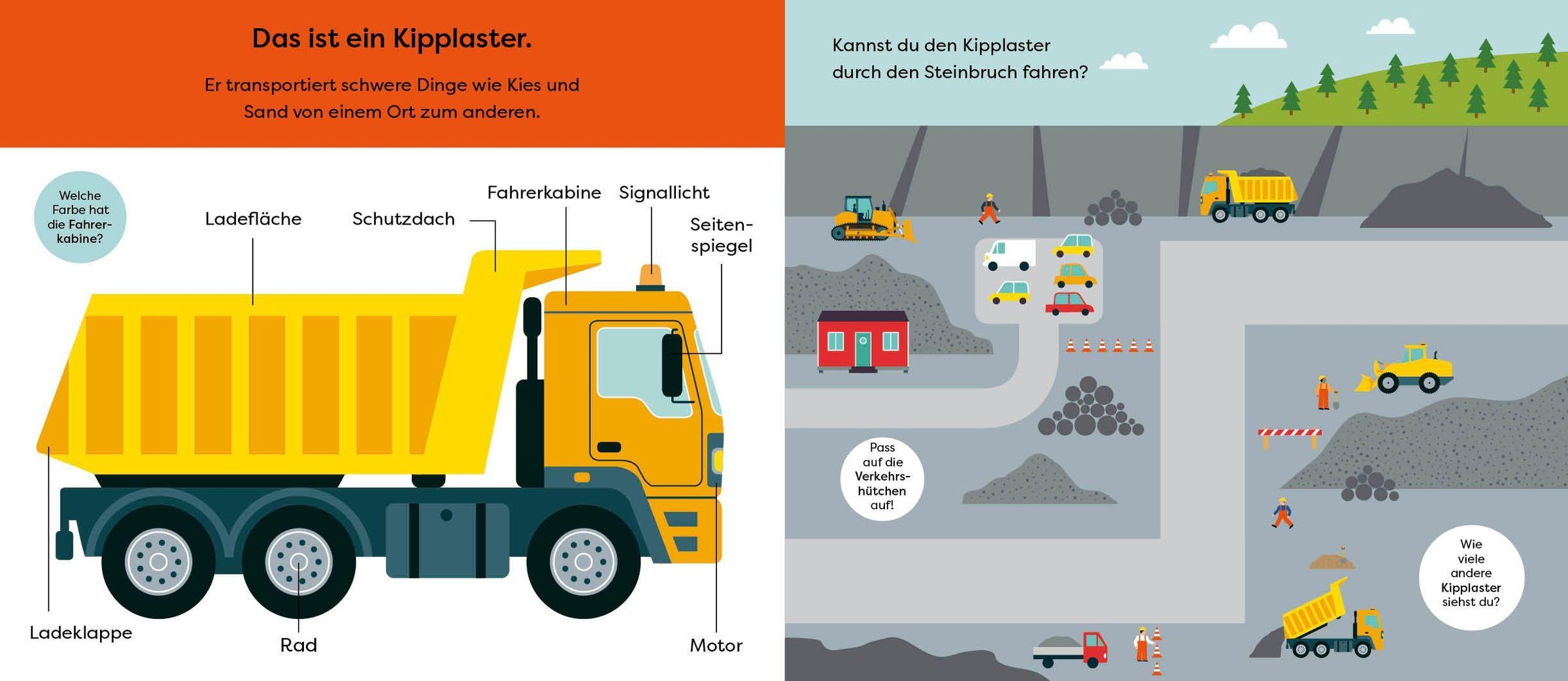Dieses Pappbilderbuch lässt kleine Fahrzeugfans ab 18 Monaten Bagger, Kipplaster, Betonmischlaster und Co. selbst über die Seiten schieben und die Baustelle erkunden. Dabei werden spielerisch Feinmotorik und Koordinationgefördert. Kleine Fragen auf jeder Seite regen zusätzlich zum Entdecken von Stadt und Land an.