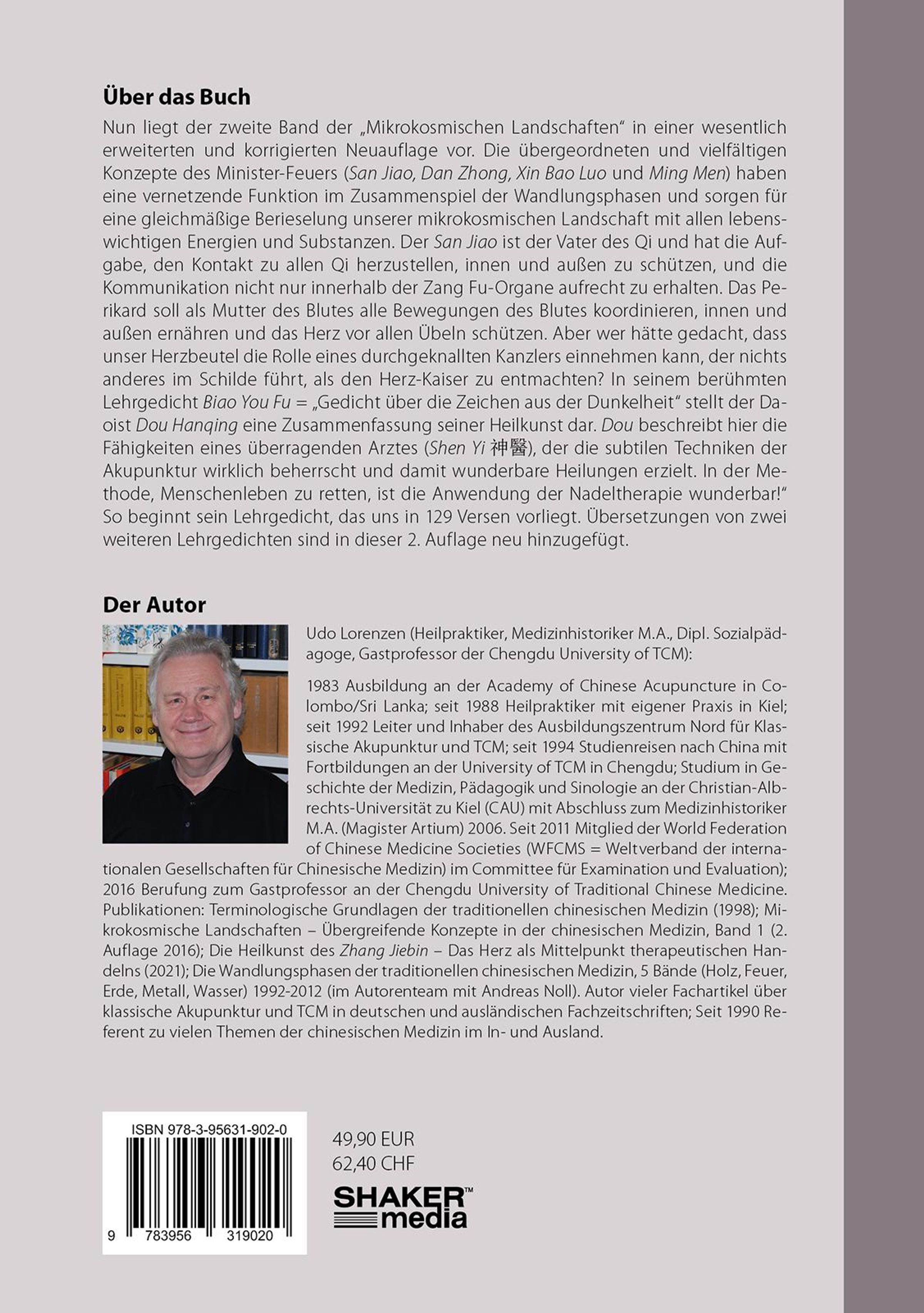 Nun liegt der zweite Band der "Mikrokosmischen Landschaften" in einer wesentlich erweiterten und korrigierten Neuauflage vor. Die übergeordneten und vielfältigen Konzepte des Minister-Feuers (San Jiao, Dan Zhong, Xin Bao Luo und Ming Men) haben eine vernetzende Funktion im Zusammenspiel der Wandlungsphasen und sorgen für eine gleichmäßige Berieselung unserer mikrokosmischen Landschaft mit allen lebenswichtigen Energien und Substanzen. Der San Jiao ist der Vater des Qi und hat die Aufgabe, den Kontakt zu allen Qi herzustellen, innen und außen zu schützen, und die Kommunikation nicht nur innerhalb der Zang Fu-Organe aufrecht zu erhalten. Das Perikard soll als Mutter des Blutes alle Bewegungen des Blutes koordinieren, innen und außen ernähren und das Herz vor allen Übeln schützen. Aber wer hätte gedacht, dass unser Herzbeutel die Rolle eines durchgeknallten Kanzlers einnehmen kann, der nichts anderes im Schilde führt, als den Herz-Kaiser zu entmachten? In seinem berühmten Lehrgedicht Biao You Fu = "Gedicht über die Zeichen aus der Dunkelheit" stellt der Daoist Dou Hanqing eine Zusammenfassung seiner Heilkunst dar. Dou beschreibt hier die Fähigkeiten eines überragenden Arztes (Shen Yi ), der die subtilen Techniken der Akupunktur wirklich beherrscht und damit wunderbare Heilungen erzielt. In der Methode, Menschenleben zu retten, ist die Anwendung der Nadeltherapie wunderbar!" So beginnt sein Lehrgedicht, das uns in 129 Versen vorliegt. Übersetzungen von zwei weiteren Lehrgedichten sind in dieser 2. Auflage neu hinzugefügt.