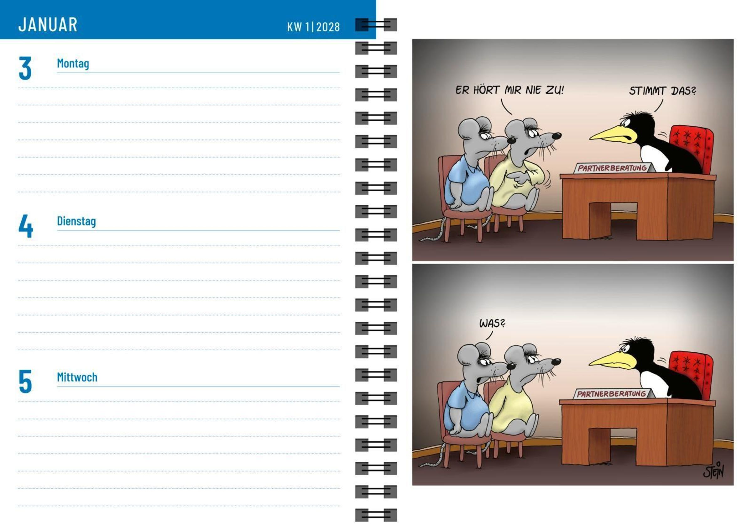 Mit Witz, Cartoons und viel Platz überzeugt dieser Wochenkalender von Uli Stein.