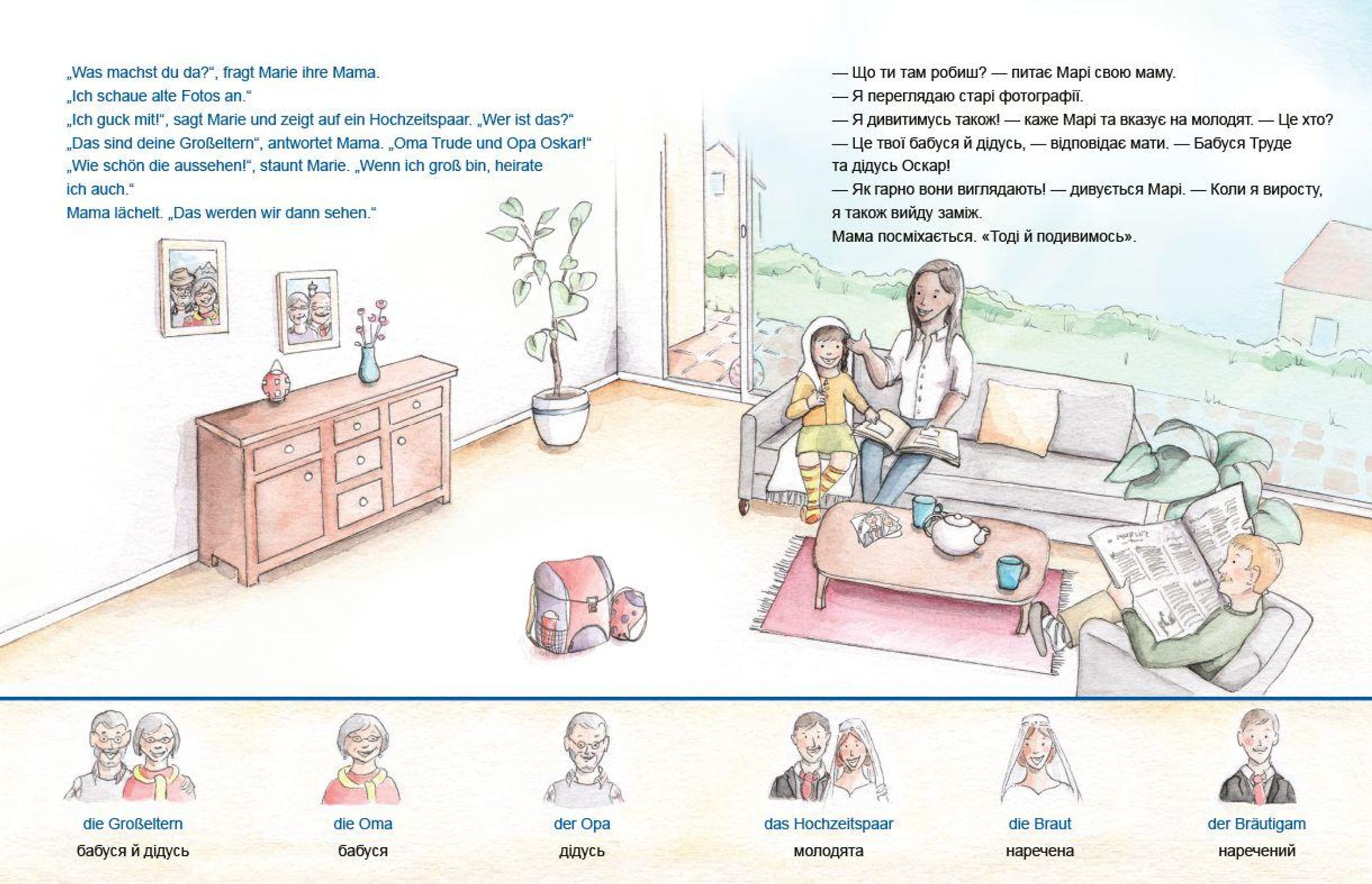 Marie freut sich! Ihre ganze Familie kommt zum Hochzeitstag der Großeltern zu einer Feier zusammen: Tanten und Onkel, Cousins und Cousinen, Schwäger und Schwägerinnen. Mit dieser kleinen Geschichte lernen Kinder die wichtigsten Verwandtschaftsbezeichnungen in zwei Sprachen. Farbenfrohe Illustrationen laden zum Betrachten ein und eine Wort-Bild-Leiste auf jeder Seite greift wichtige Gegenstände erneut auf und fördert gezielt das Suchen, Finden und Benennen. Das Buch ist in weiteren Sprachfassungen - immer in Kombination mit Deutsch - erhältlich.