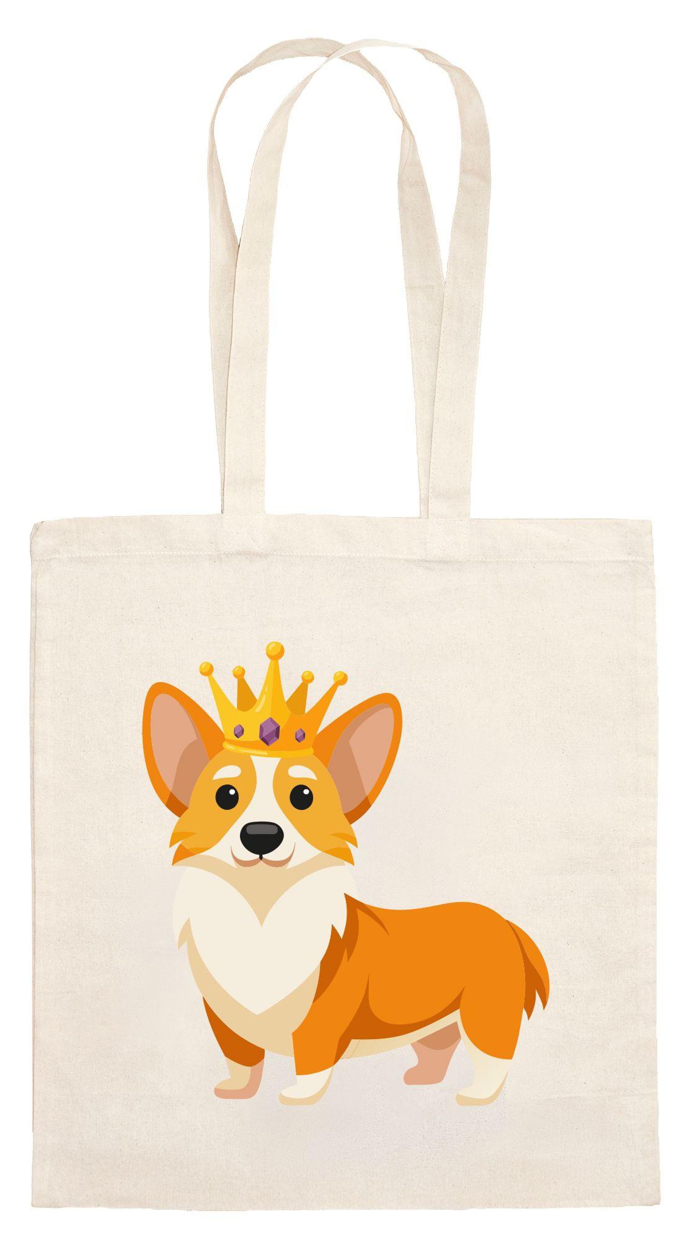 Illustration: Ein niedlicher Corgi mit einer Krone steht auf einer hellen Tragetasche., Diverse