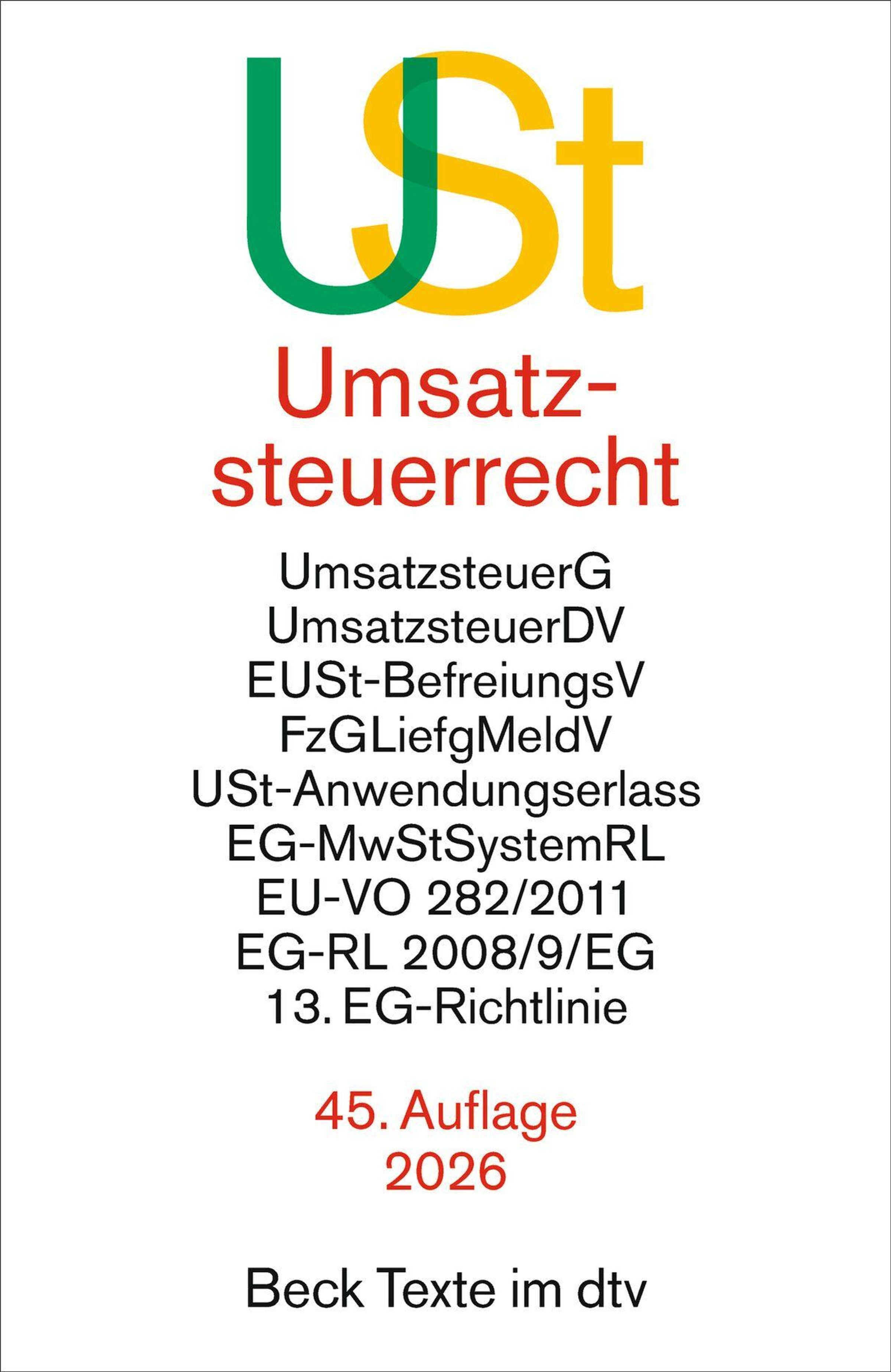 USt, Umsatzsteuerrecht, 45. Auflage, 2026, Beck Texte im dtv. Bunte Buchstaben USt bilden ein Logo., Buch