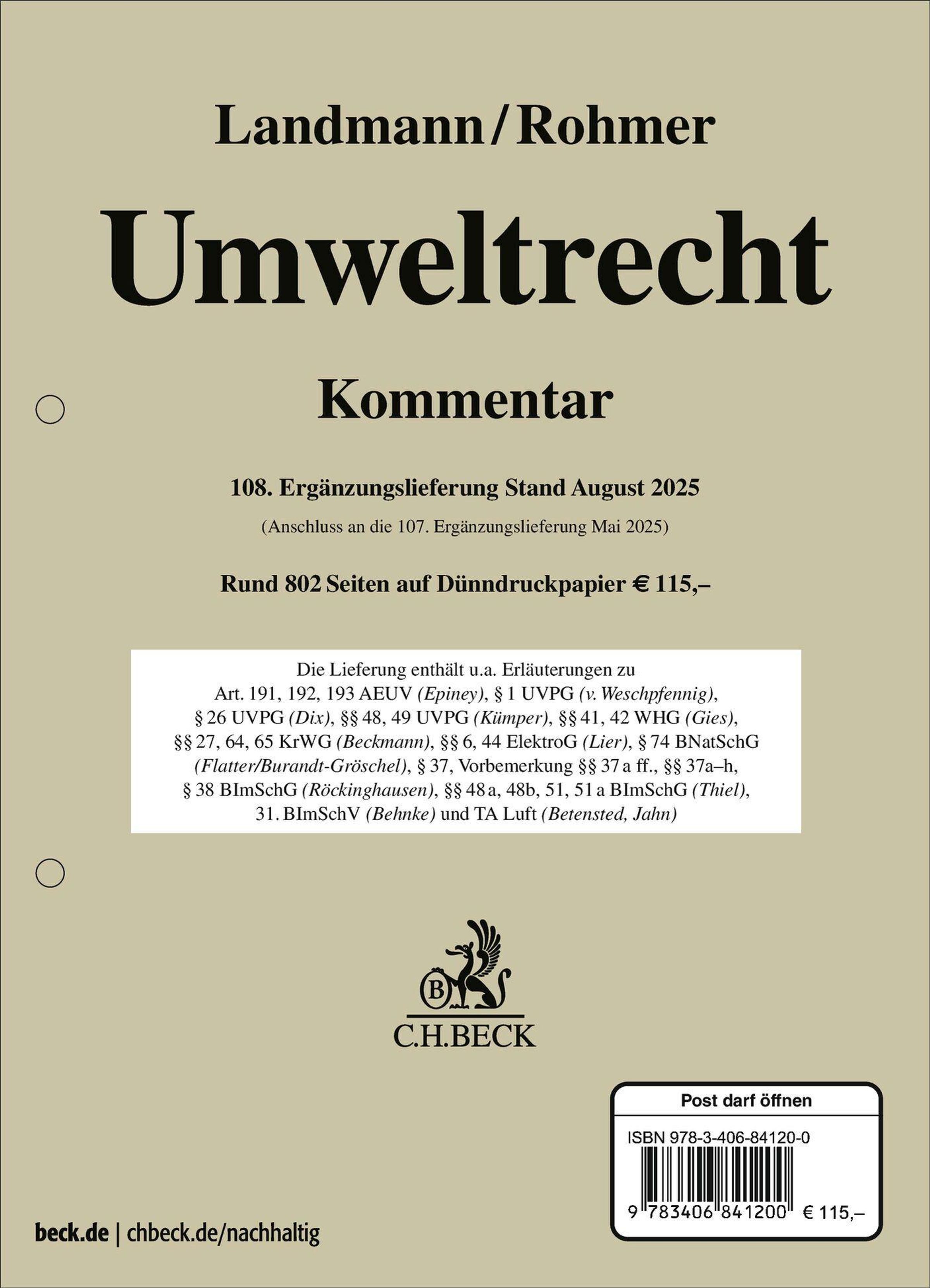 Umweltrecht 108. Ergänzungslieferung, Blätter