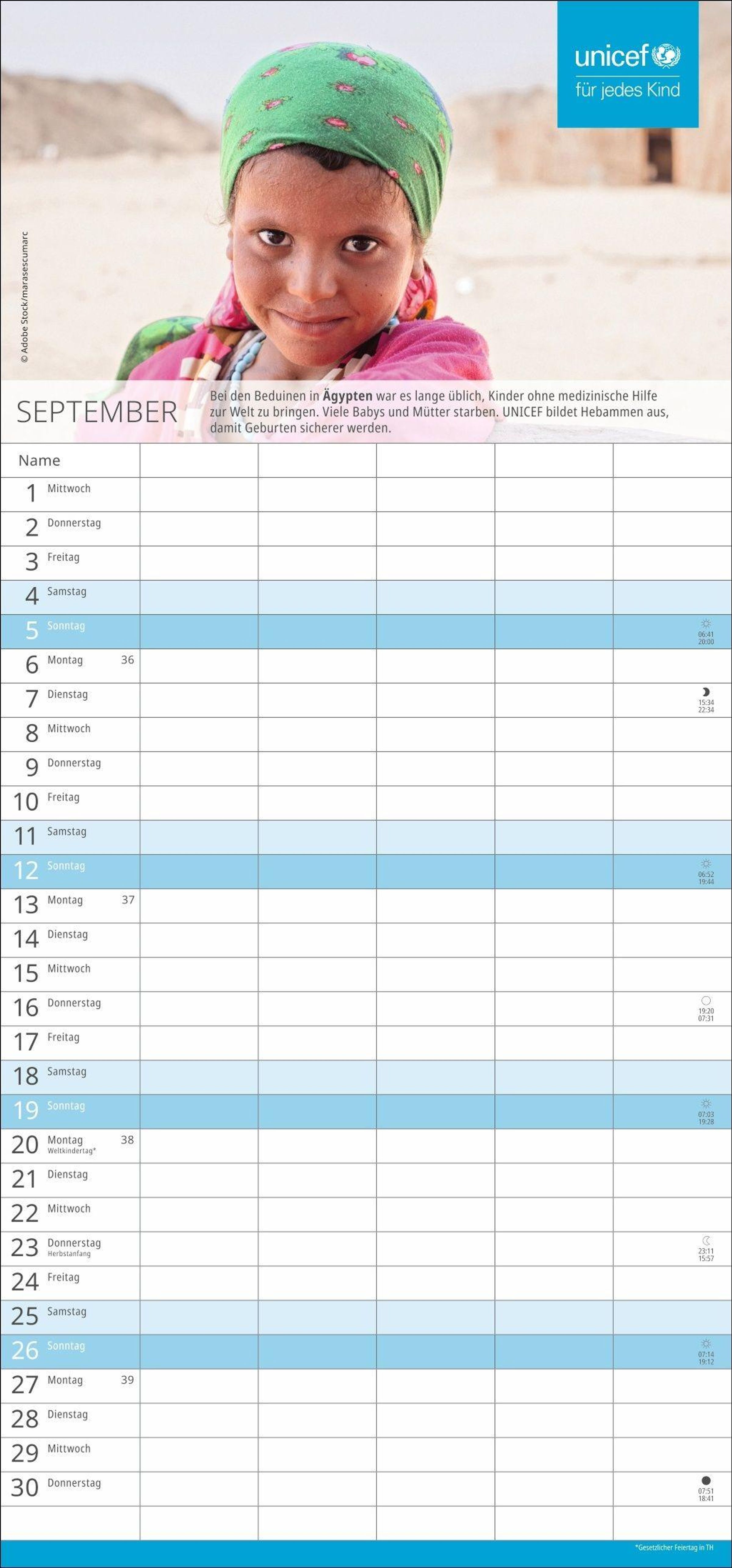 - Kinder der Welt: praktischer Kalender des Kinderhilfswerks mit fünf Spalten. Terminkalender für die Wand. Format 21 x 45 cm