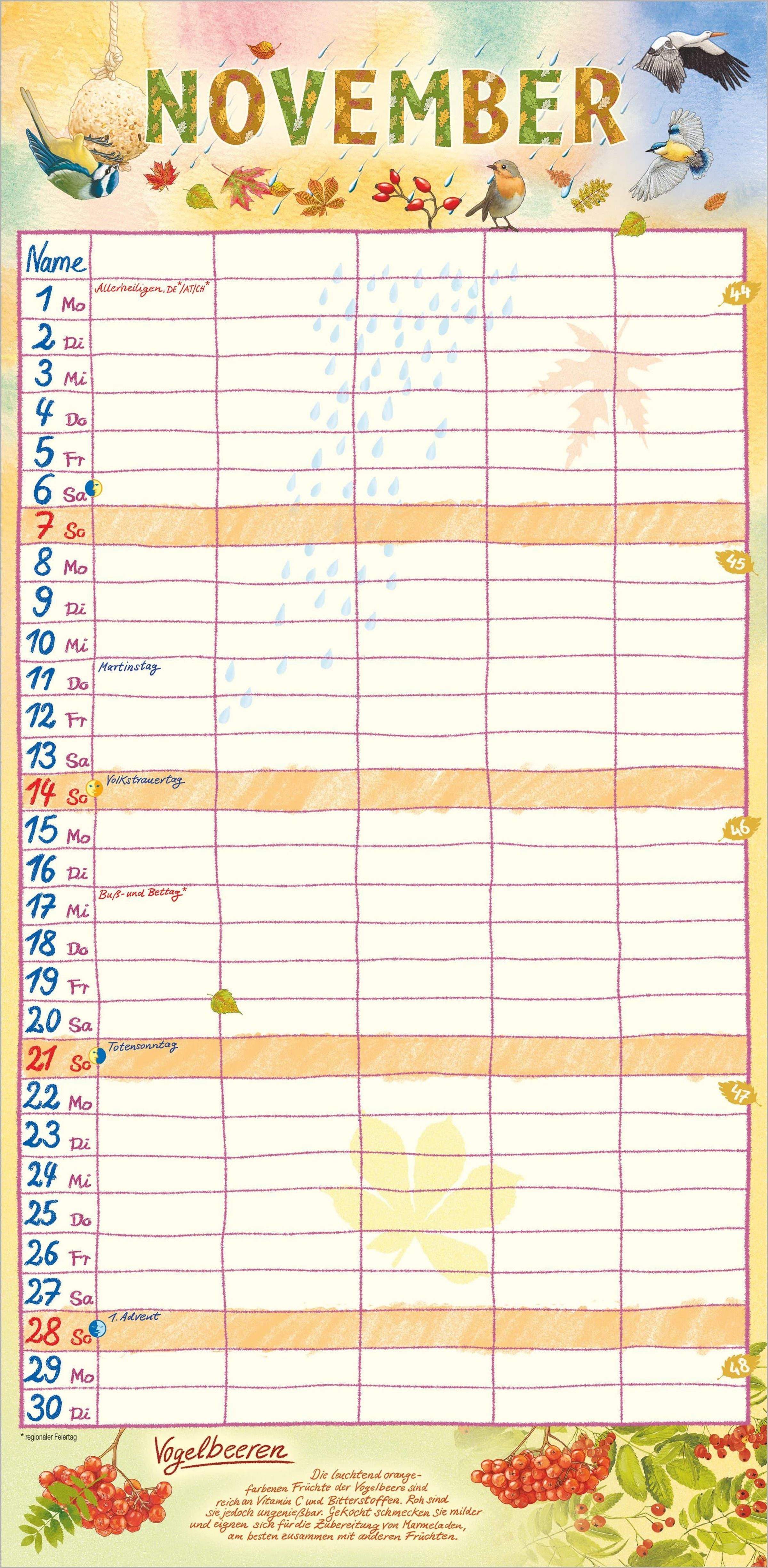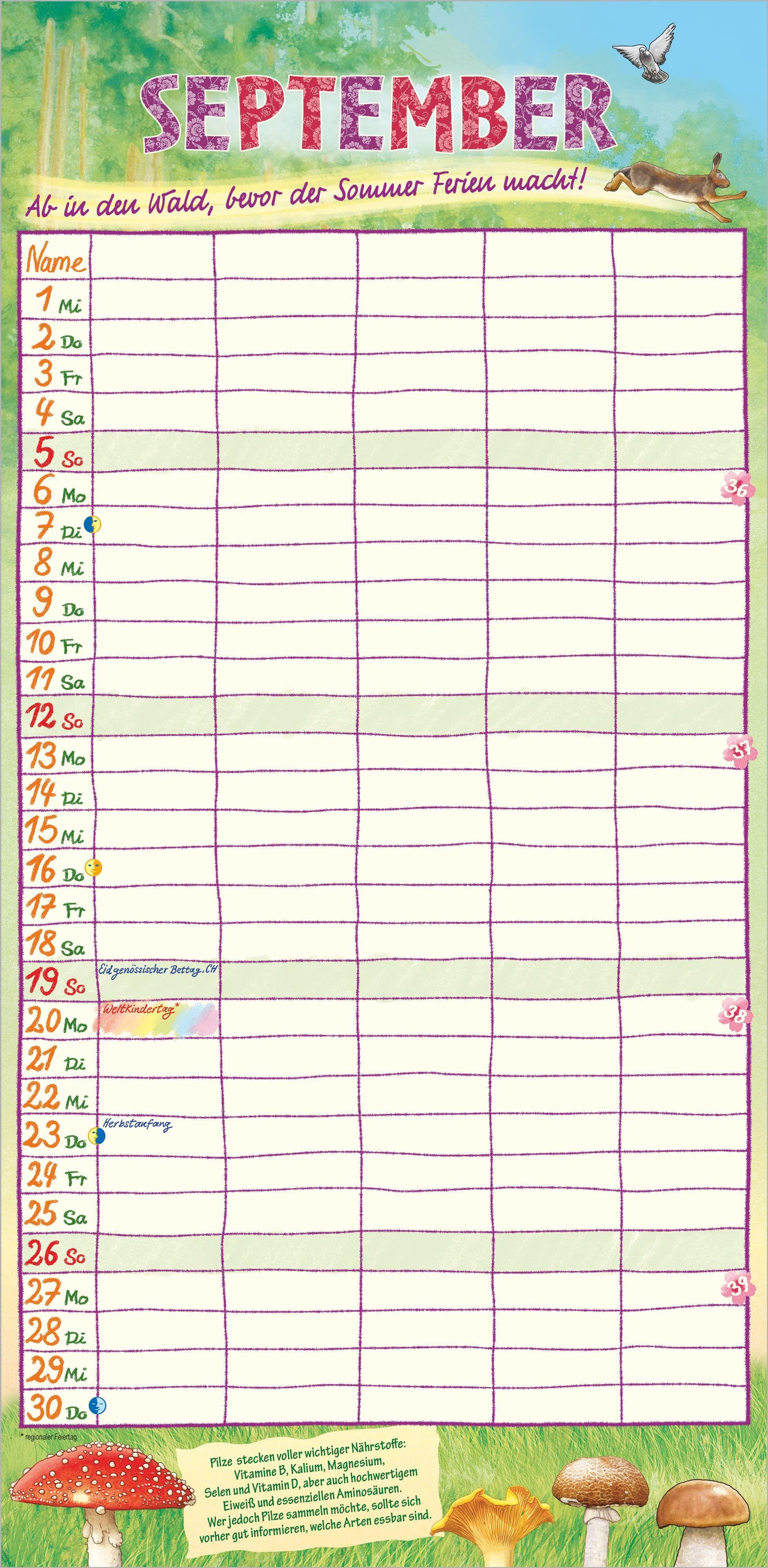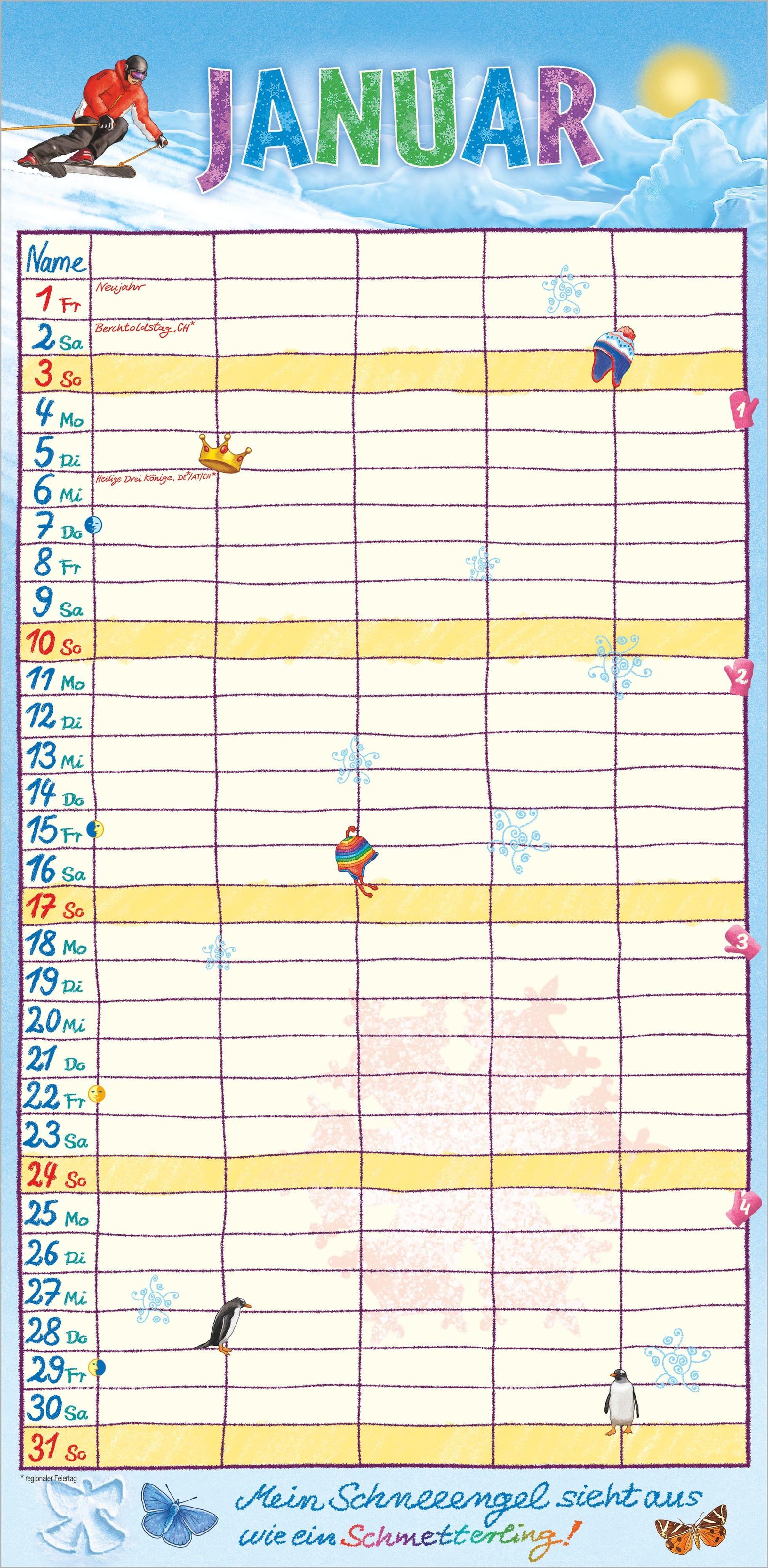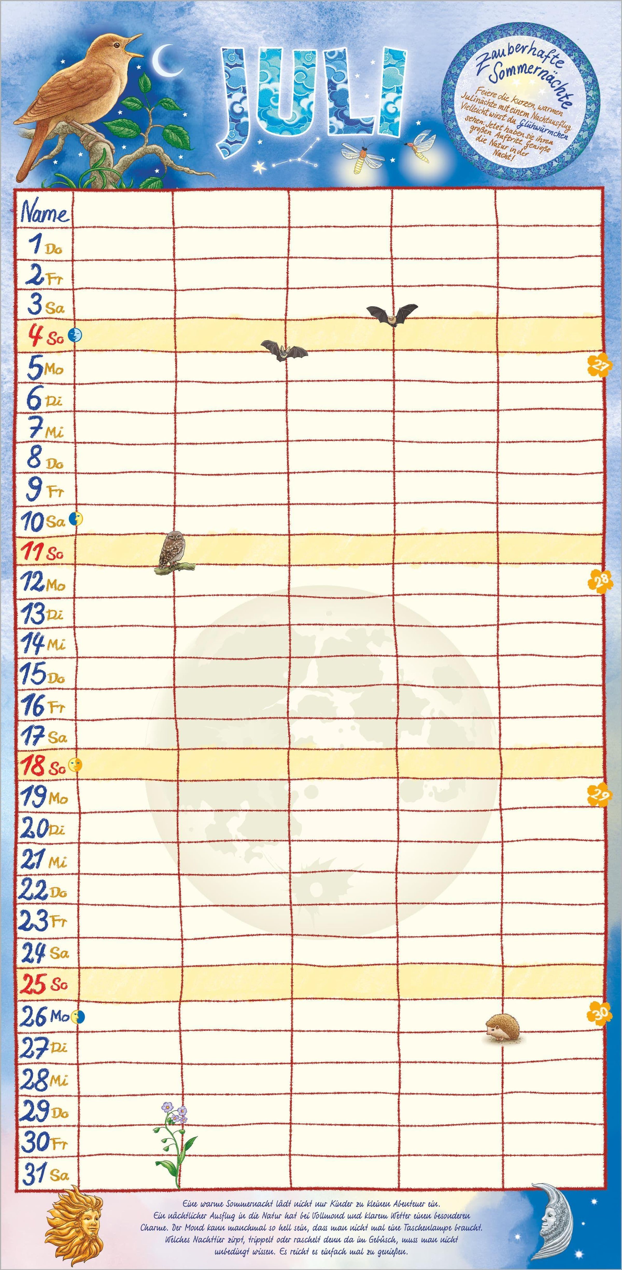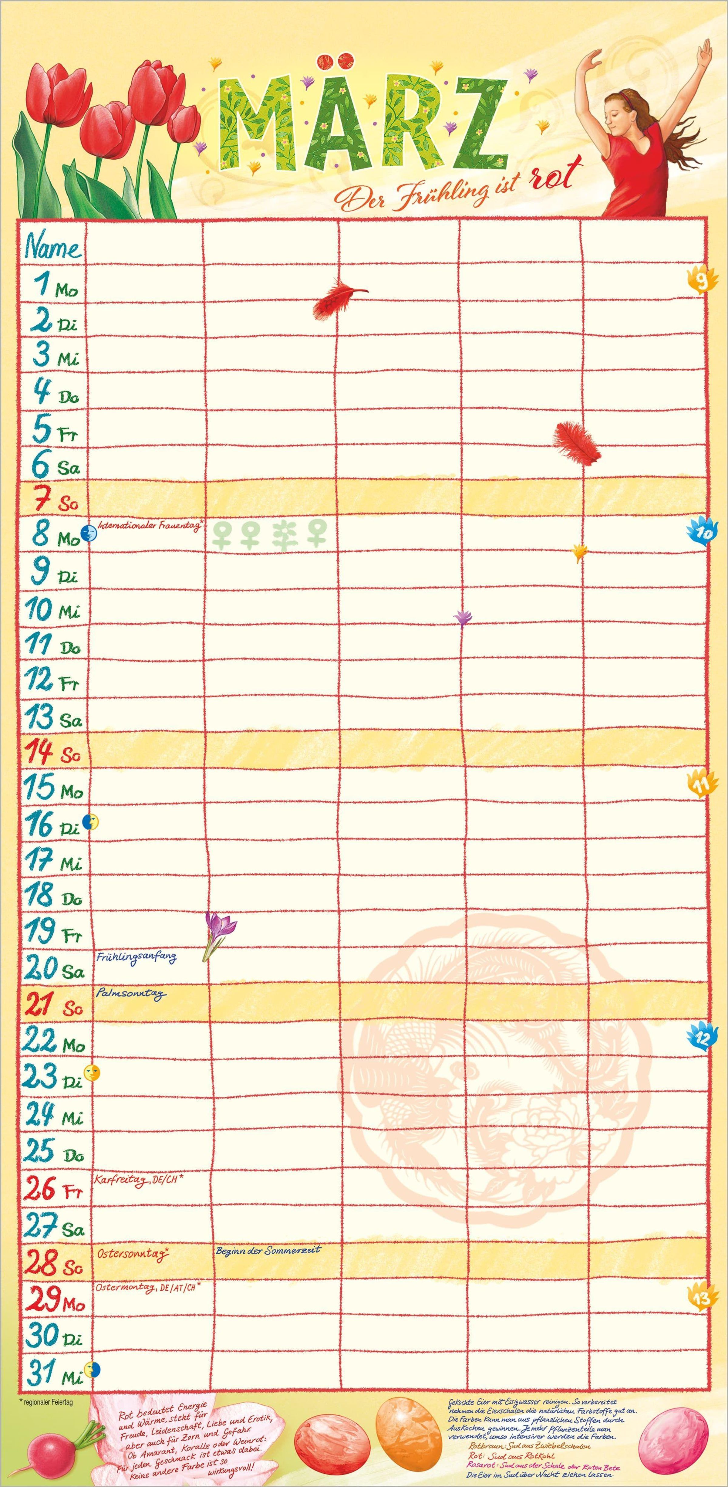 Das große Format von 22 x 45 cm bietet ausreichend Platz für Termine, Geburtstage, Arztbesuche oder Familienausflüge. Passend zur Jahreszeit und zu besonderen Festen sorgt der Illustrator Frank Bayer mit seinen farbenfrohen, stimmungsvollen Bildern Monat für Monat für gute Laune. Das deutschsprachige Kalendarium enthält alle Feiertage für Deutschland, Österreich, die Schweiz, Frankreich und Italien -- inklusive Ferientermine für eine perfekte Planung.