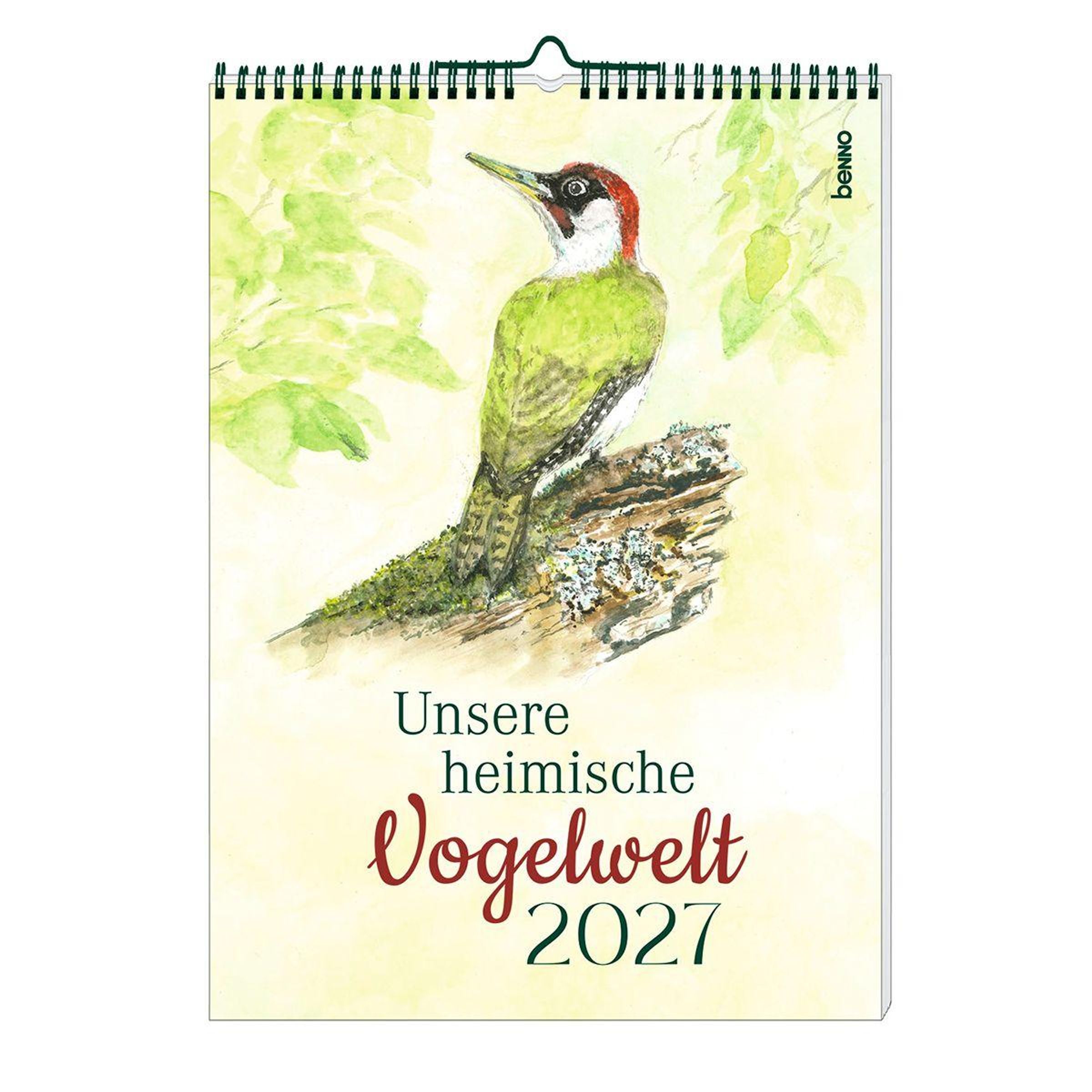 „Unsere heimische Vogelwelt 2027“. Illustration eines grünen Spechts auf einem Ast, umgeben von grünen Blättern., Kalender