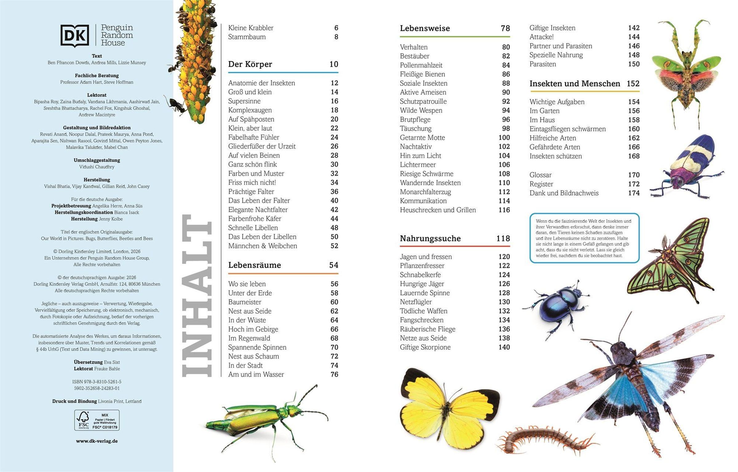 Dieses große Wissensbuch nimmtKinder ab 8 Jahren mit auf eine bildgewaltige Reise zu Insekten und anderen faszinierenden wirbellosen Tieren rund um den Globus. In1.000 Bildern lernen Grundschulkinder Bienen, Schmetterlinge, Spinnen, Skorpione und viele weitere Gliederfüßer in ihren Lebensräumen kennen. AufwendigePanoramabilder, Fotocollagen und Grafiken vermitteln interessante Fakten. Was ist Metamorphose? Wie tarnt sich die Gottesanbeterin? Und wie funktioniert ein Bienenstaat? Atemberaubende Fotos zeigen Facettenaugen, zarte Libellenflügel und stachelige Krebse hautnah, kurze Texte erklären alles Wissenswerte kompakt und leicht verständlich. Ein einzigartiges Kinder-Sachbuch , das den Biologieunterricht in der Grundschule erst so richtig spannend macht.