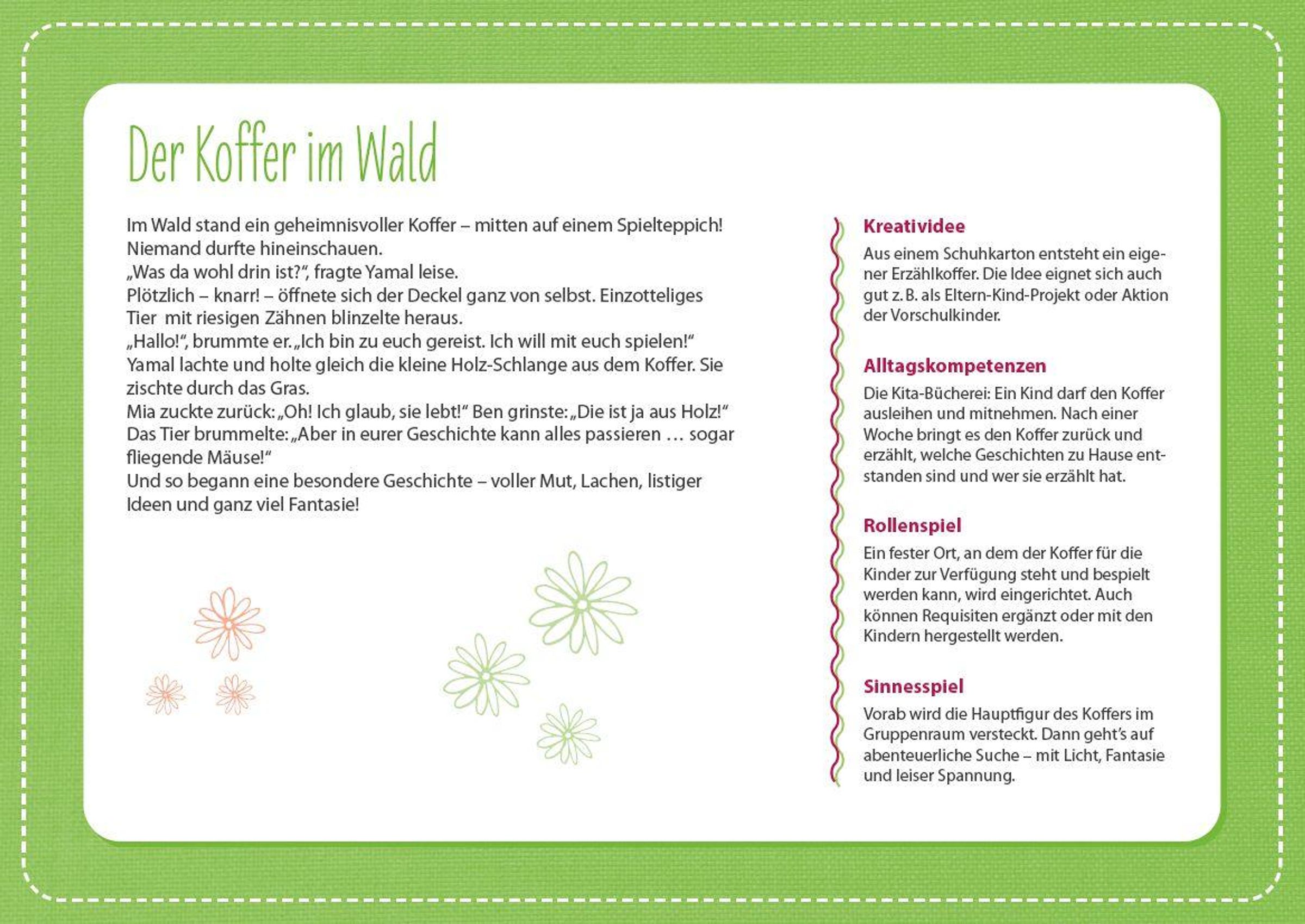 Kinder sind geborene Geschichtenerzähler: innen Dieses Kartenset ist weit mehr als ein Material zur Sprachförderung in der Kita - es ist ein Türöffner für Beziehung, Bildung und Fantasie! Die 32 liebevoll gestalteten Methodenkarten bieten vielfältige, praxiserprobte Erzählideen, die Kinder zum Zuhören, Mitmachen und Weitererzählen anregen. Ob Wickelgeschichten, Beutelgeschichten, Erzählkisten oder Erzählkoffer - die Karten liefern kreative Impulse, die sich ganz einfach in den Kita-Alltag integrieren lassen. Im Morgenkreis, in Kleingruppen oder ganz spontan zwischendurch: Die Erzählkarten laden jederzeit zum gemeinsamen Erleben, Fühlen und Wachsen ein.