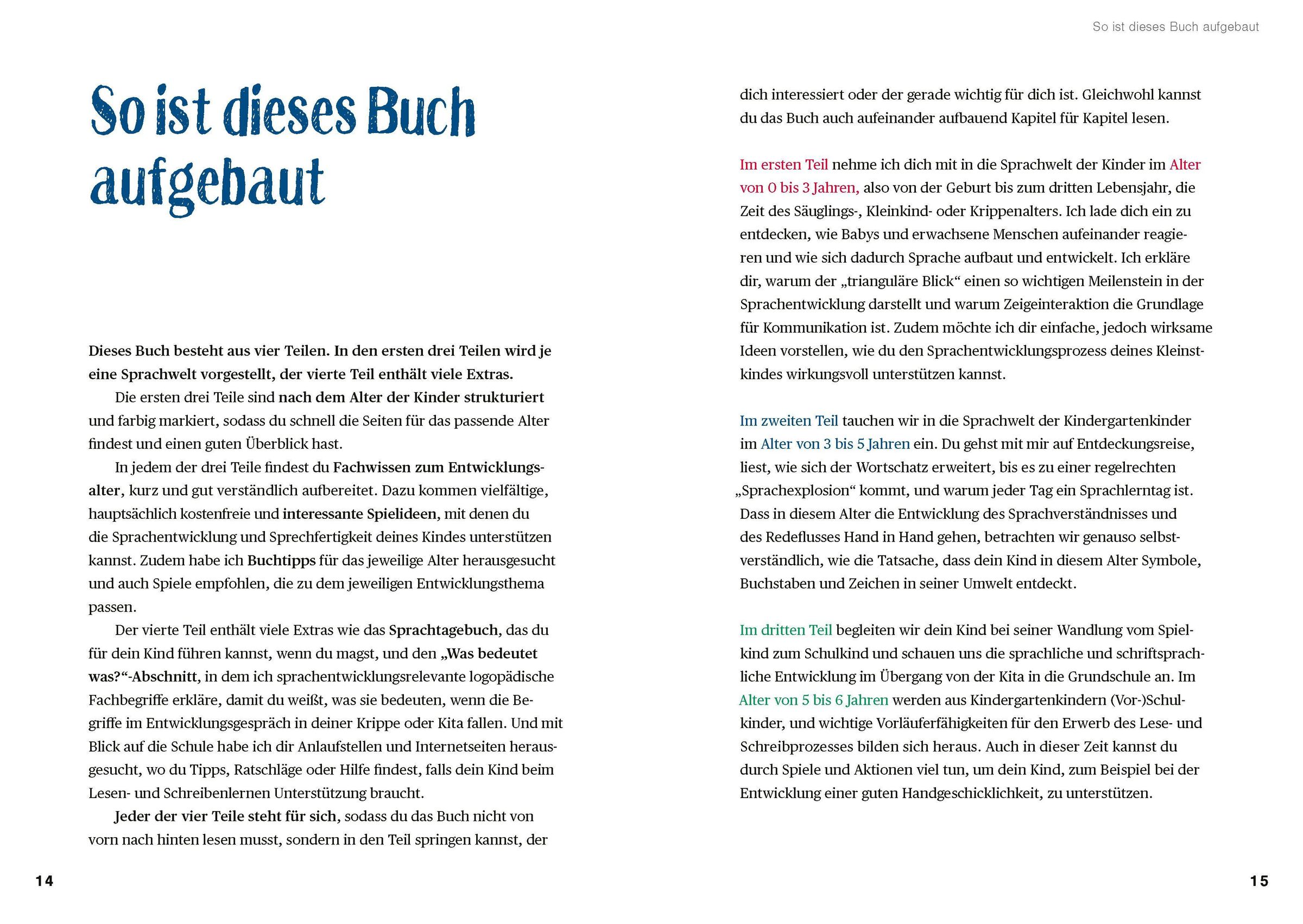 Das Buch, das den Spracherwerb und die sprachliche Entwicklung des Kindes spielerisch fördert. Ohne große Vorbereitung ganz leicht. Für Eltern, die Ihre Kinder von Geburt an bis zum 6. Lebensjahr auf dem Weg ihrer Sprachentwicklung unterstützen möchten. Die Autorin erklärt verständlich und anschaulich, welche Entwicklungsschritte das eigene Kind in diesen Jahren durchläuft. Sie bietet gleich dazu passende und altersgerechte Spiele sowie Aktivitäten an, die Eltern mit ihren Kindern zu Hause machen können.