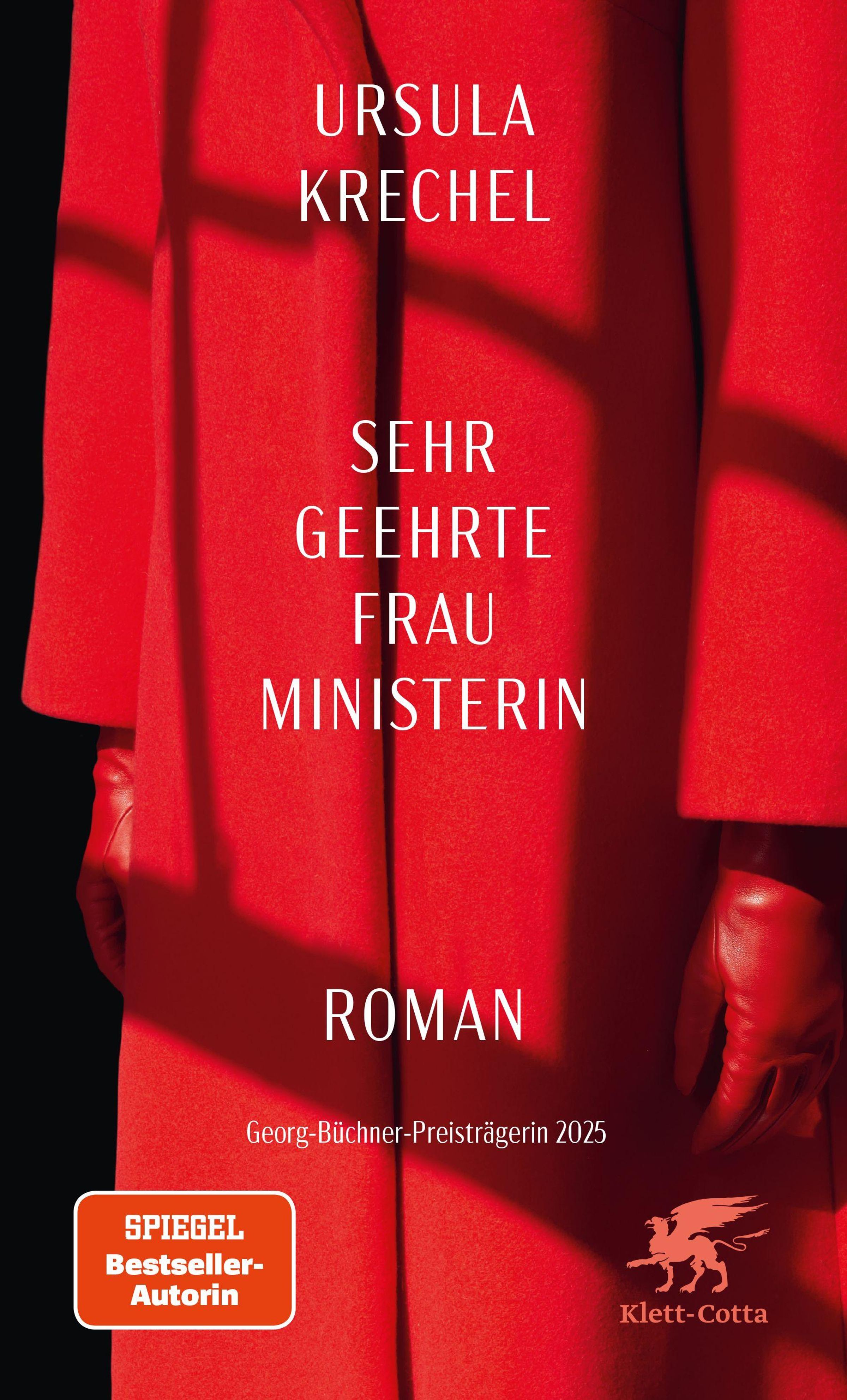 "Ursula Krechel, Sehr geehrte Frau Ministerin, Roman, Georg-Büchner-Preisträgerin 2025" auf rotem Hintergrund, links ein Logo., Buch