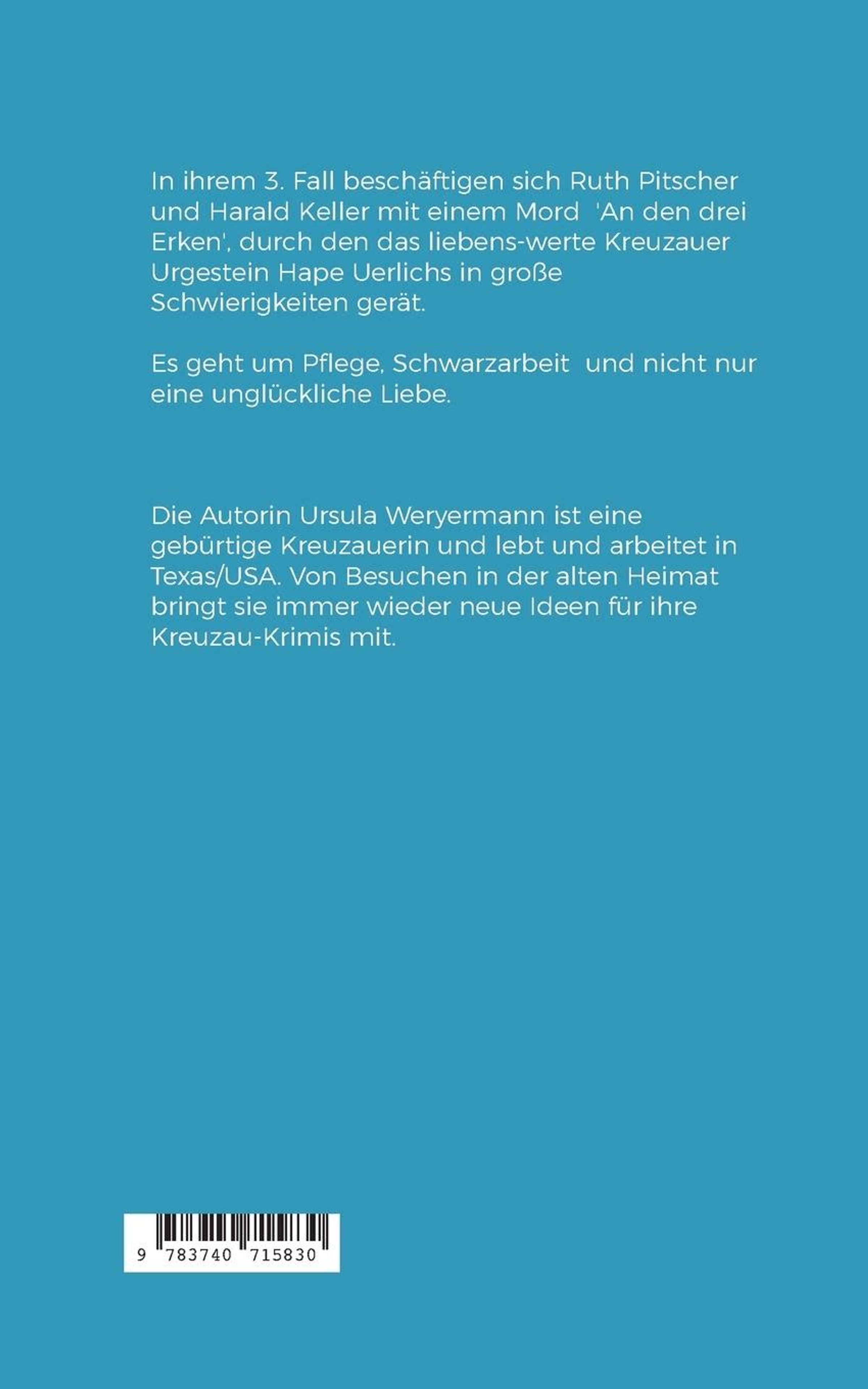 In ihrem 3. Fall beschäftigen sich Ruth Pitscher und Harald Keller mit einem Mord 'An den drei Erken', durch den Hape Uerlichs in große Schwierigkeiten gerät. Es geht um Pflege, Schwarzarbeit und unglückliche Liebe.